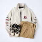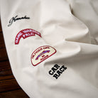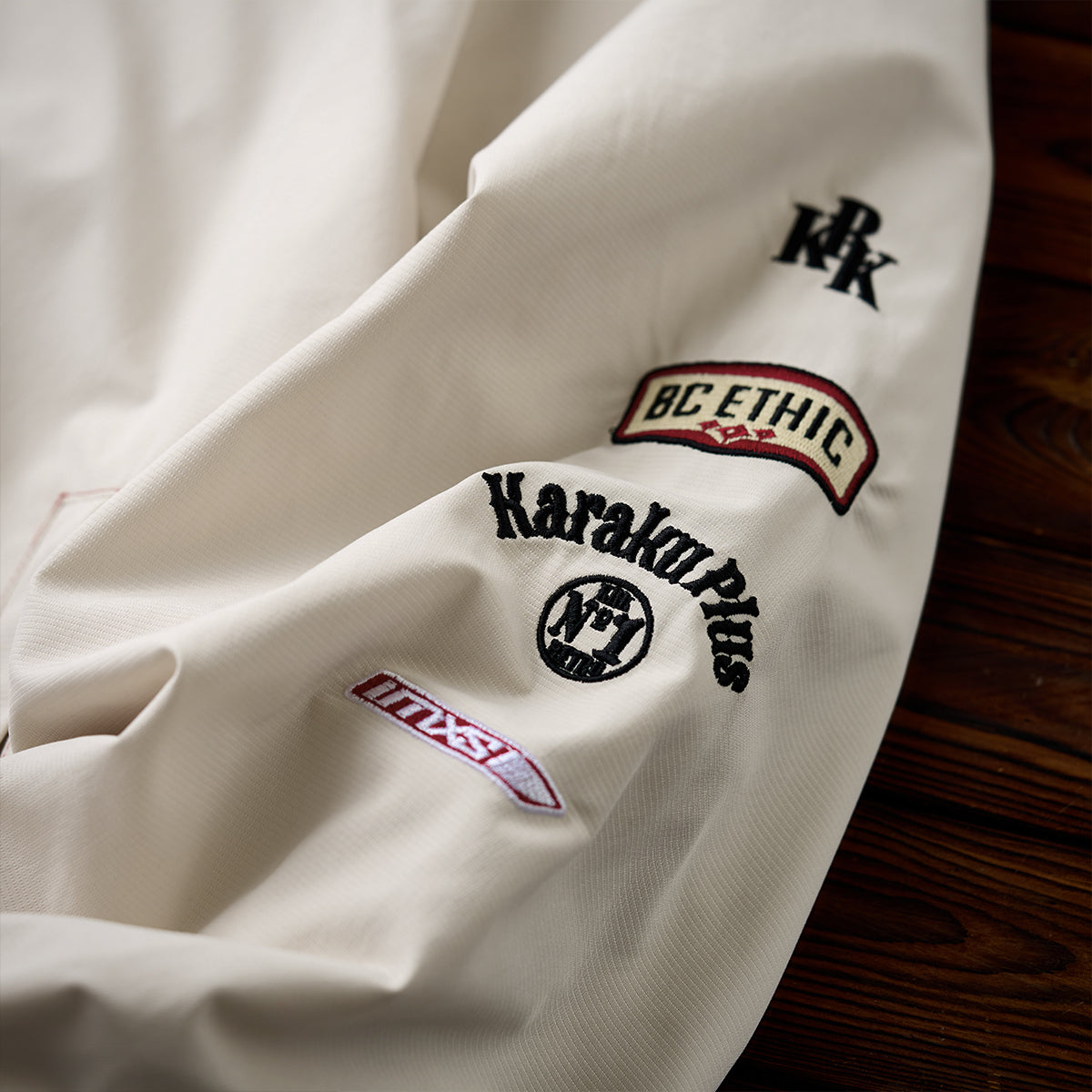 袖に刺繍やワッペンを多用しながらも、全体のトーンを統一することで派手すぎない仕上がり、レーシング要素と、ストリートブランド風のロゴを組み合わせた。