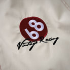 左胸部分に赤い丸の中に「68」の数字が白字で配置、1960年代後半のレーシングカルチャーを象徴する。その下に「Vintage Racing」と筆記体で刺繍されて、クラシックなレースカルチャーを彷彿とさせる。