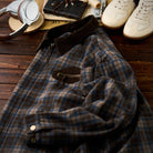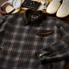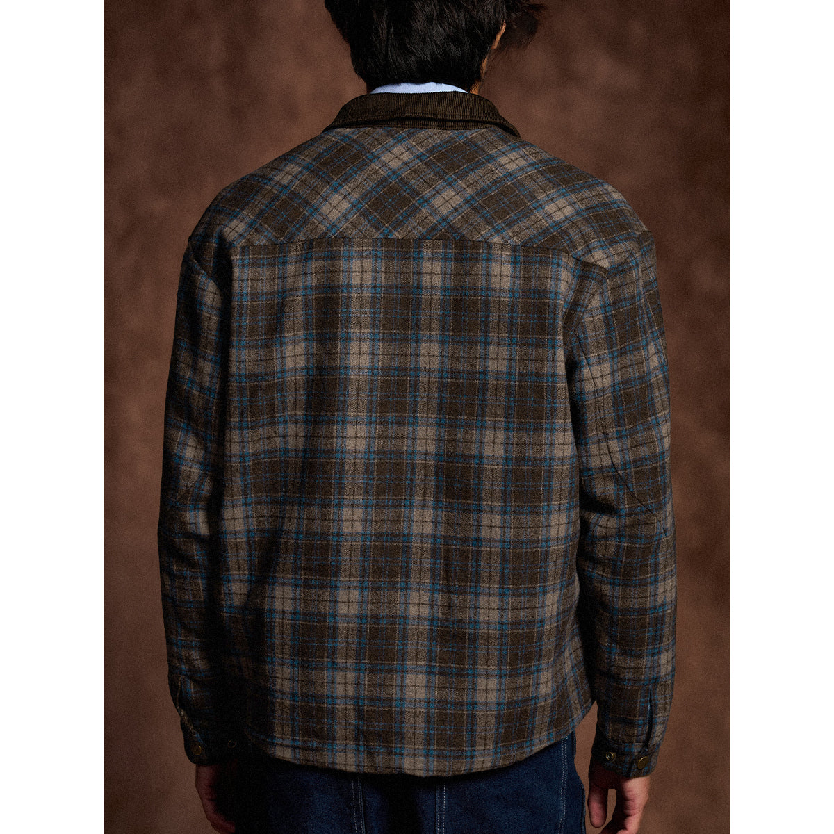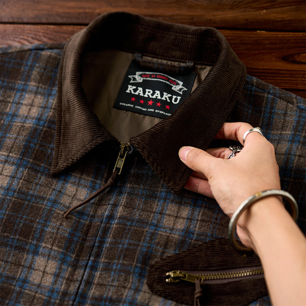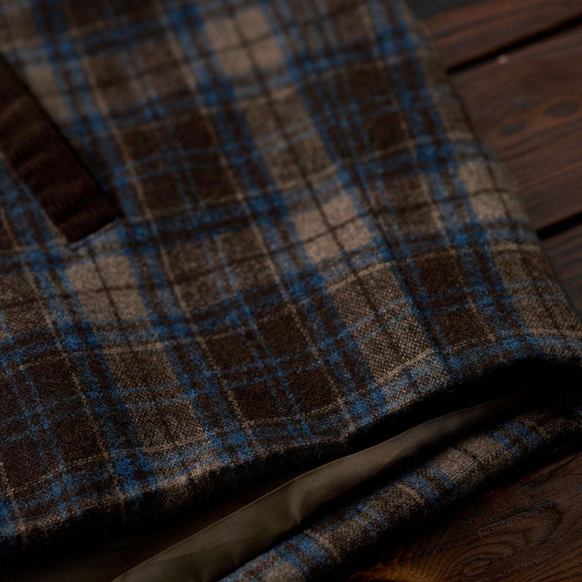 チェック柄部分にはウールとポリエステルのツイード生地を使用し、保温性と軽やかさを両立。随所に施されたコーデュロイ切替はコットン生地で、温もりある風合いと耐久性をプラスしています。