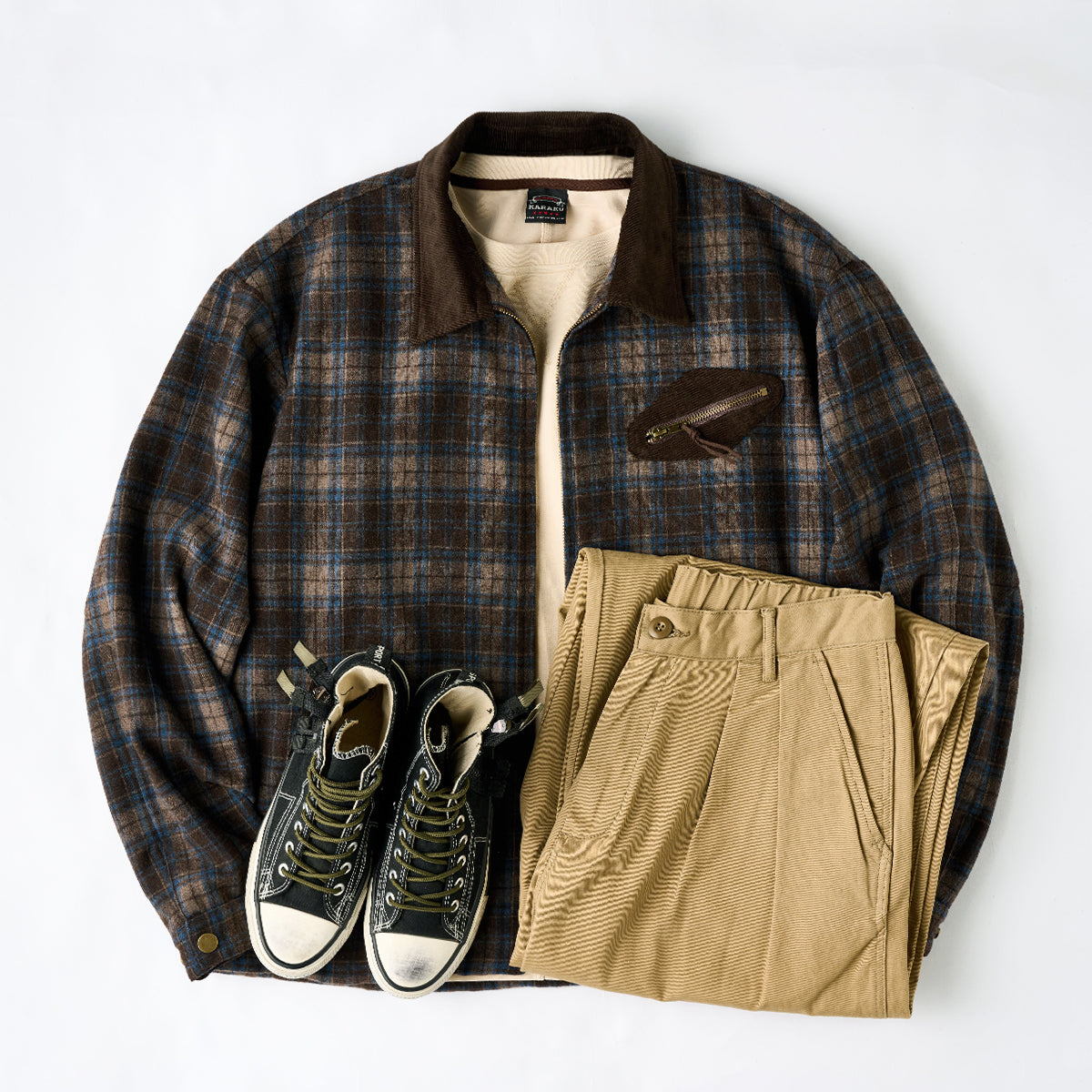 無骨なワークウェアをルーツに持つデトロイトジャケットを、ウール混ツイードのチェック柄でアップデート。温かみのある表情に、随所にあしらったコーデュロイ切替がヴィンテージ感を漂わせます。程よくゆとりを持たせたシルエットはインナーとのレイヤードにも対応し、秋冬の幅広いスタイリングにマッチ。ワークのタフさとトラッドな上品さを兼ね備えた、シーズンライクな一着です。