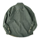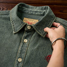 シャツ全体のステッチがしっかり見え、デニム特有のカジュアルかつ丈夫な雰囲気を強調。裾はラウンドカットで、タックインもタックアウトもしやすい。