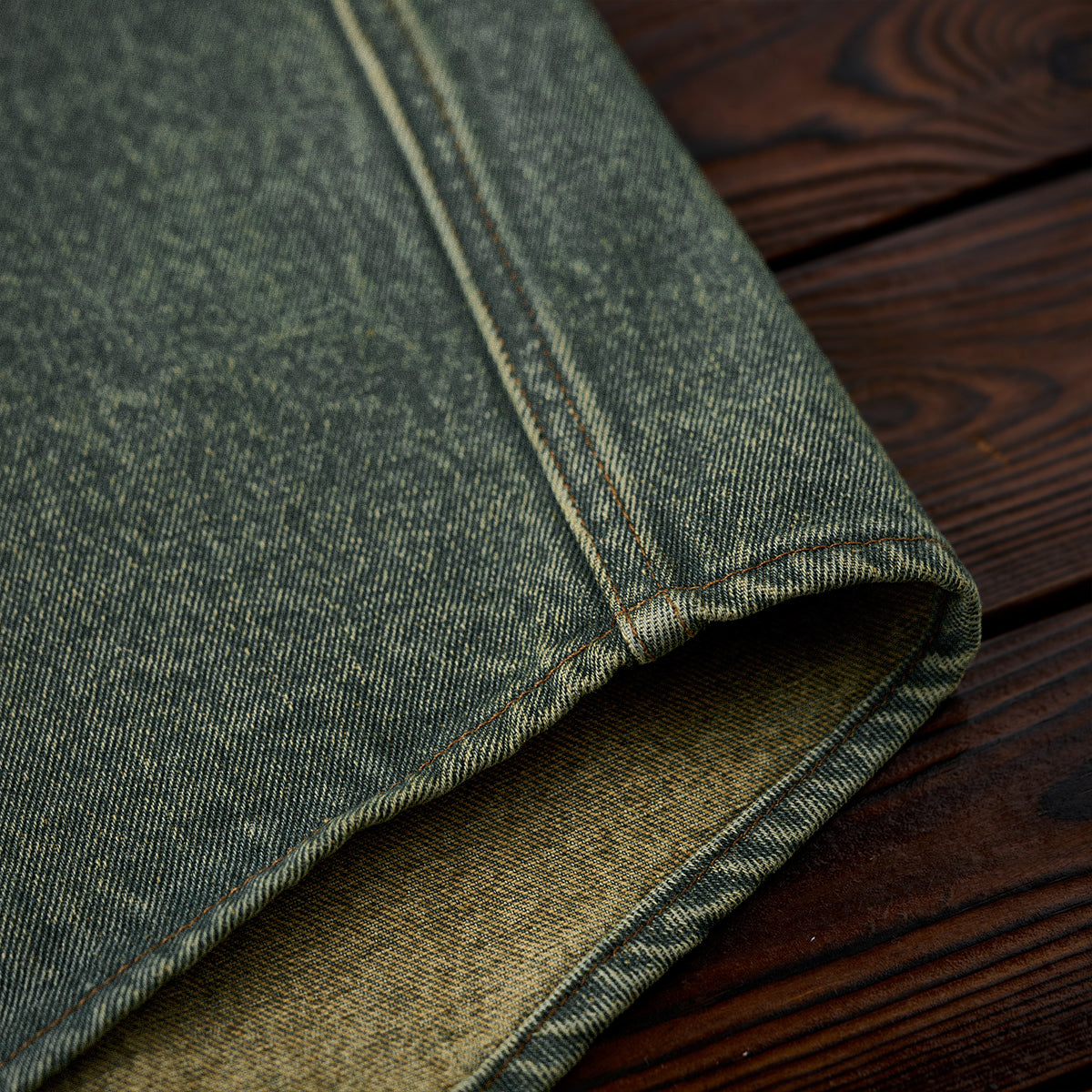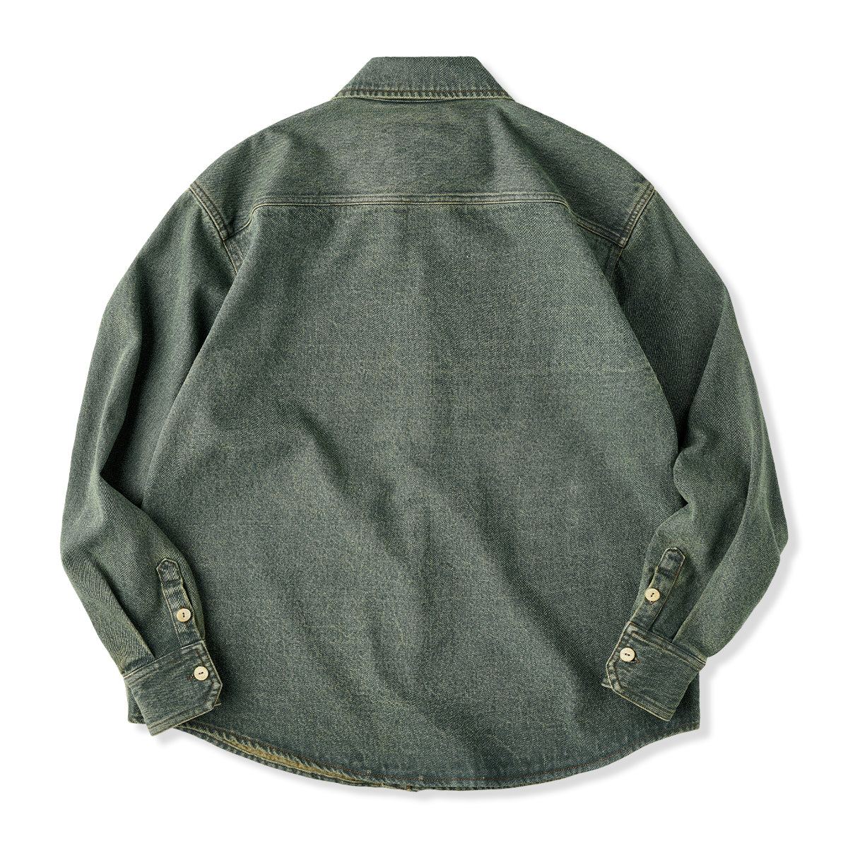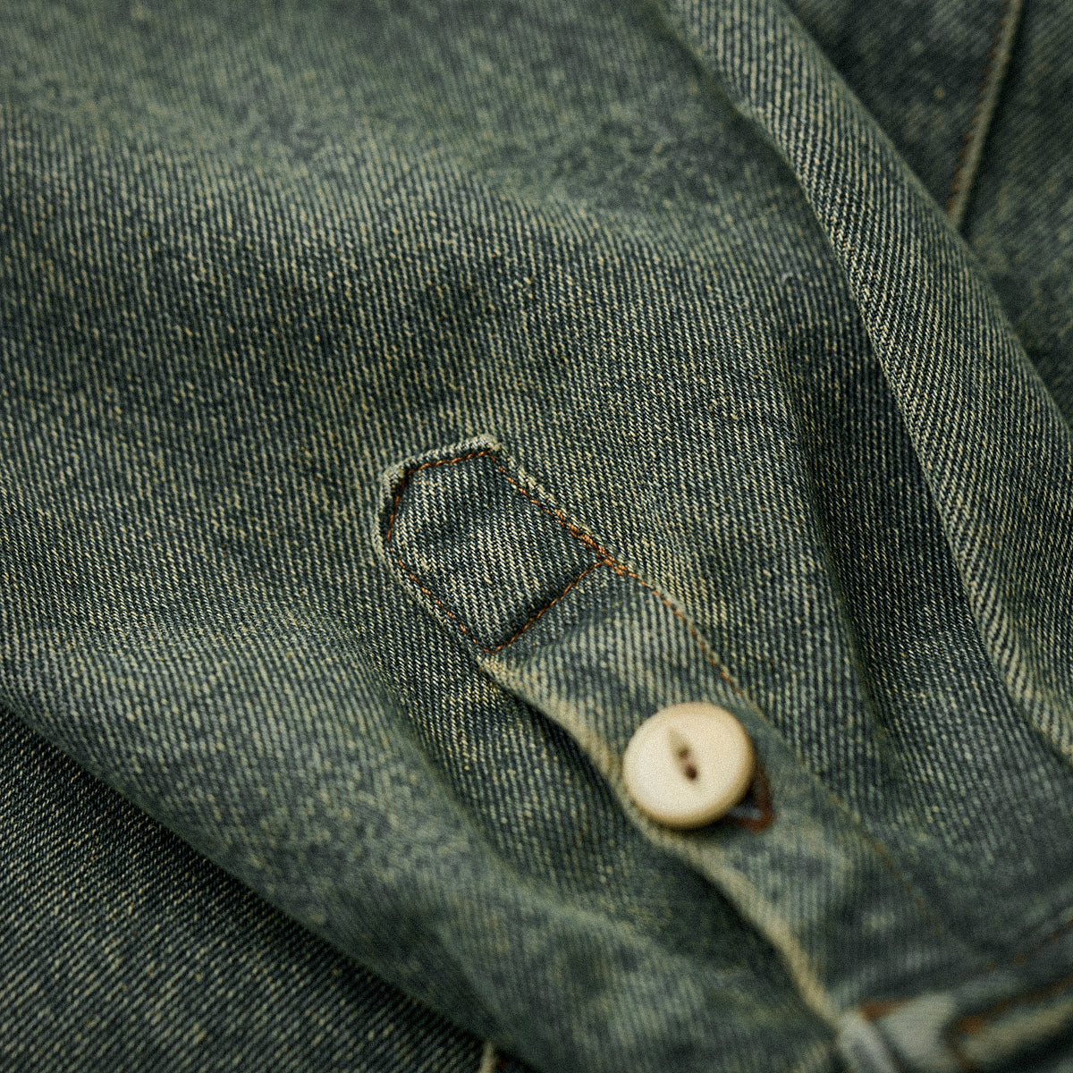 コットンデニム素材を使用し、厚すぎず薄すぎない適度なハリがあり、年間を通じて着用可能。ウォッシュ加工がされ、素材は自然の色落ちとユーズド感で現れ、ビンテージ感も満載。