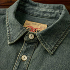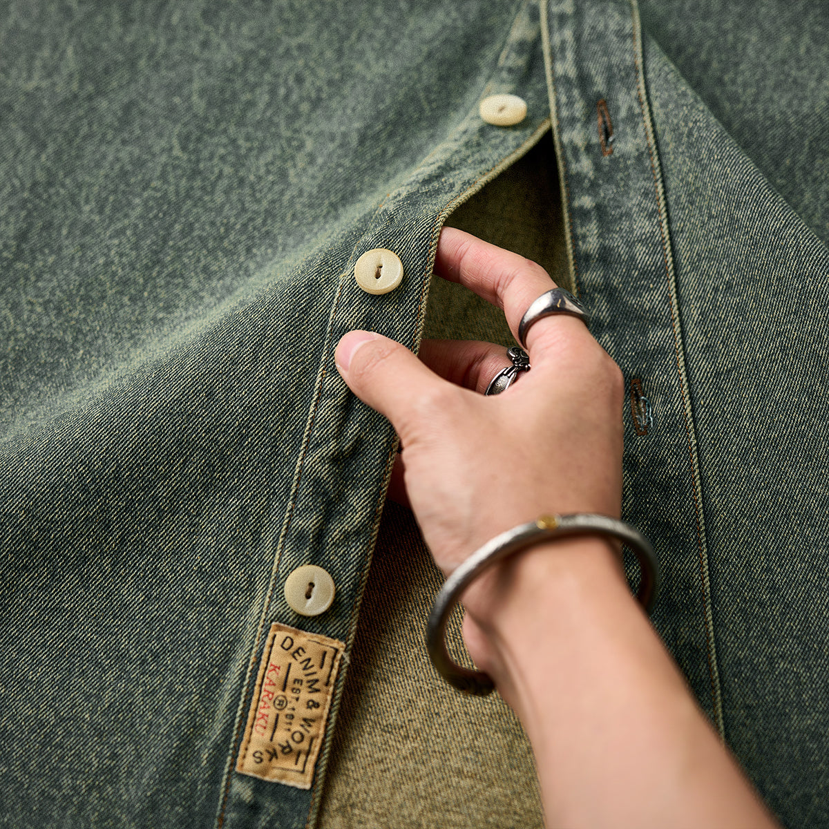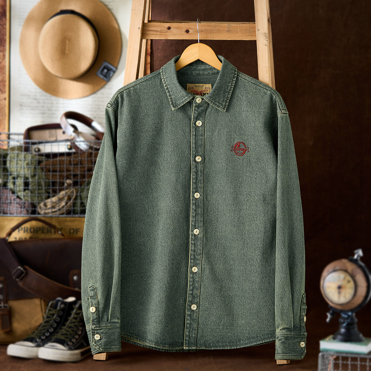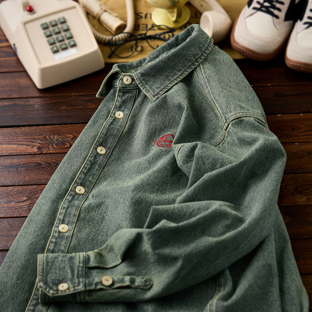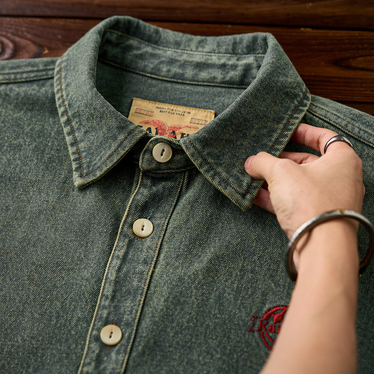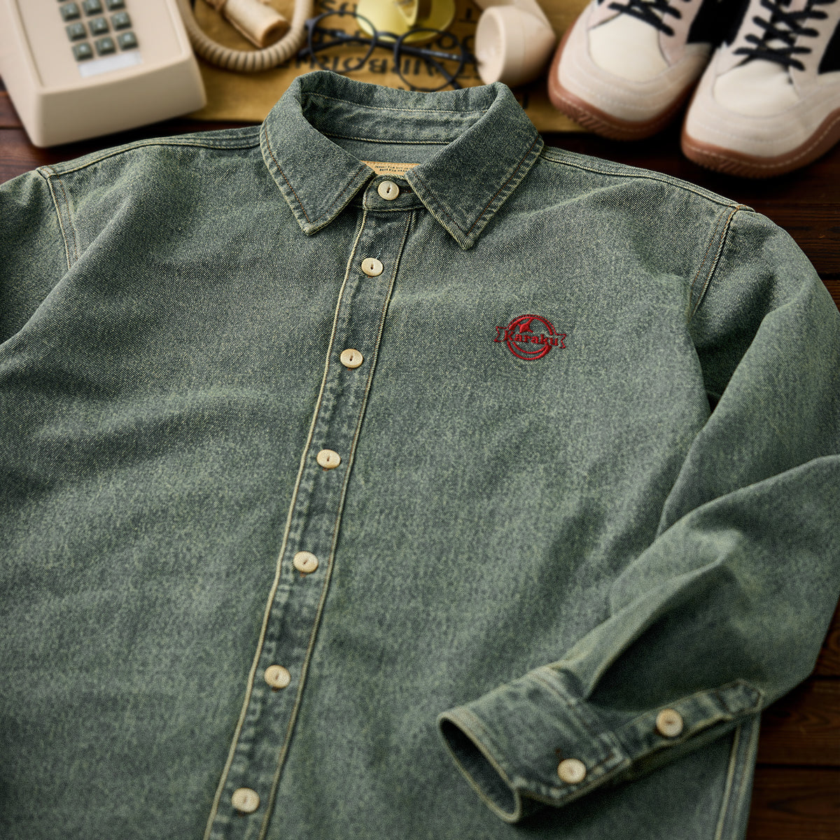 「KARAKU」ロゴ刺繍入り ウォッシュデニム長袖シャツ