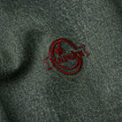 左胸元に「KARAKU」ロゴ刺繍が施されて、その上に円形のロゴマークが確認でき、刺繍には赤と白が使用され、デニムの青色とのコントラストが際立っています。
