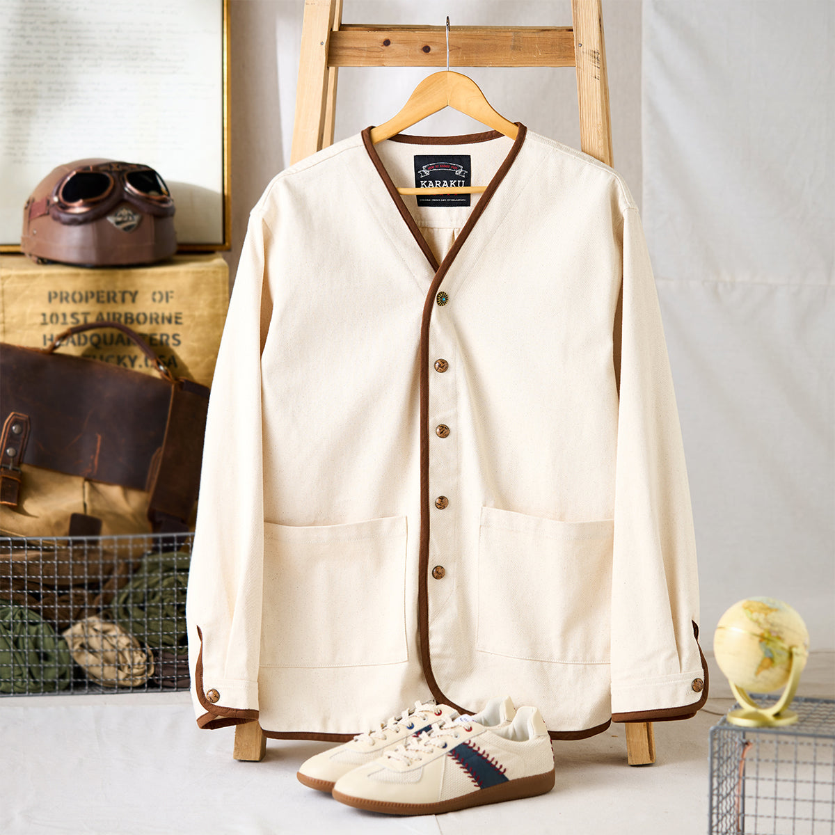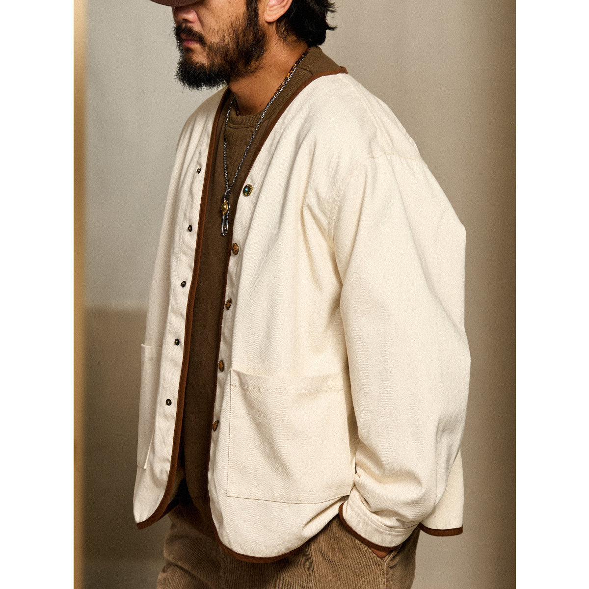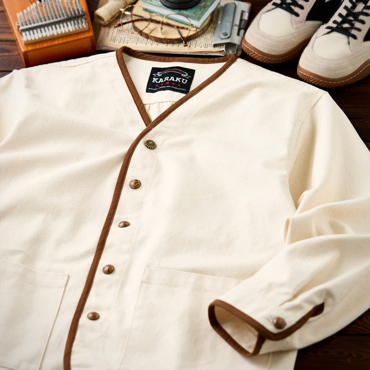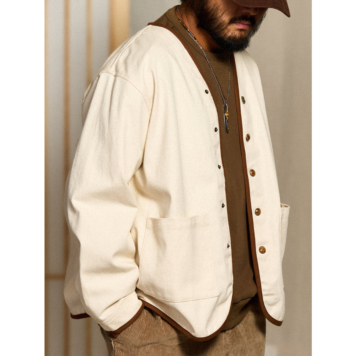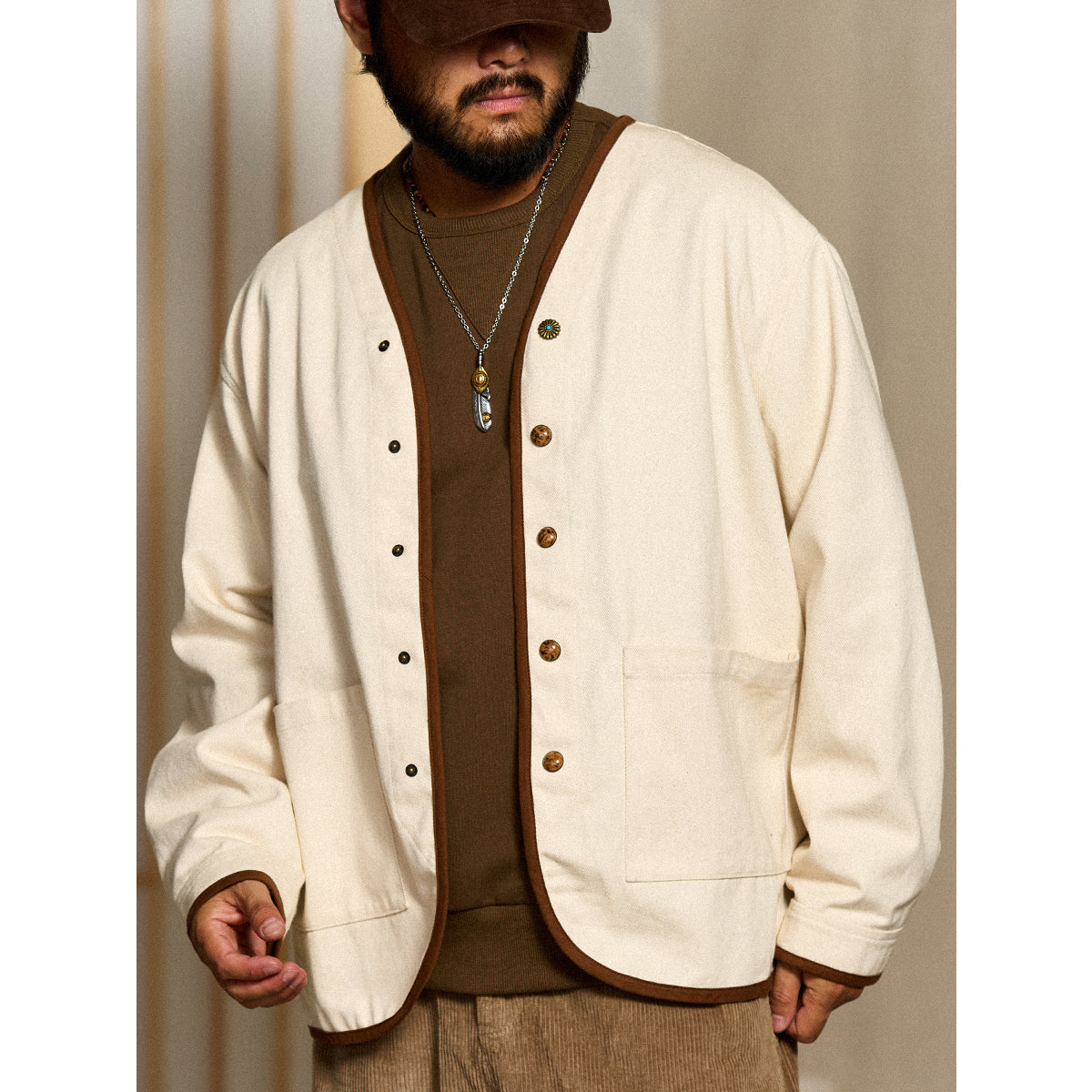 Vネックデザインは、インナーとのレイヤードスタイルを楽しむことができます。コーヒーのパイピングが全体のシルエットを引き締め、視覚的なアクセントとなっています。