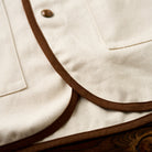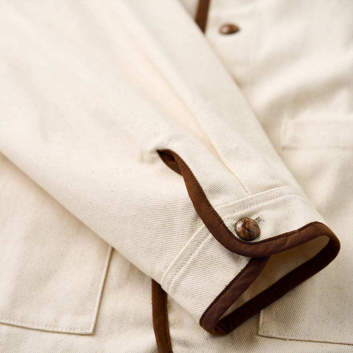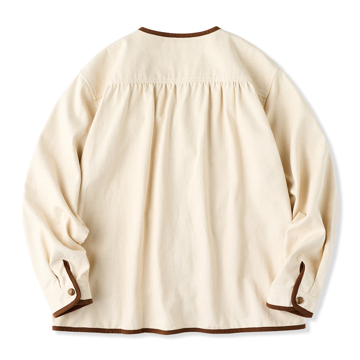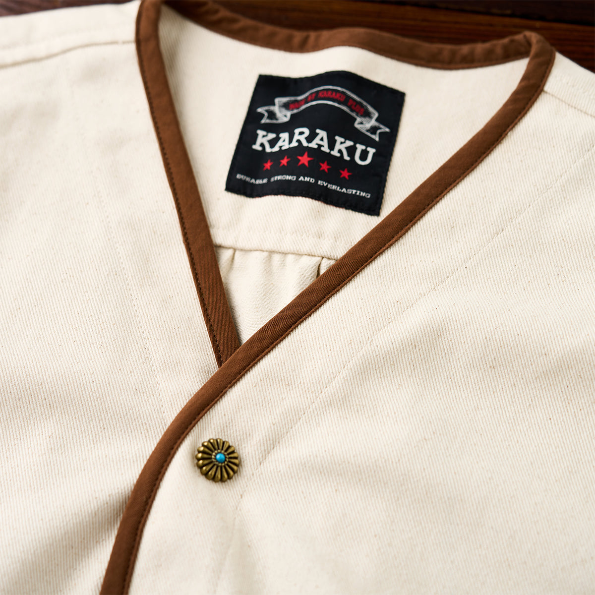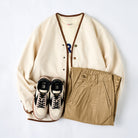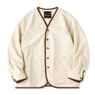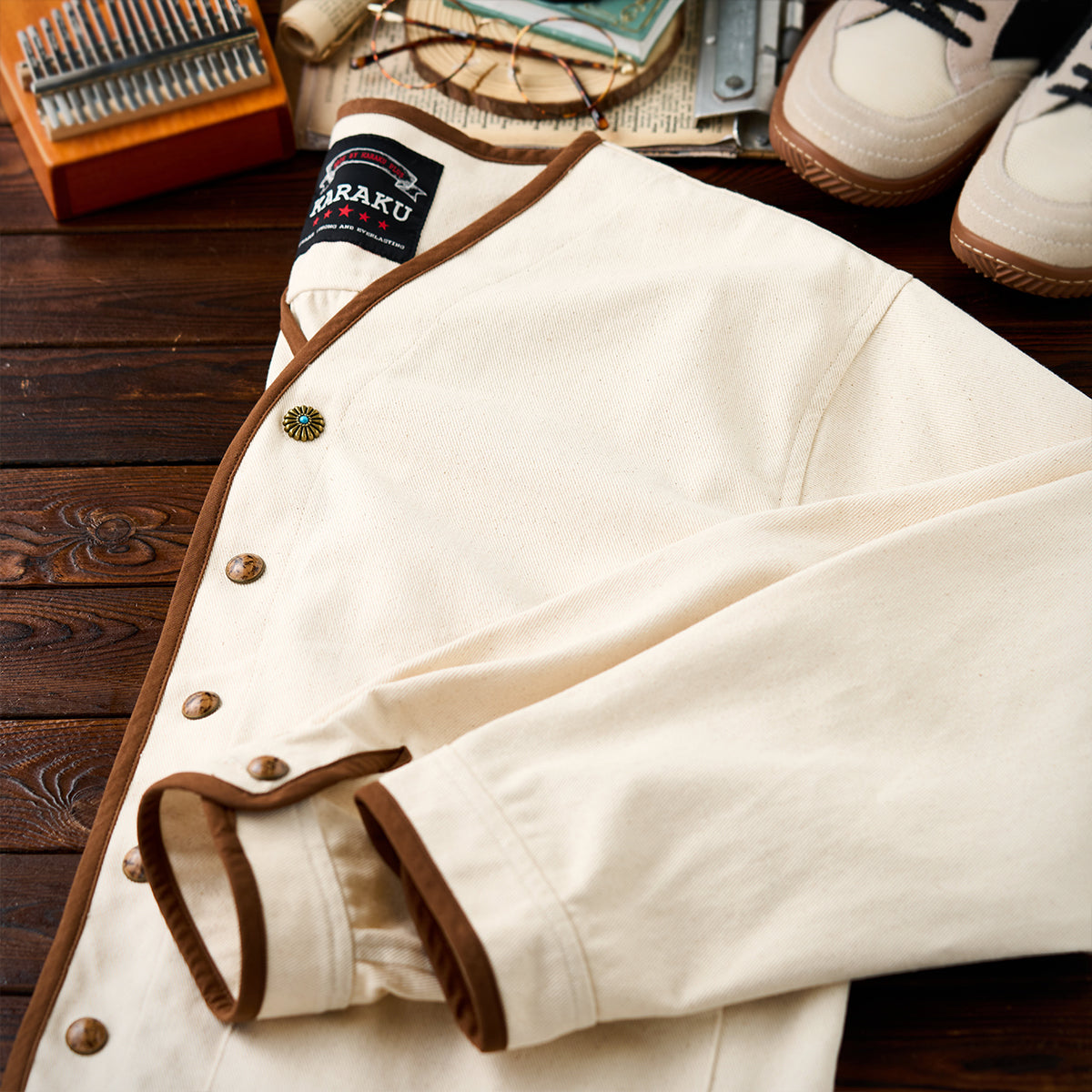 Vネックデザインは、インナーとのレイヤードスタイルを楽しむことができます。コーヒーのパイピングが全体のシルエットを引き締め、視覚的なアクセントとなっています。