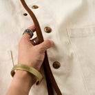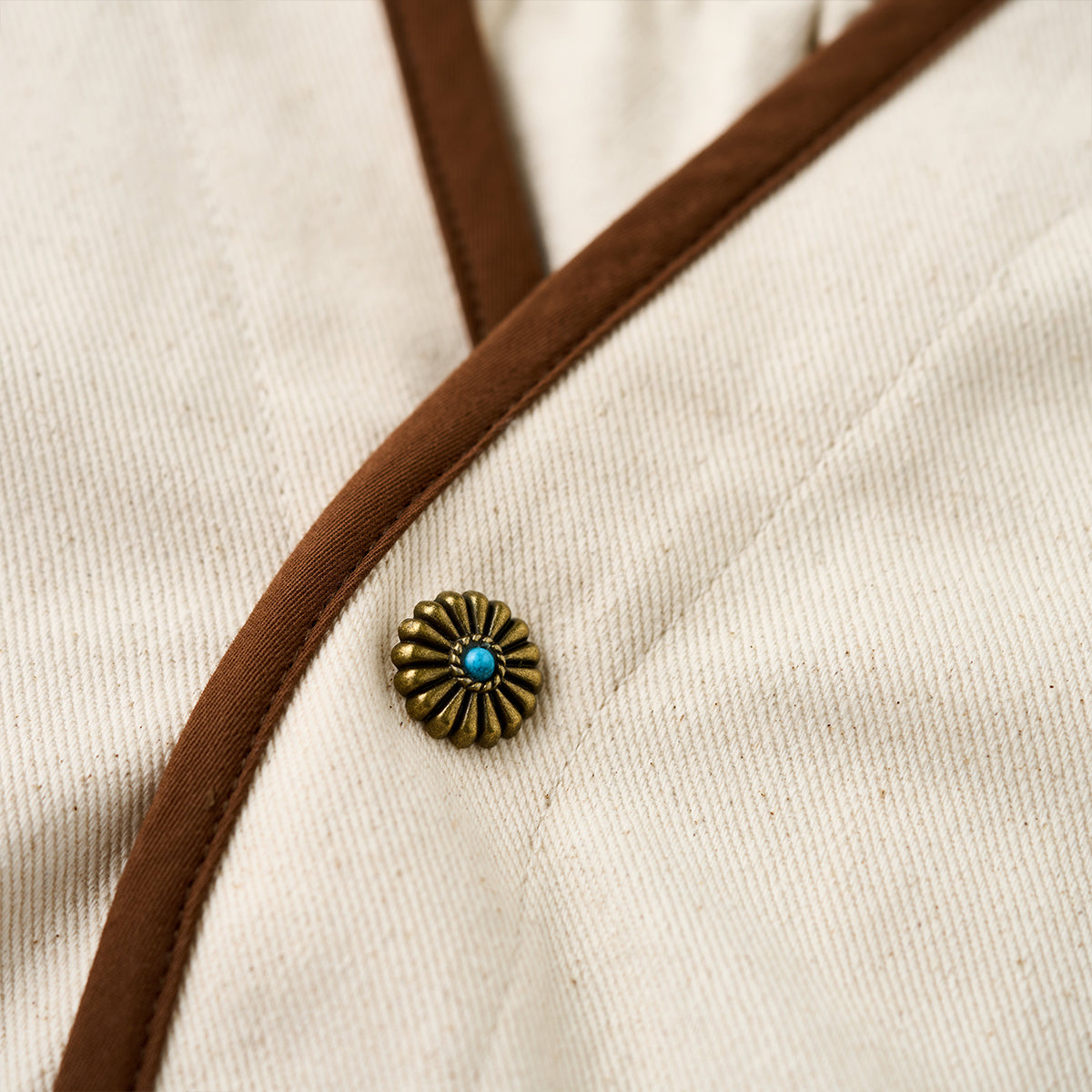 ボタンは石調でナチュラルな雰囲気を強調しています。特に最上部の花型ボタンはデザインのポイントで、ターコイズ風の石が埋め込まれており、細部へのこだわりが感じられます。