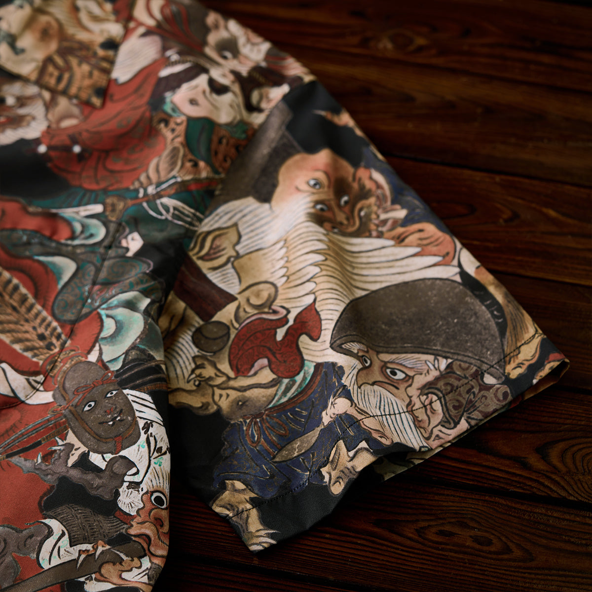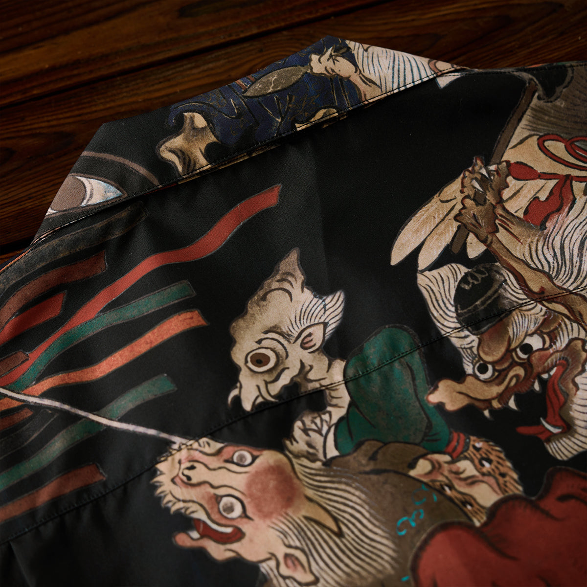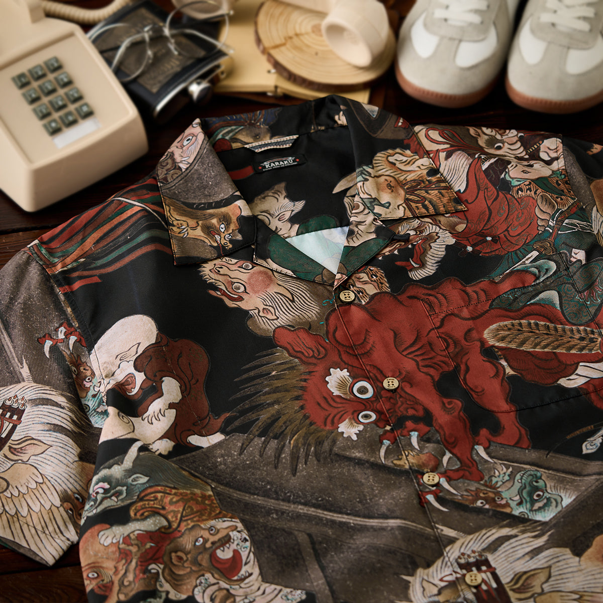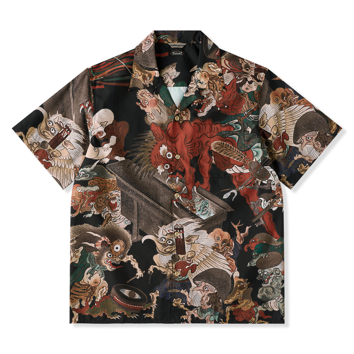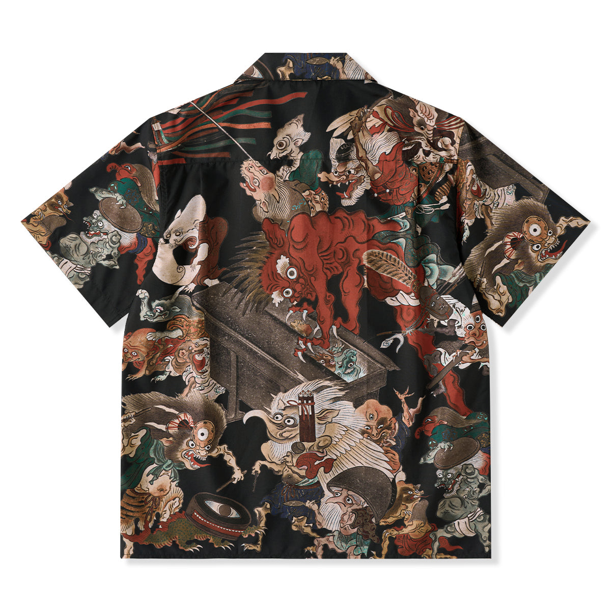 室町時代「妖怪絵巻」浮世絵総柄オープンカラーシャツ