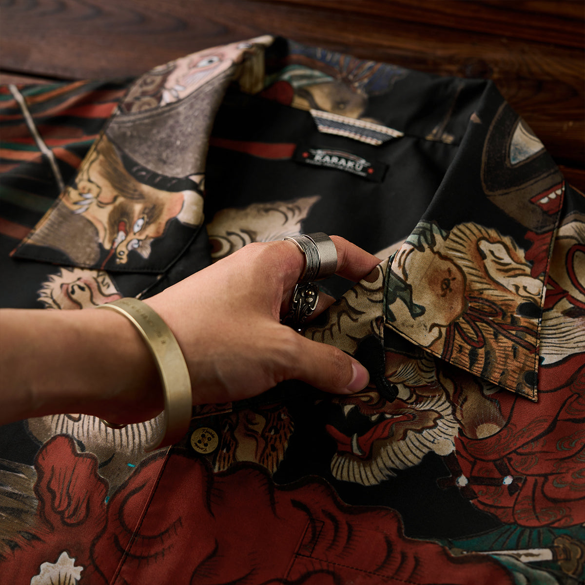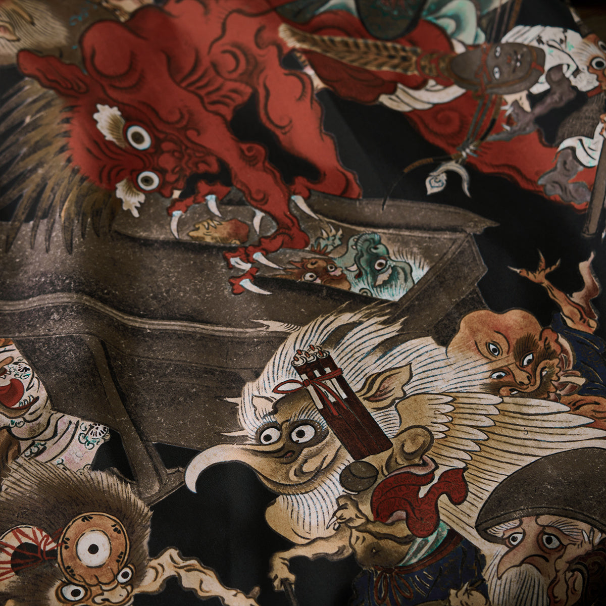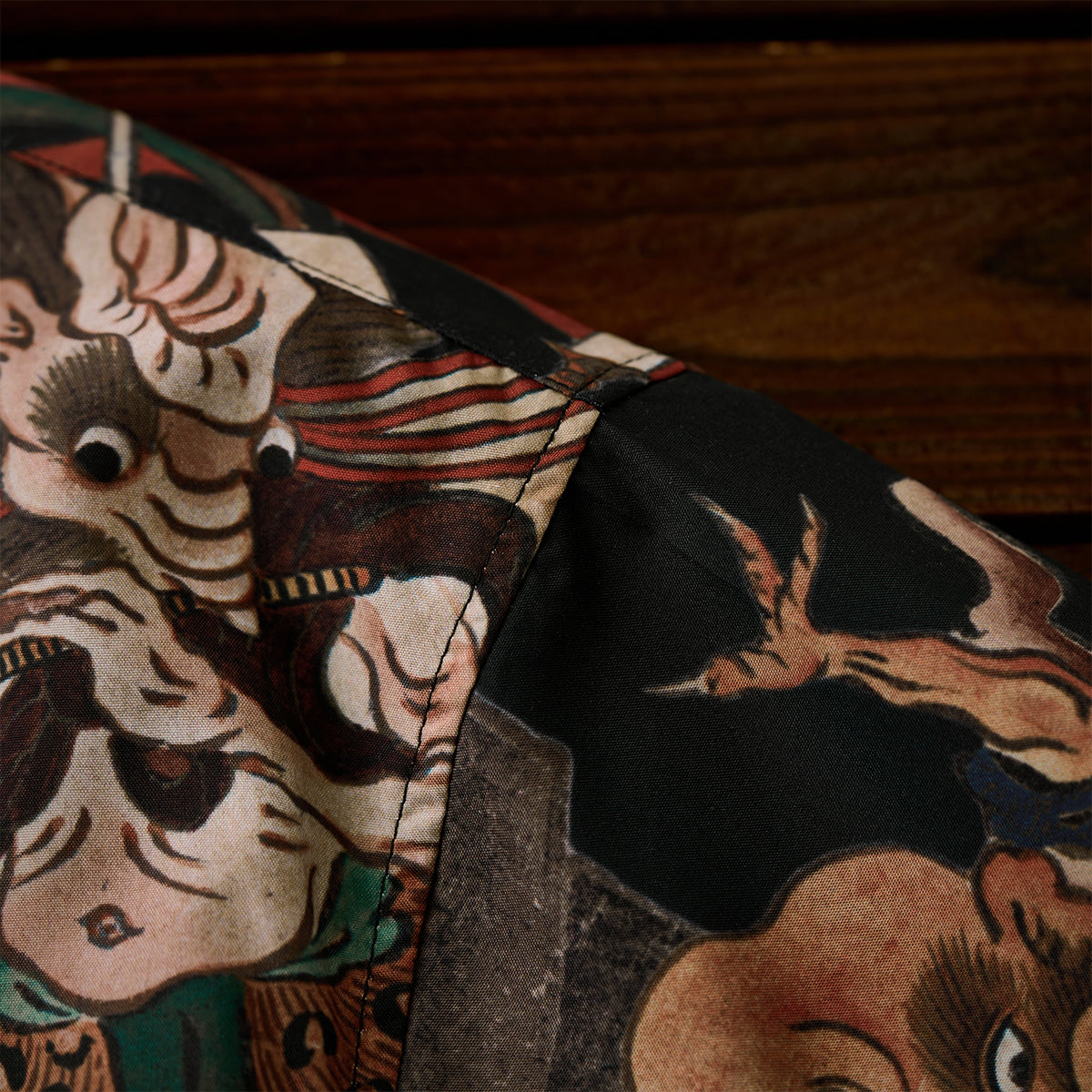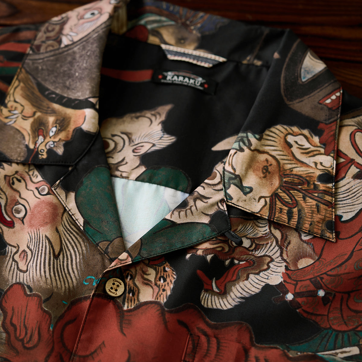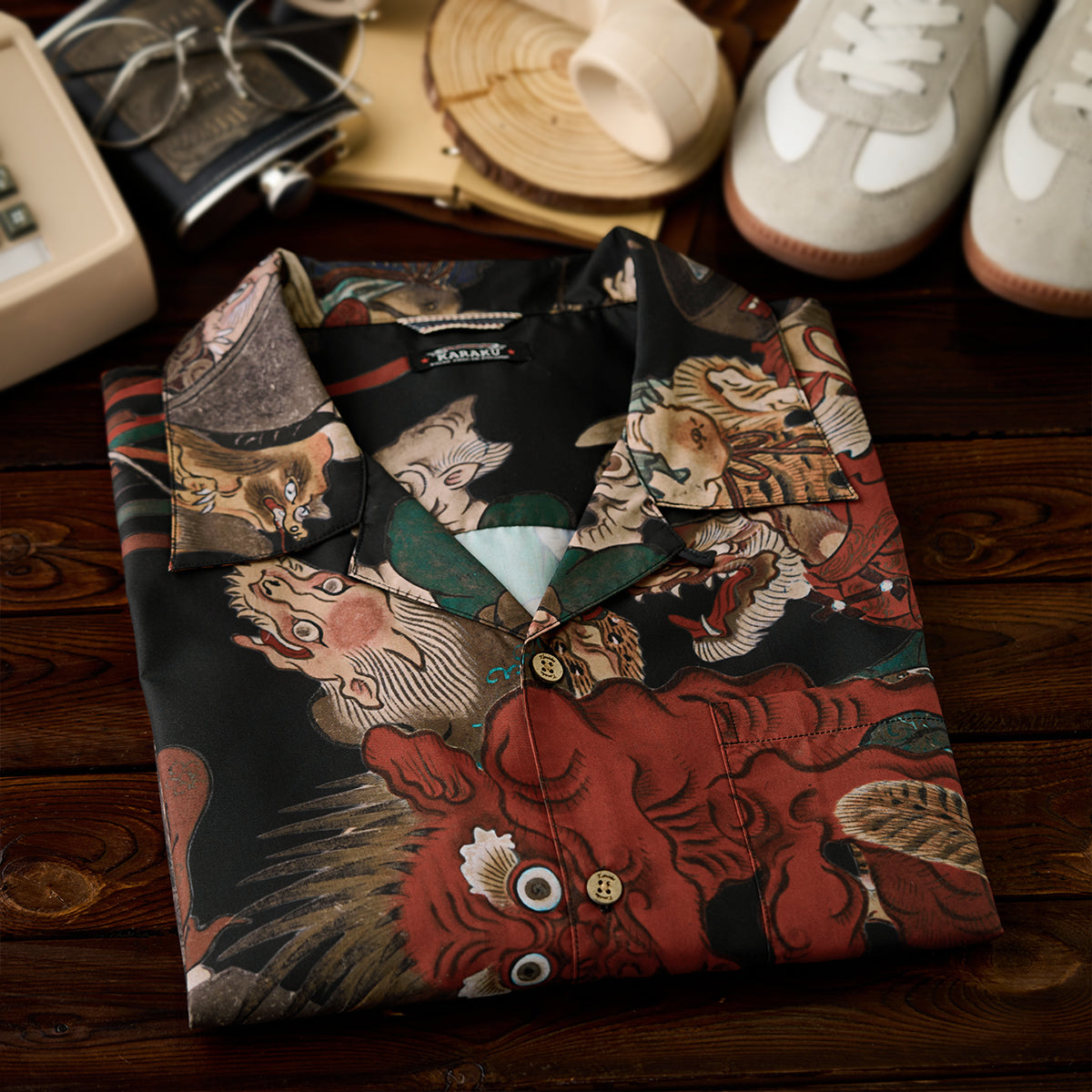 室町時代「妖怪絵巻」浮世絵総柄オープンカラーシャツ