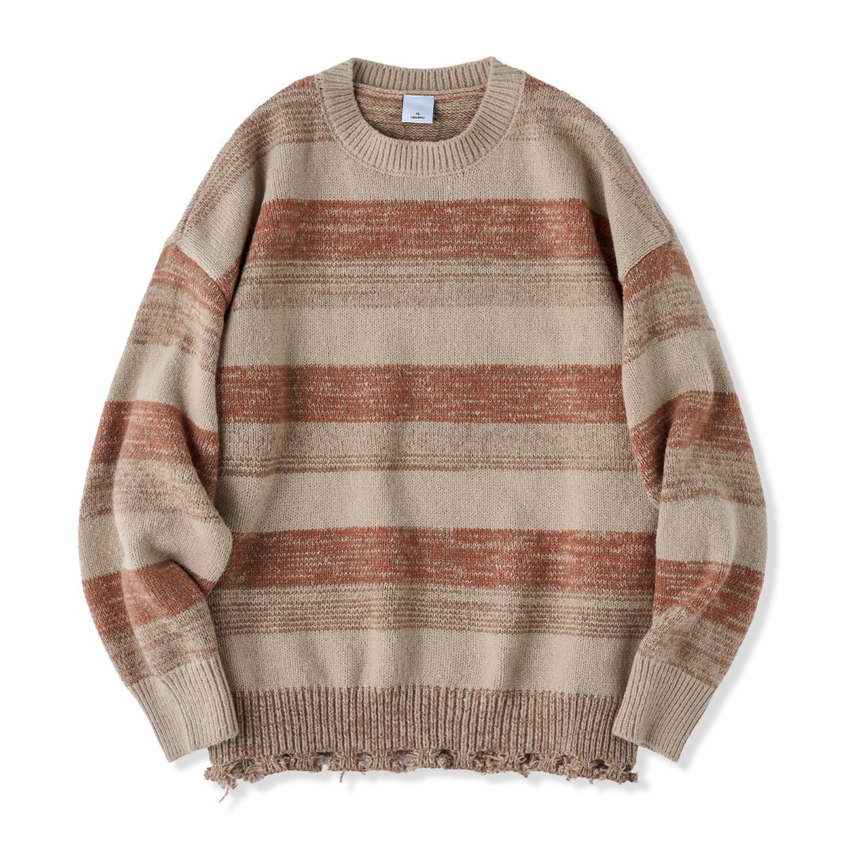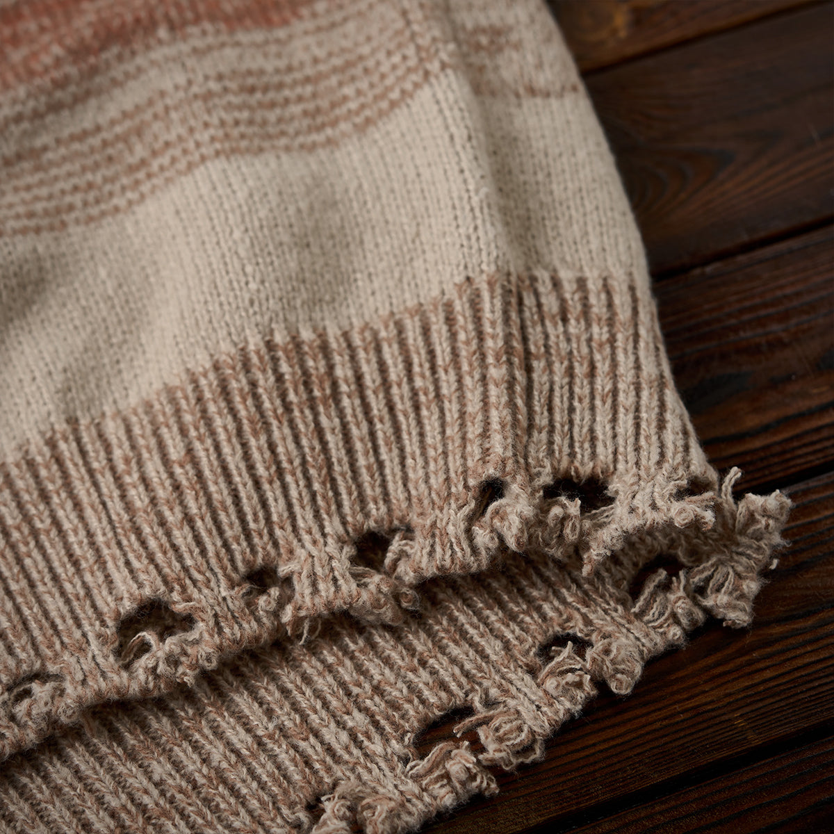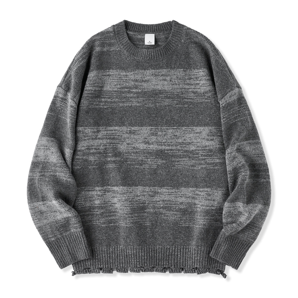 裾ダメージ加工 マルチボーダー柄クルーネックニットセーター