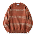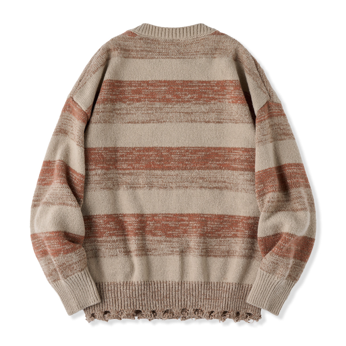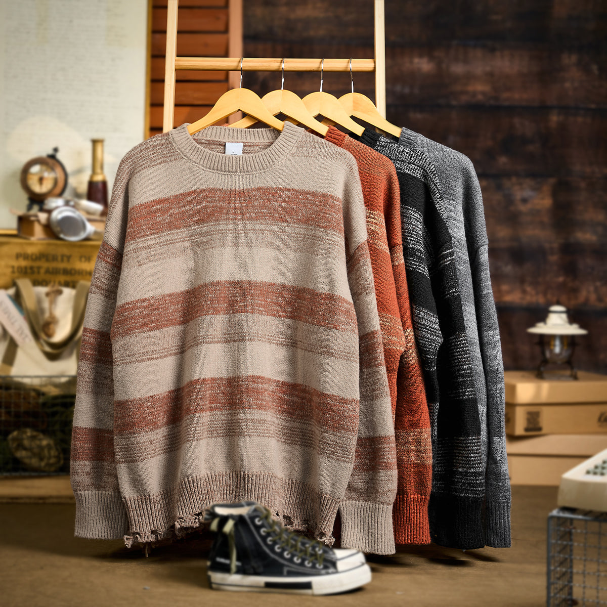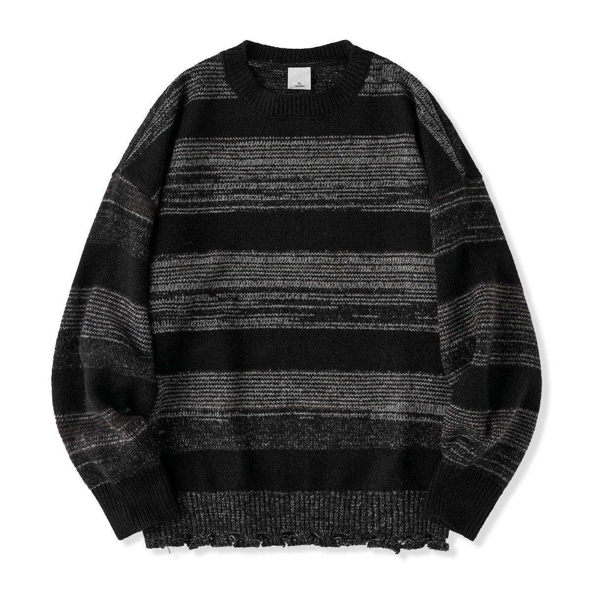 裾ダメージ加工 マルチボーダー柄クルーネックニットセーター