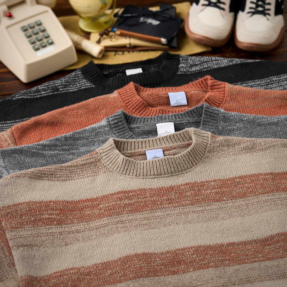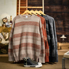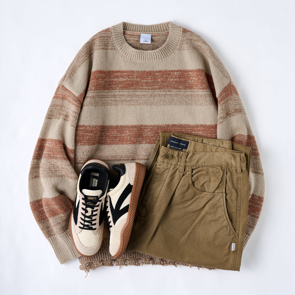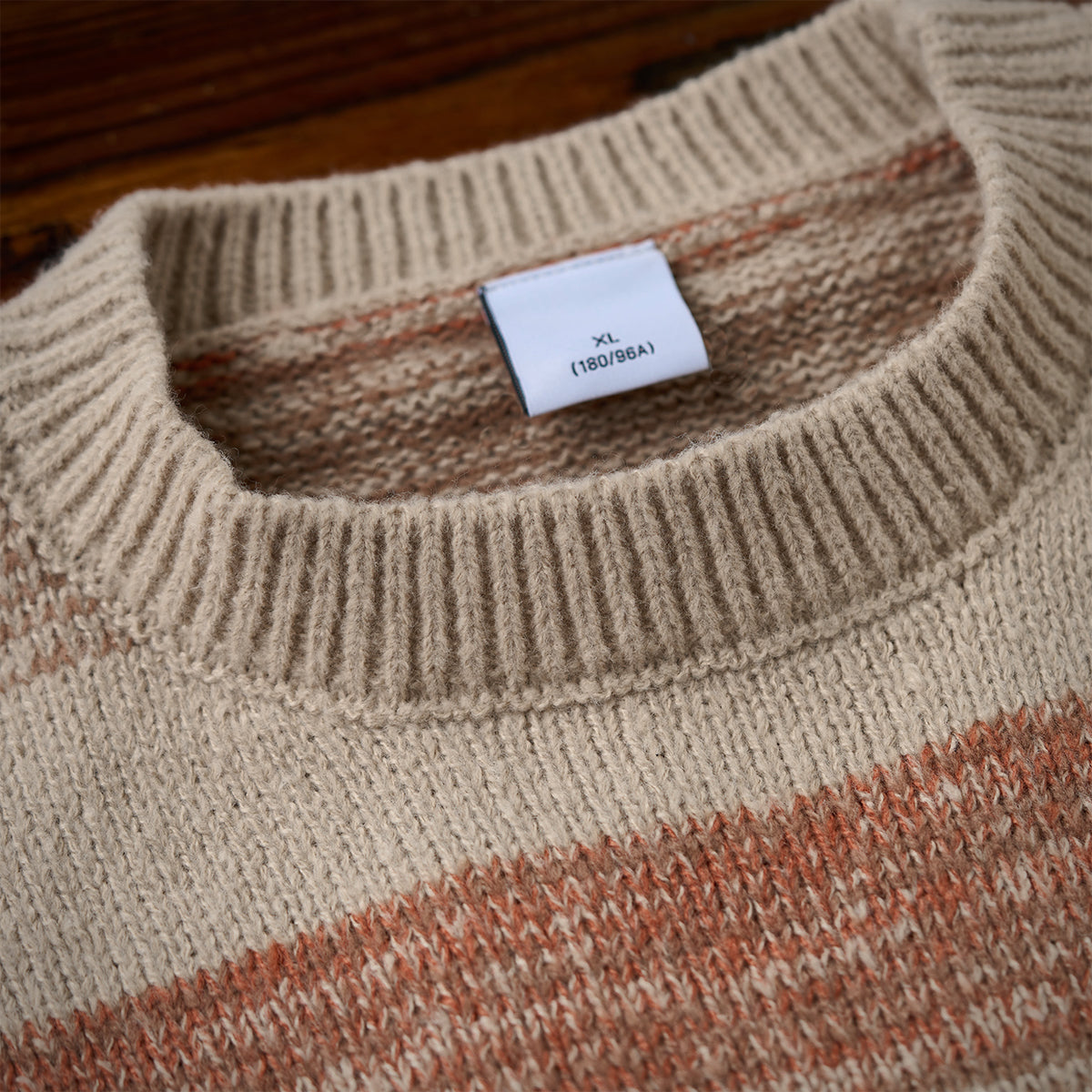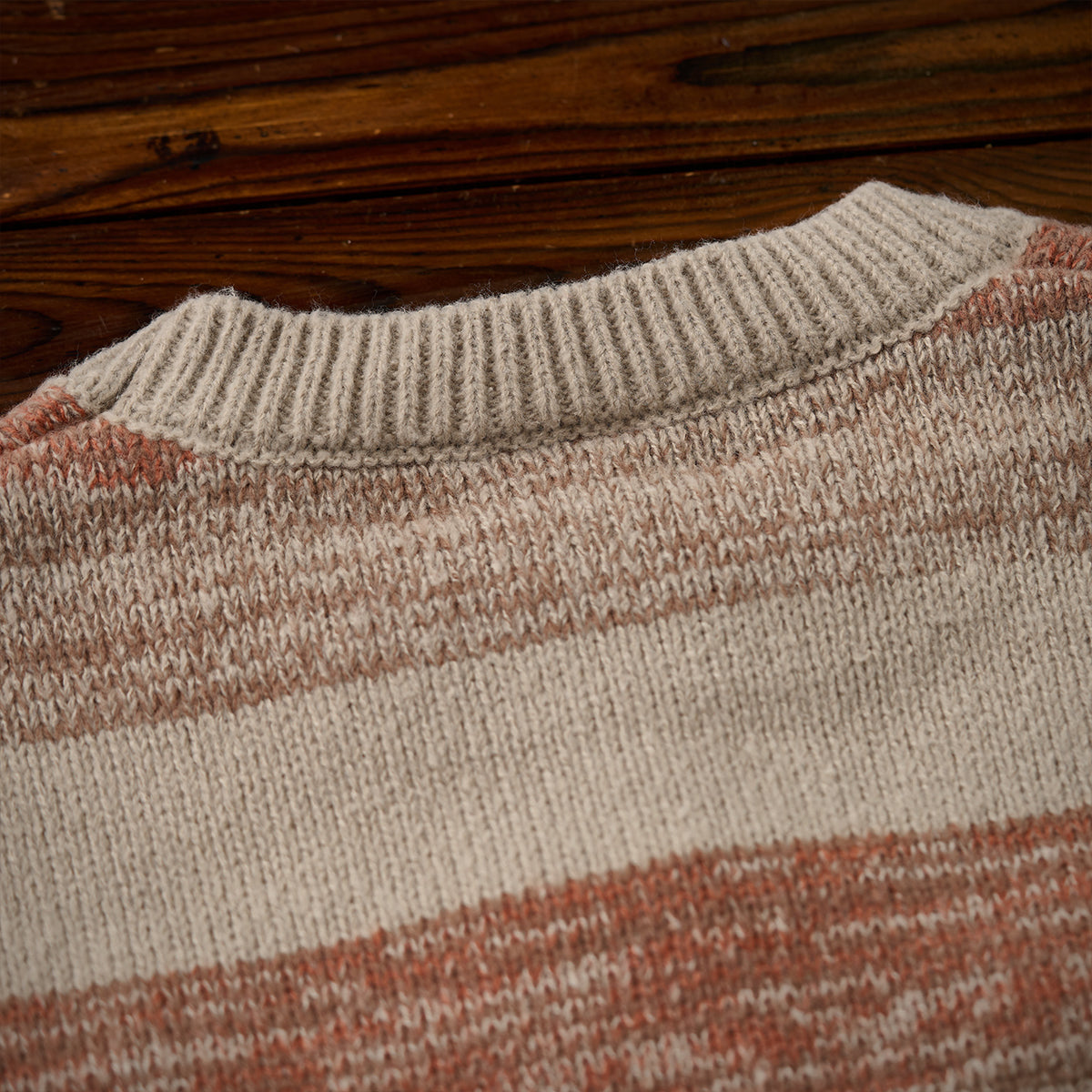 遊び心のあるデザインが魅力の、マルチボーダー柄クルーネックニットセーター。袖口と裾はしっかりとしたリブ編み加工で仕上げられて、伸縮性がありつつフィット感が高い。裾部分はダメージ加工があるにもかかわらず、リブ編みがアクセントとなり、全体の統一感を保っています。こなれた抜け感が、シンプルなスタイリングにも個性をプラスします。カラーバランスにこだわったマルチボーダー柄は、着るだけで存在感を放ちつつも、派手すぎず落ち着いた印象に。程よい厚みで、インナーにもアウターにも使いやすい汎用性の高い一着です。