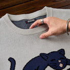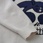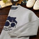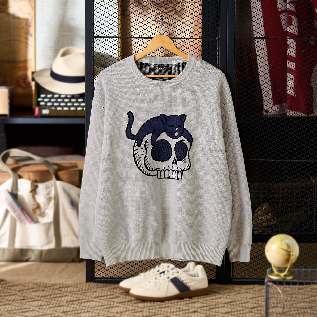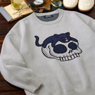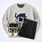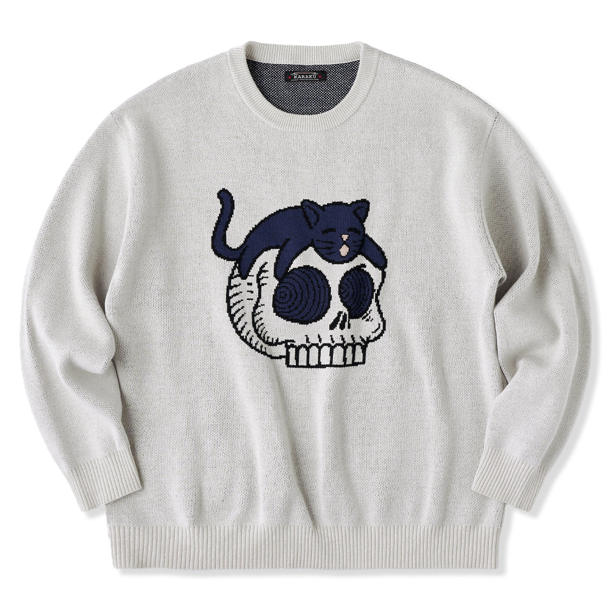 【予約】「スカルの上に寝そべり黒猫」ポップアート風ジャガードニットセーター