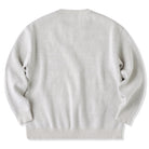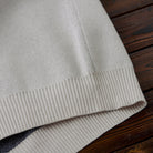 丸い襟元は、首周りを締め付けず、カジュアルかつリラックスした印象を与えます。袖口と裾にはリブ編みが施されて、フィット感を向上させています。