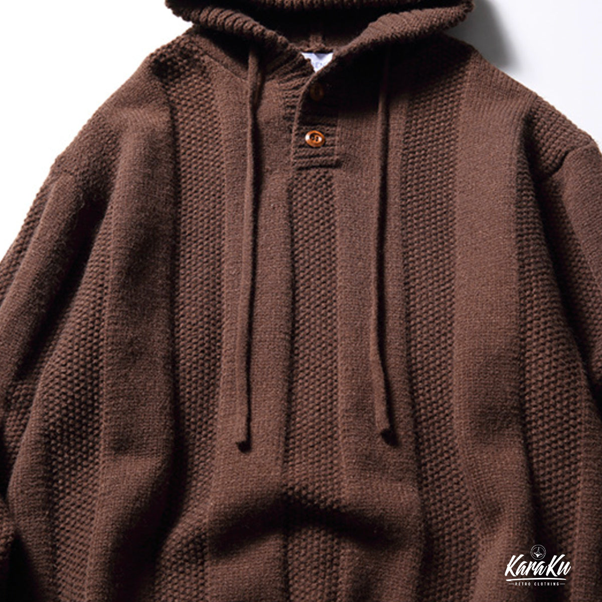 フードは頭部を覆う部分であり、保温や風を防ぐために使用され。フードは調整可能であり、ドローコードが備わって、カジュアルでスポーティな印象を与える。ドロップショルダーのデザインを持って、肩の縫い目が肩先より下に位置し、ゆったりとしたシルエットを作り出す。リラックス感とカジュアルさを強調し、着心地の良さを提供。袖口や裾にはリブ編みが施され、フィット感とシェイプを提供。