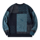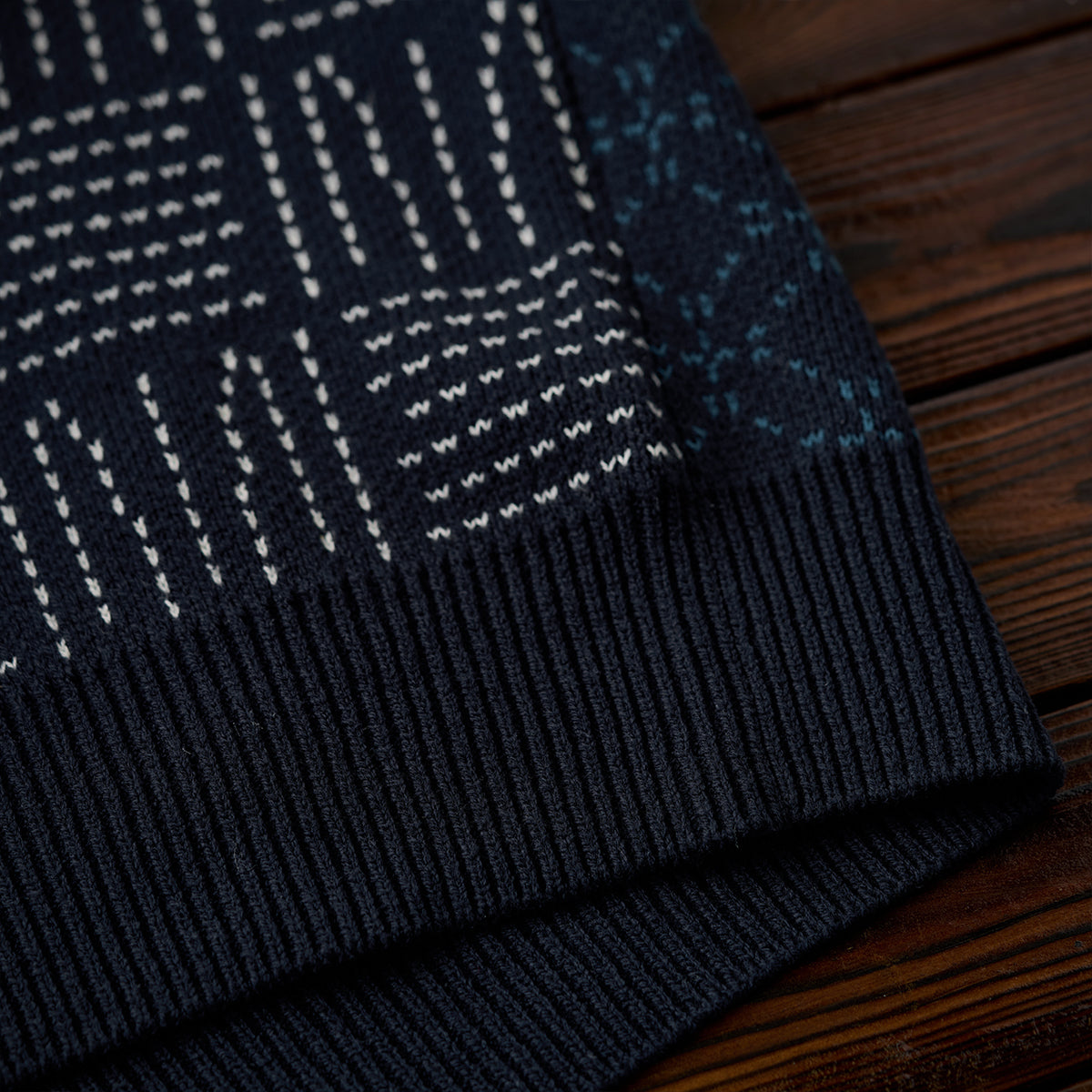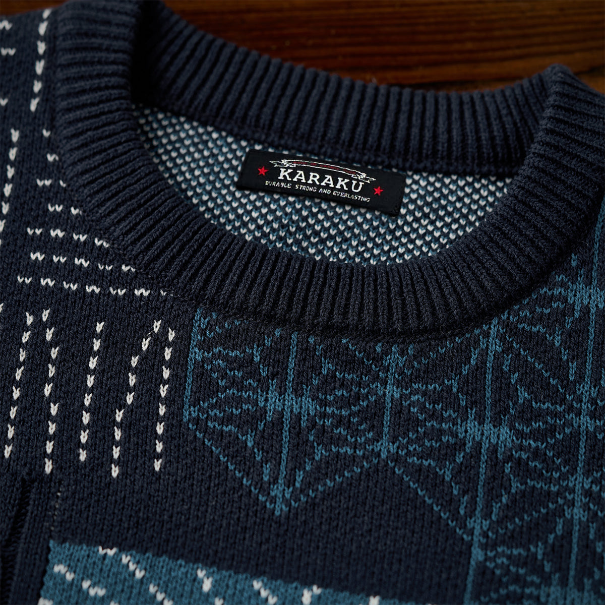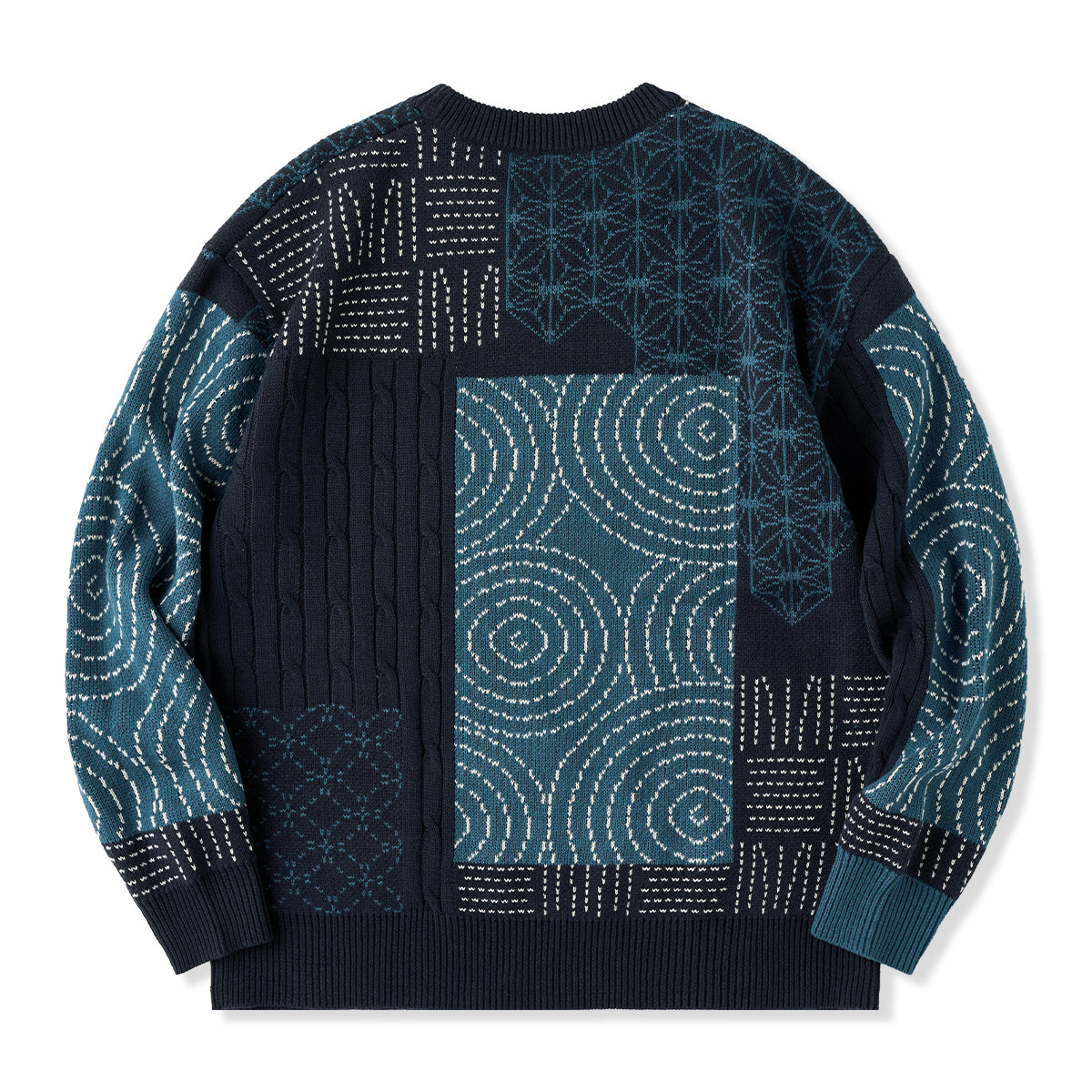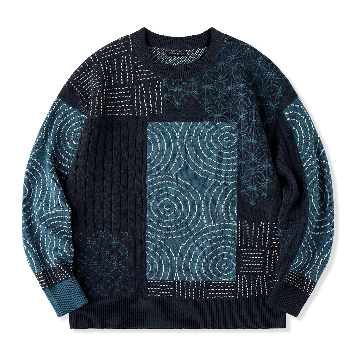 左胸と袖周りには、伝統的なケーブル編みが施されています。和柄の平面的なデザインと、ケーブル編みの立体感の対比が、視覚的な奥行きを生み出しています。