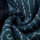 中央部分に大きく配置されている「青海波」の模様は、波が連なった形をして、無限に続く平和や繁栄を象徴します。左肩や胸元部分には幾何学的な「麻の葉」模様が見られ、麻の葉の形を抽象化したもので、成長や健康、生命力を象徴します。白い点線や破線で表現された模様は、日本の伝統的な刺し子技法を思わせます。