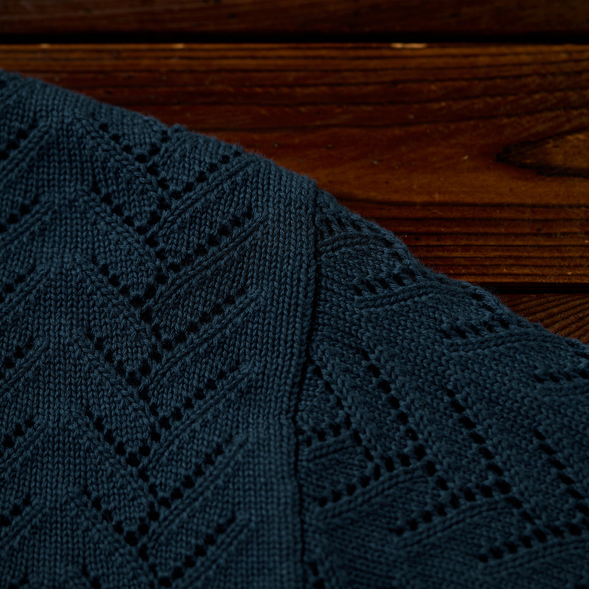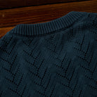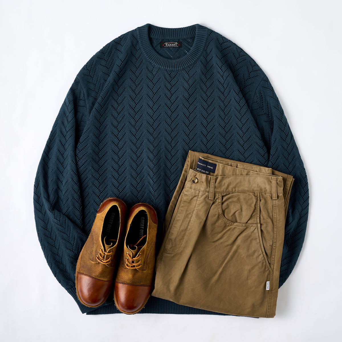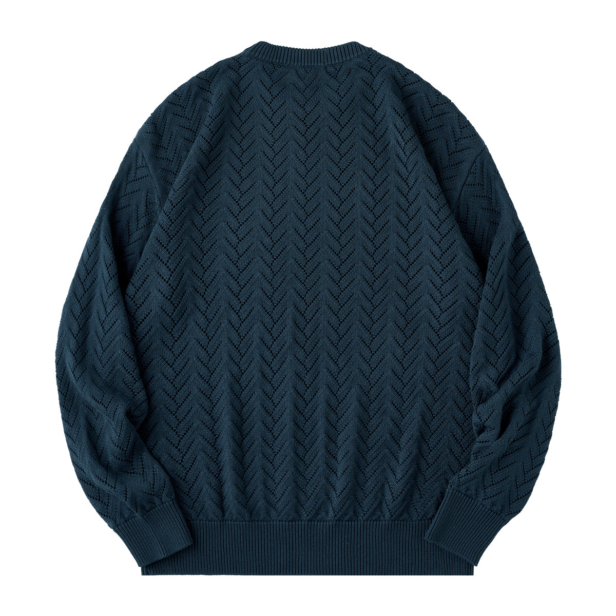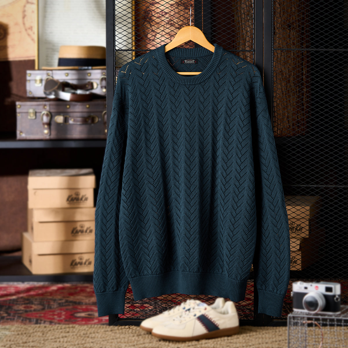 繊細な透かし彫り編みが印象的な、抜け感のあるドロップショルダーニットセーター。編み地の透かし模様が軽やかな表情を生み出し、シンプルながらも上品で洗練された印象に仕上げています。ゆったりとしたドロップショルダーシルエットが、リラックス感のある着こなしを演出。肌触りの良い柔らかな糸を使用し、程よい厚みで季節の変わり目にも快適に着用できます。シャツやロングTシャツとのレイヤードにもおすすめの一枚です。