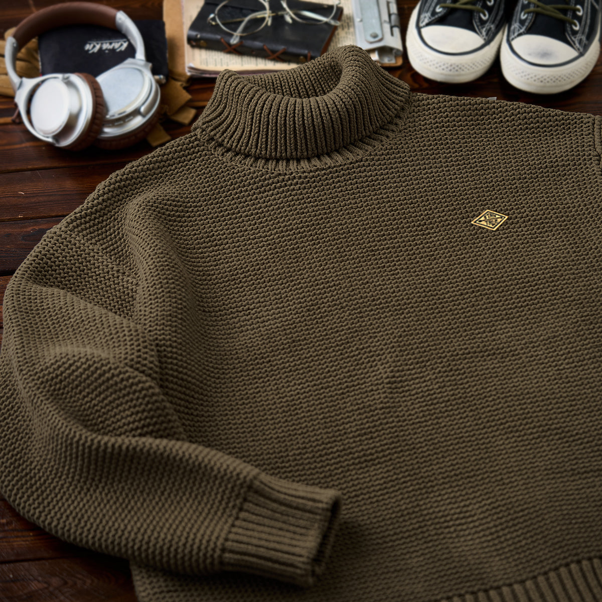 【予約】「STAY TRUE」刺繍ワッペン パール編みハイネックニットセーター