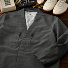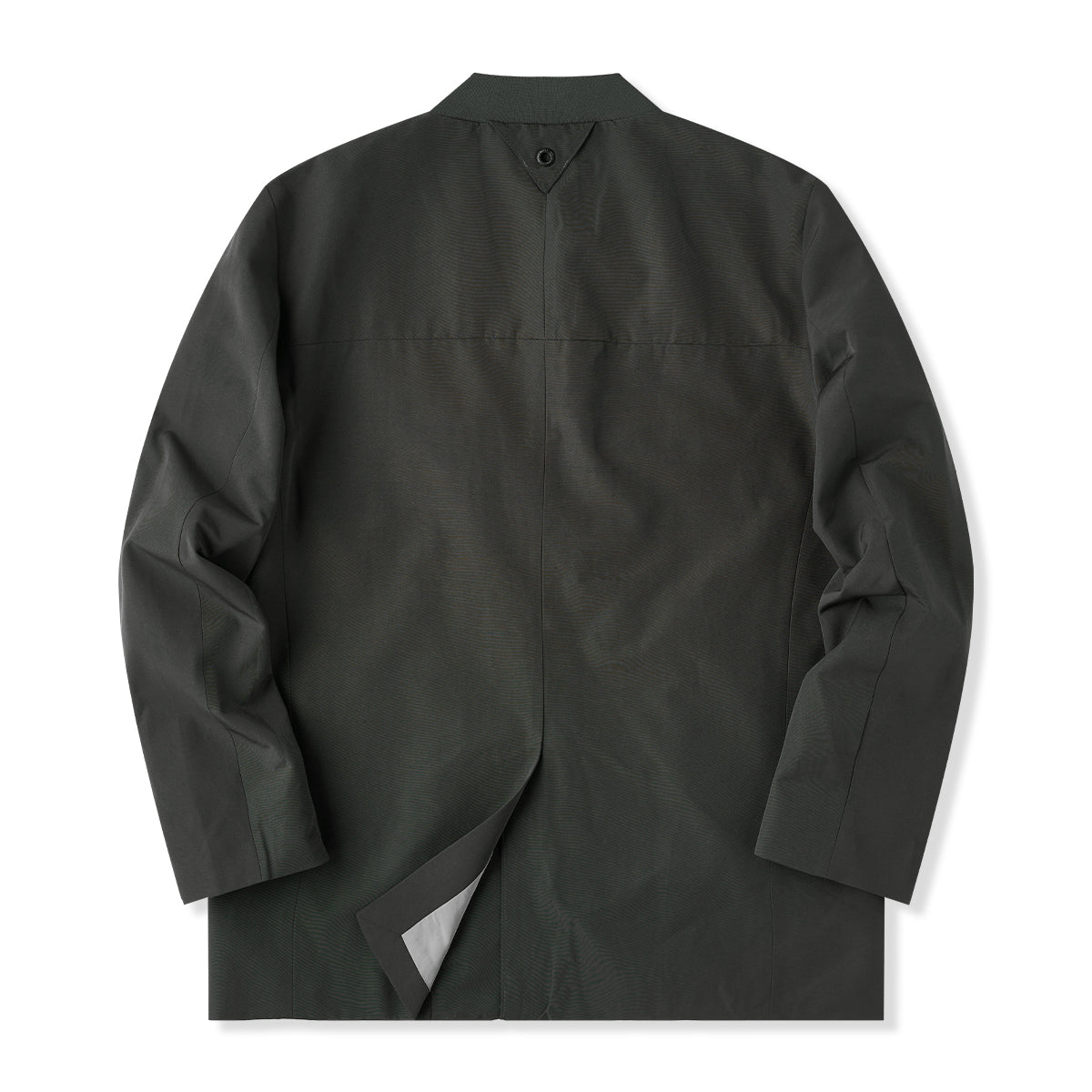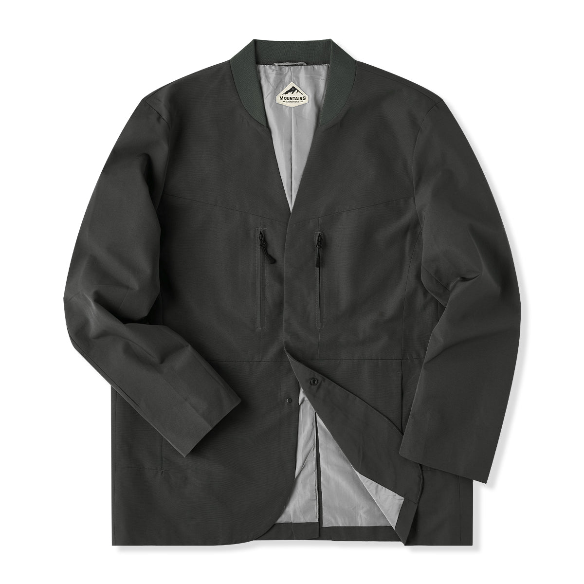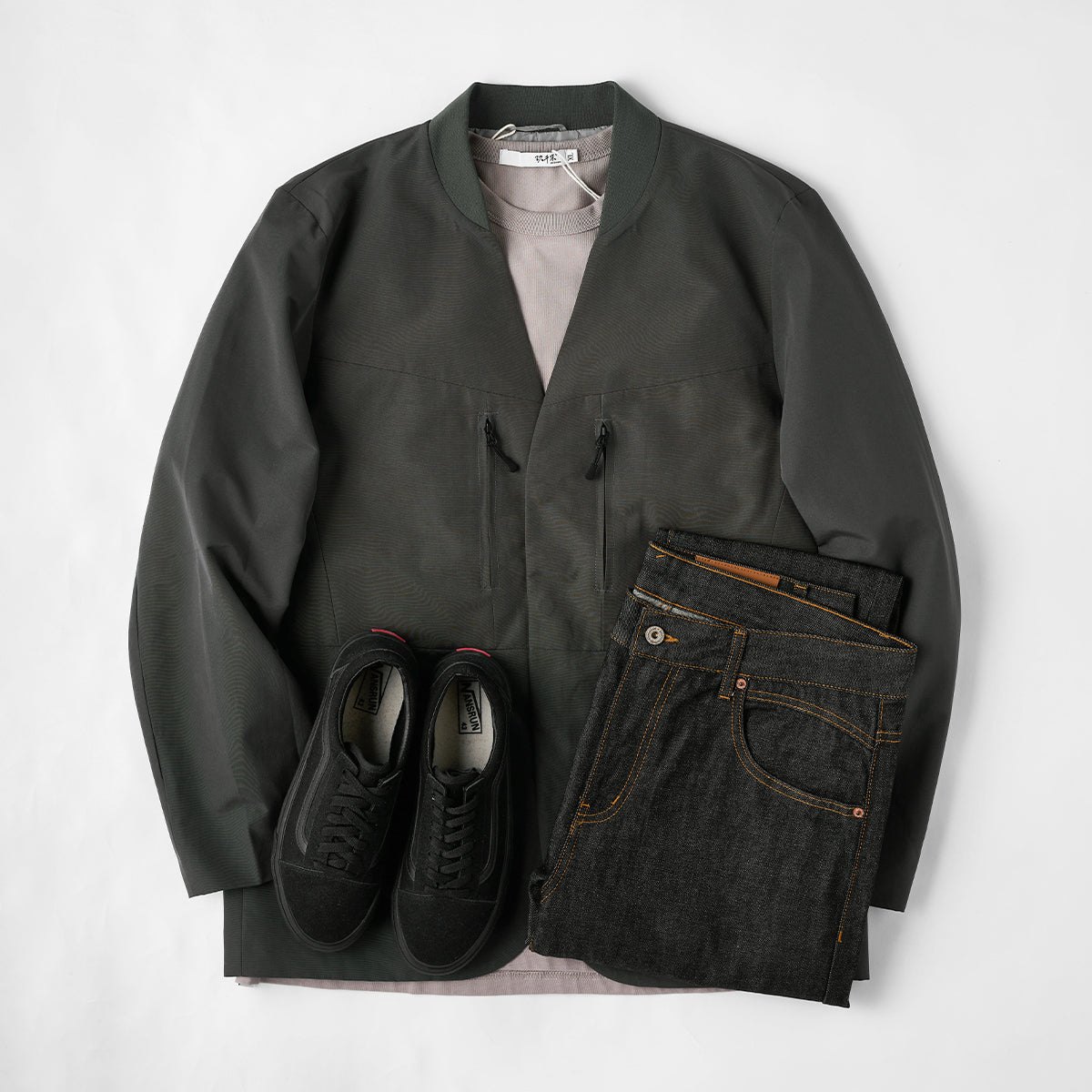 ノーカラー仕様で、首周りの締め付けがなく快適に着用できる。胸元にジップポケット2つ配置し、小物を落とさないように実用性が高い。