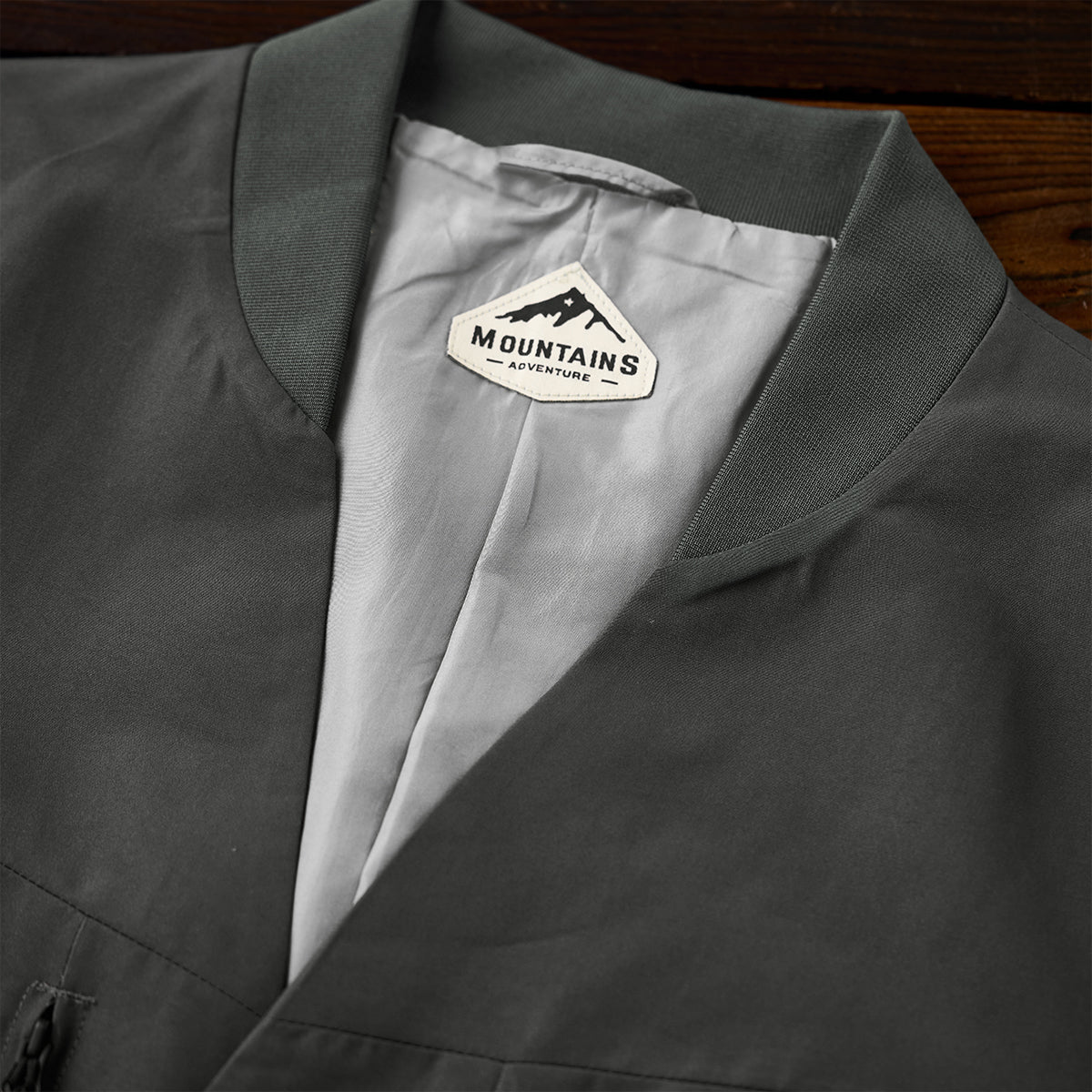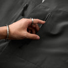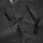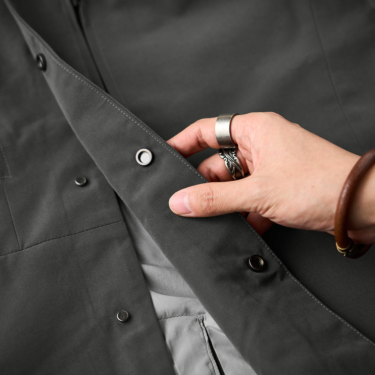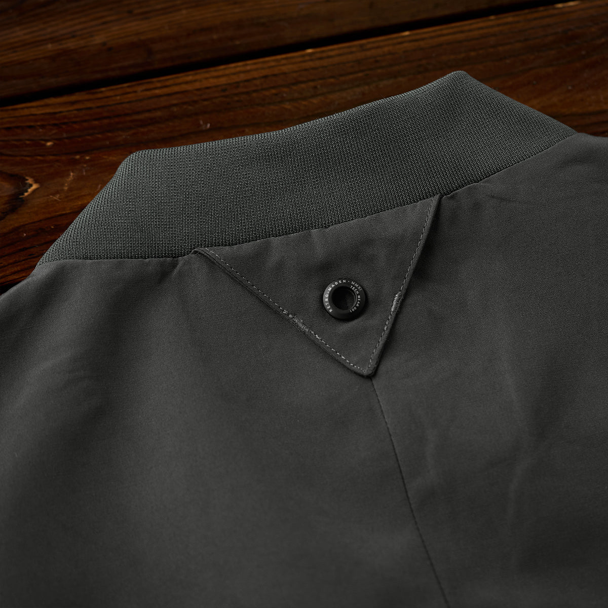 ノーカラー仕様で、首周りの締め付けがなく快適に着用できる。胸元にジップポケット2つ配置し、小物を落とさないように実用性が高い。