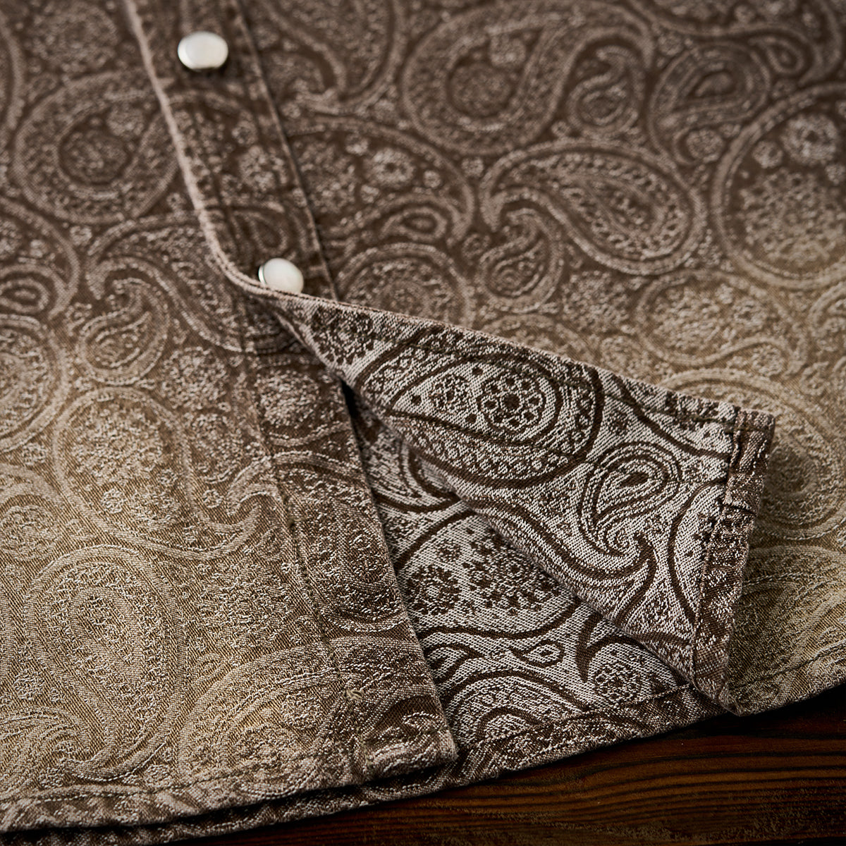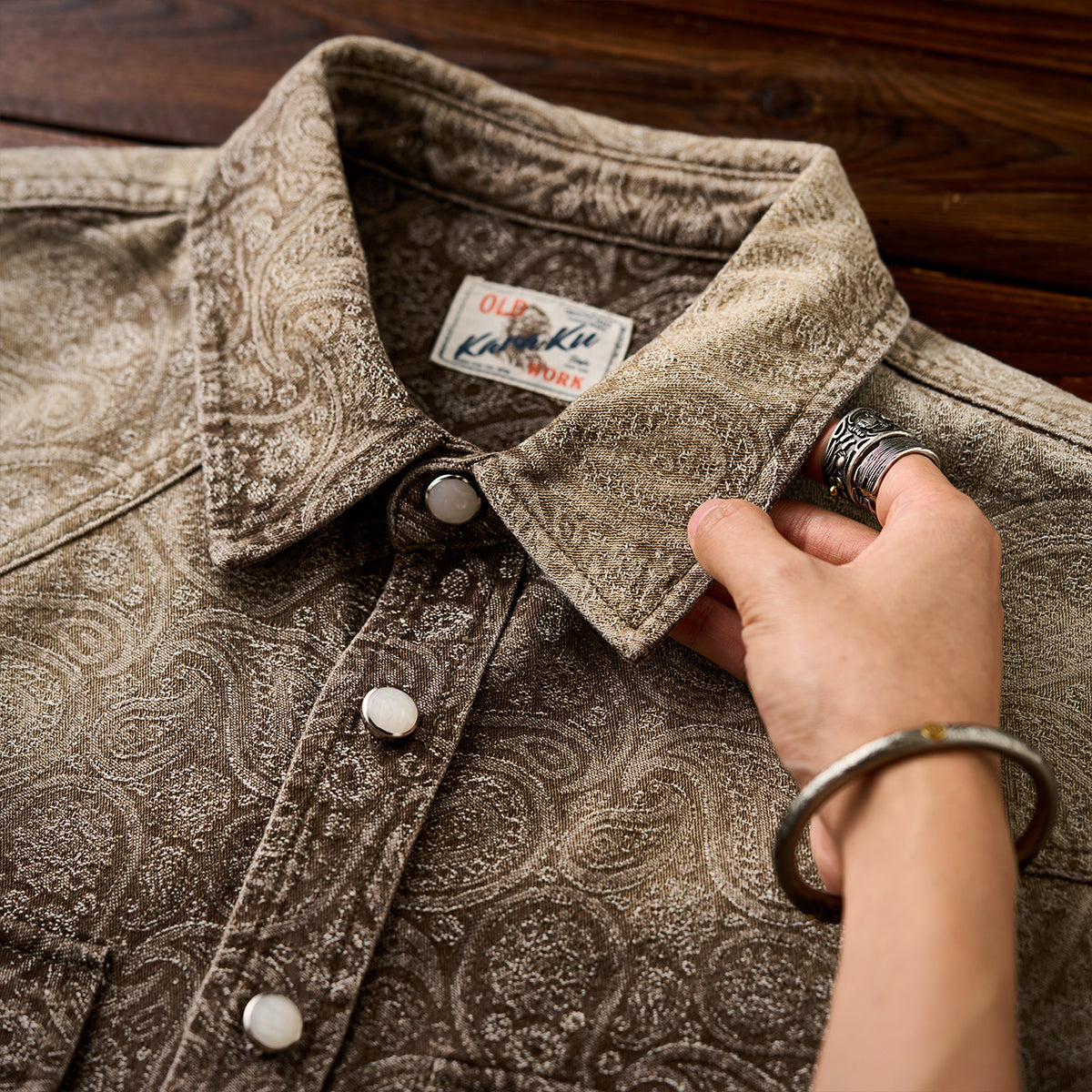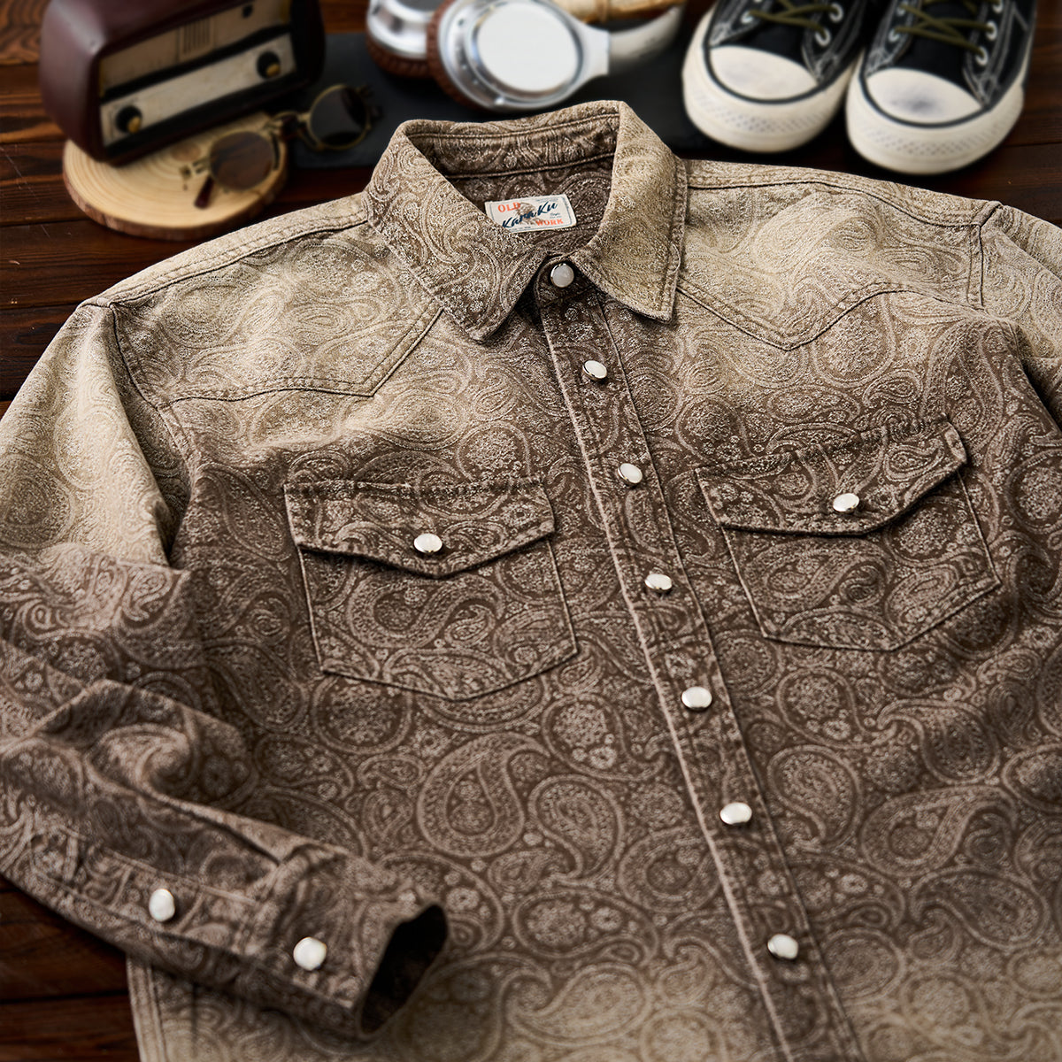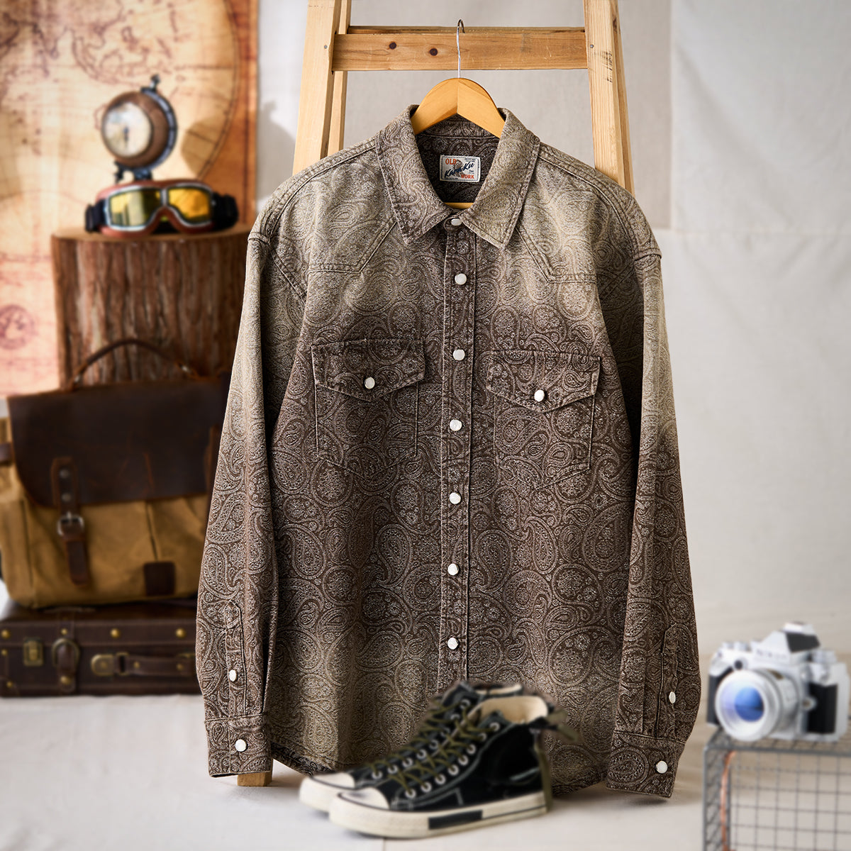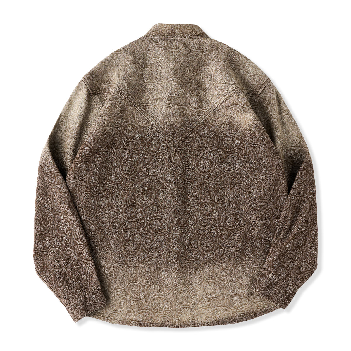 パール調ボタン付き グラデーションペイズリー柄デニムワークシャツ