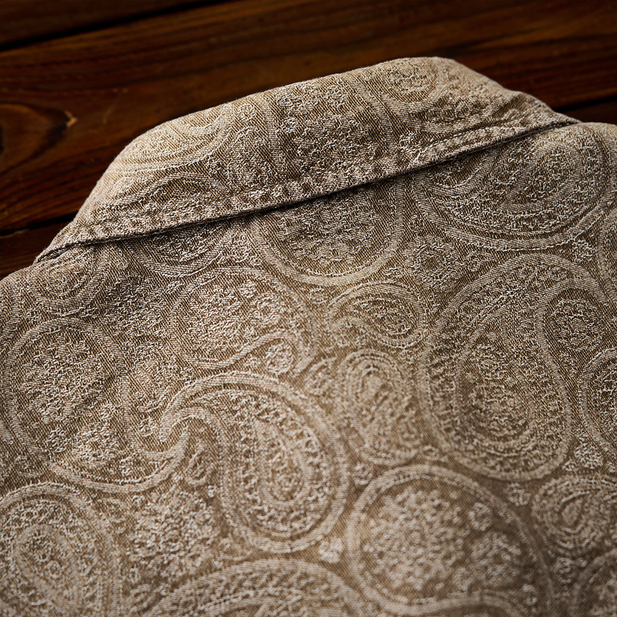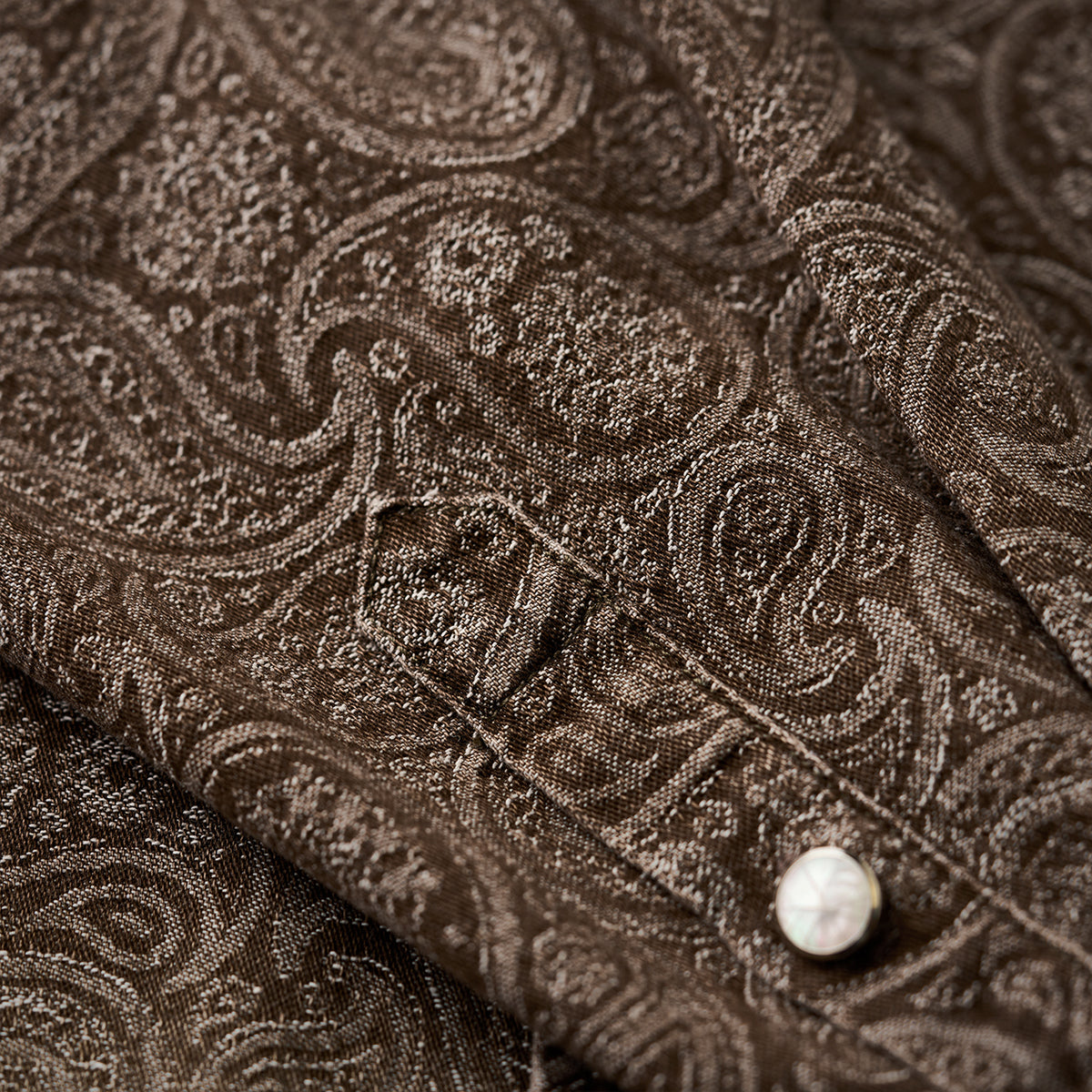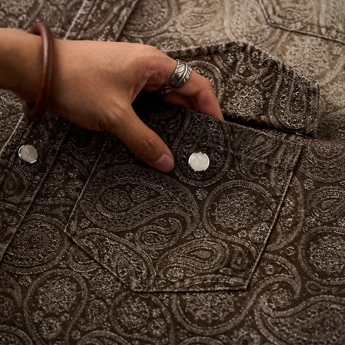 クラシックなペイズリー柄をジャカード織りで表現した、奥行きのあるデザインシャツ。パール調のボタンが上品なアクセントとなり、カジュアルになりすぎず、大人の着こなしにマッチします。グラデーションは上下で色の濃淡を切り替えた仕上がりで、胸から腰にかけては深みのある濃色、襟元や裾にかけてはやや淡い色合いに。染めではなく織りで魅せるこの風合いは、デニムシャツとしての新たな個性を演出します。胸ポケットを2つ備え、実用性もキープ。一枚でも主役になり、ジャケット感覚でも着られる万能な一着です。