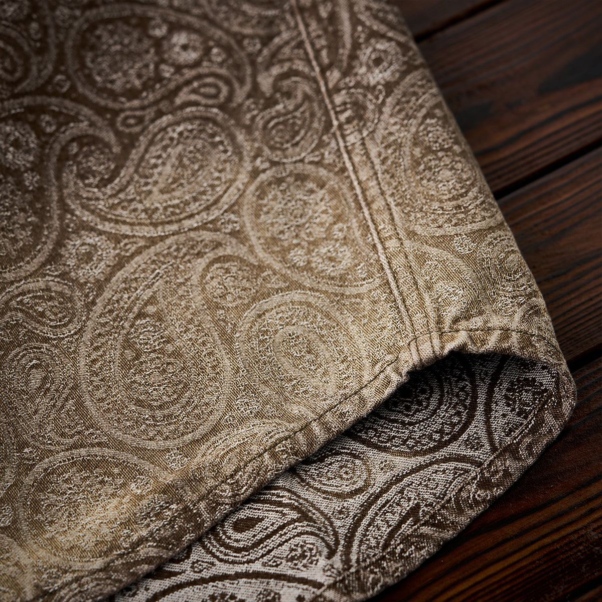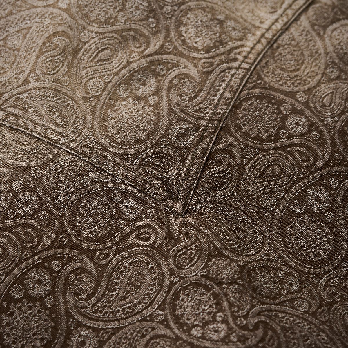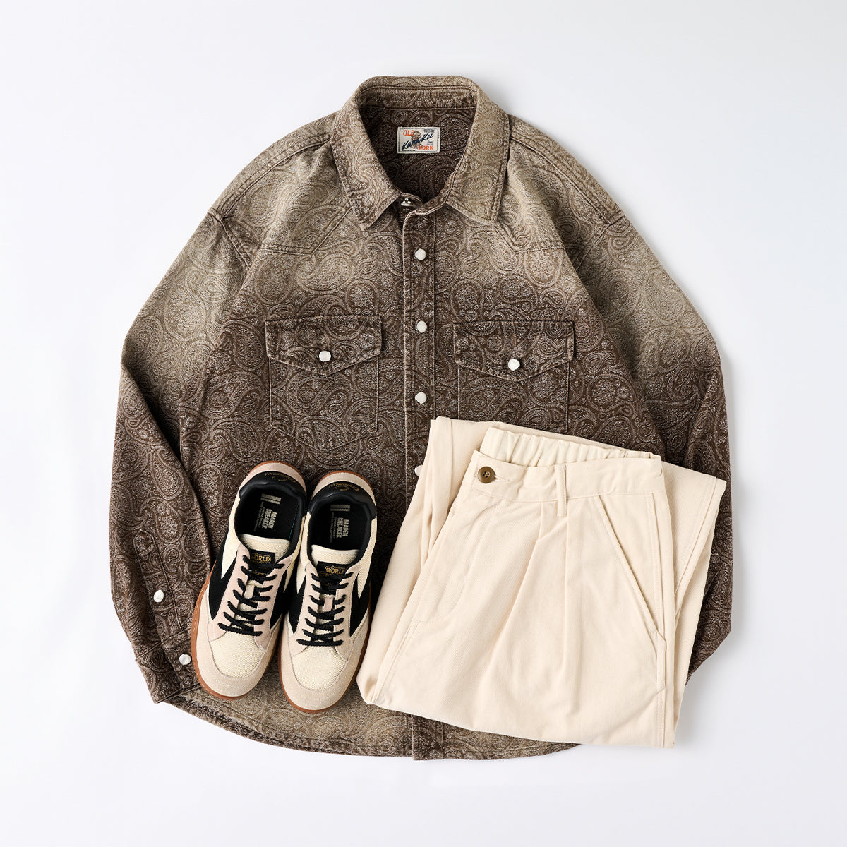 クラシックなペイズリー柄をジャカード織りで表現した、奥行きのあるデザインシャツ。パール調のボタンが上品なアクセントとなり、カジュアルになりすぎず、大人の着こなしにマッチします。グラデーションは上下で色の濃淡を切り替えた仕上がりで、胸から腰にかけては深みのある濃色、襟元や裾にかけてはやや淡い色合いに。染めではなく織りで魅せるこの風合いは、デニムシャツとしての新たな個性を演出します。胸ポケットを2つ備え、実用性もキープ。一枚でも主役になり、ジャケット感覚でも着られる万能な一着です。