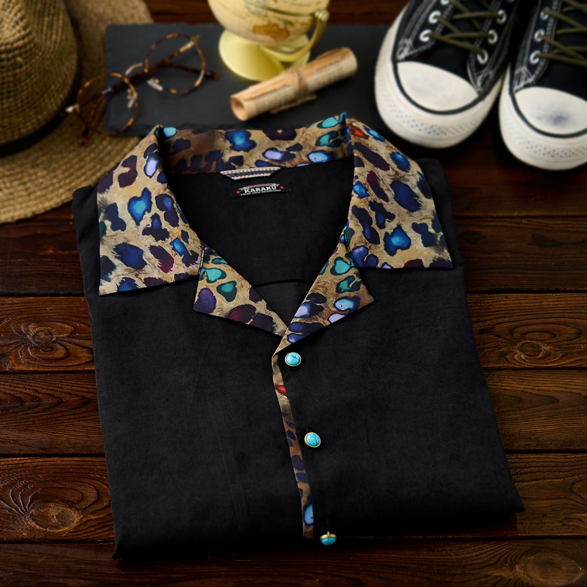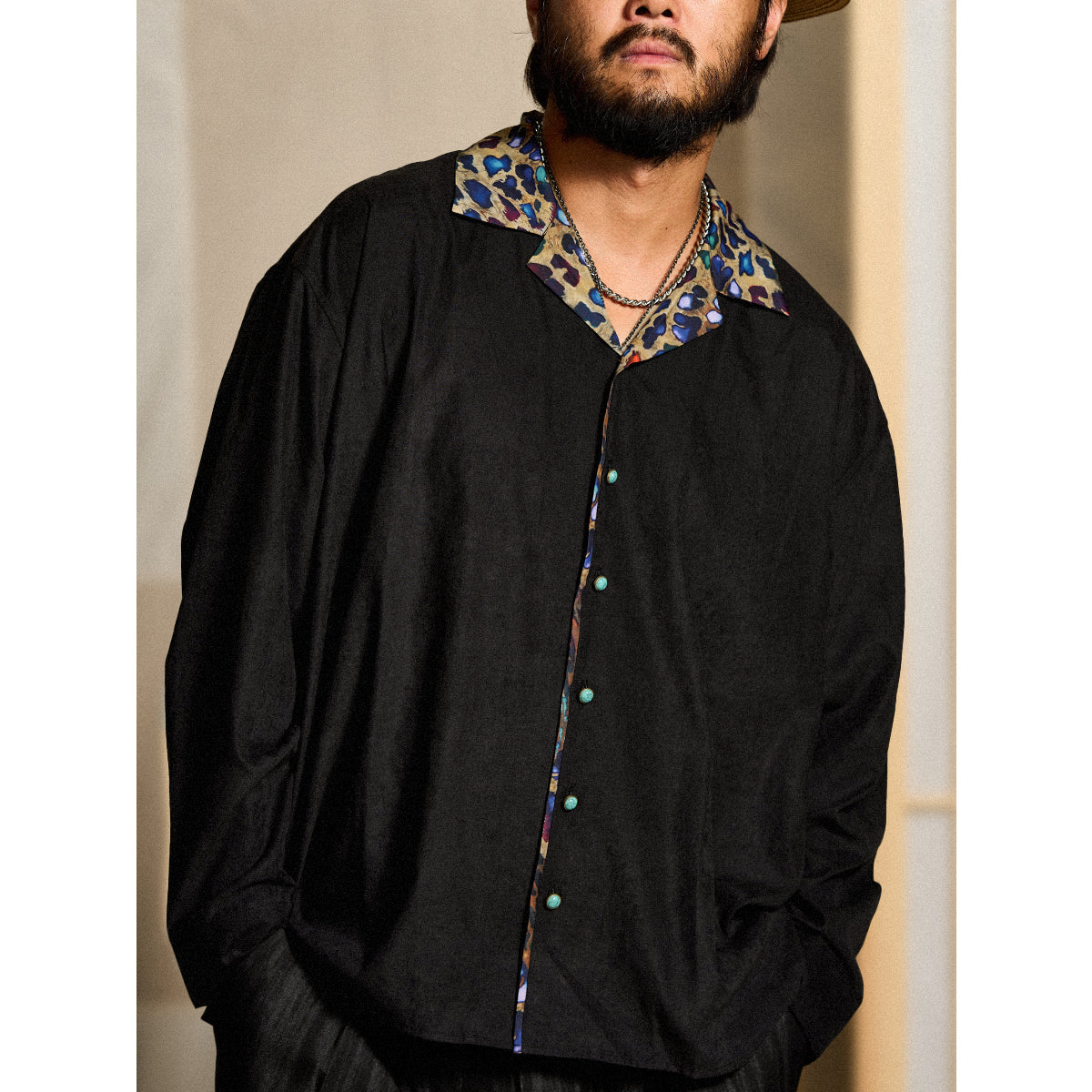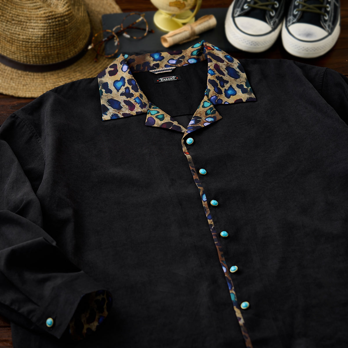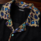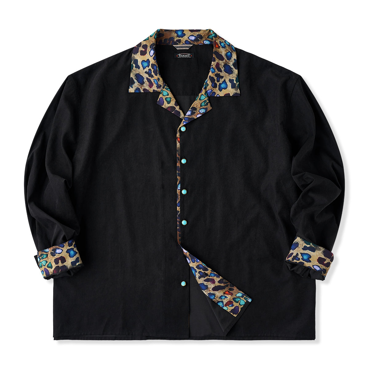Karaku×川又聡「夢豹」豹柄プリント切替 ターコイズ調ボタン付きピーチスキンシャツ