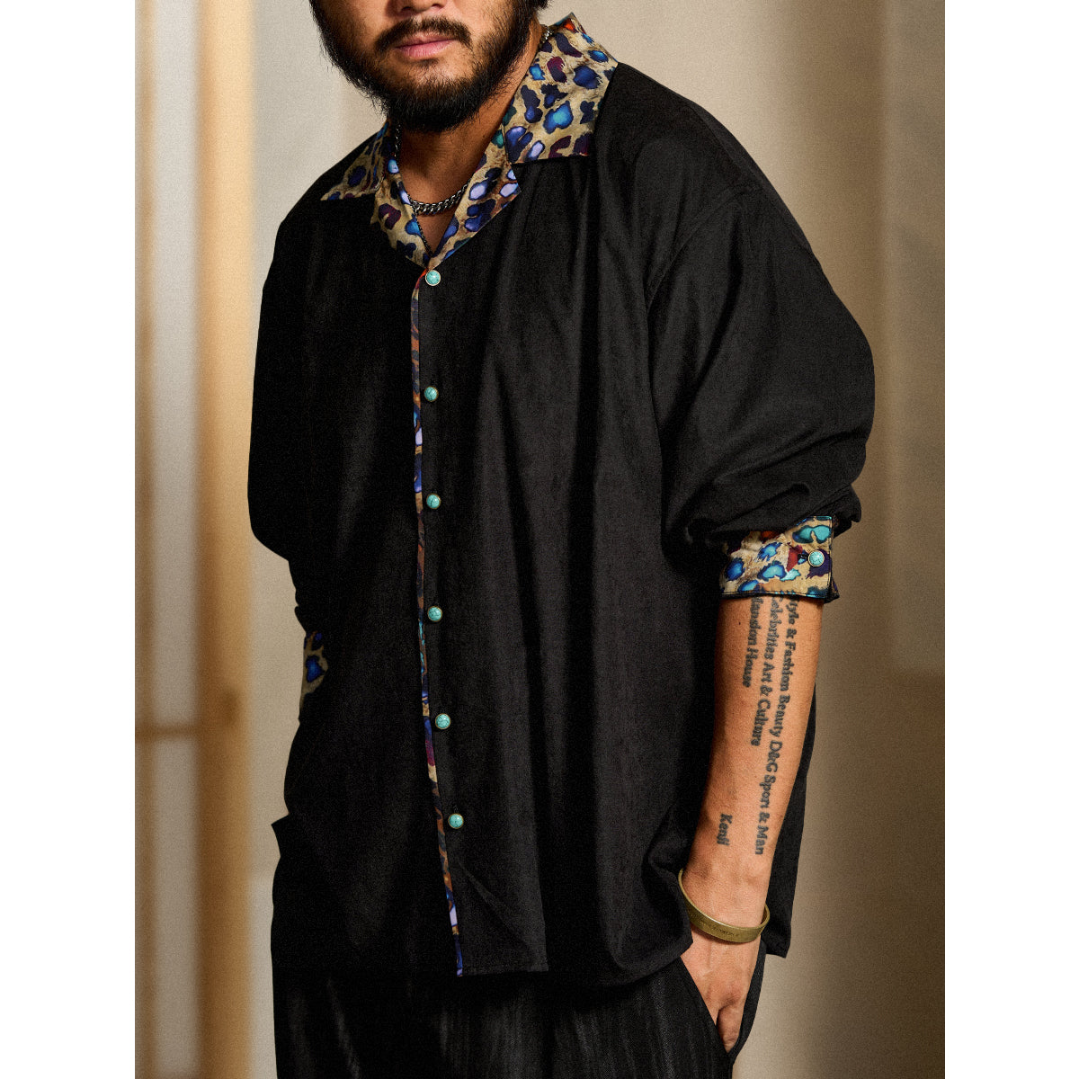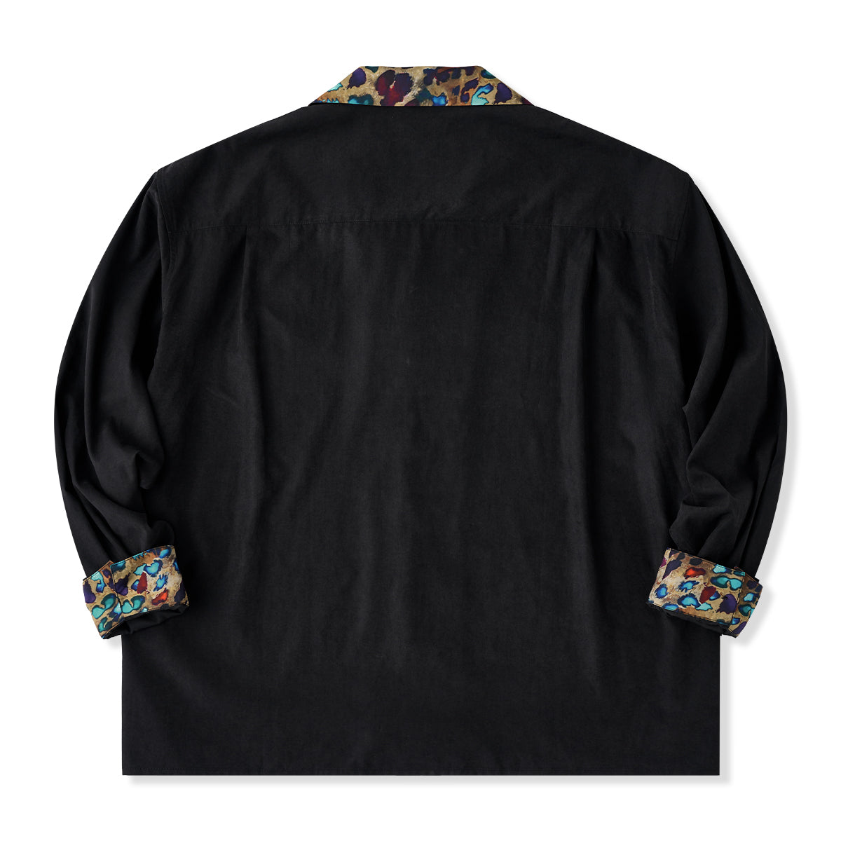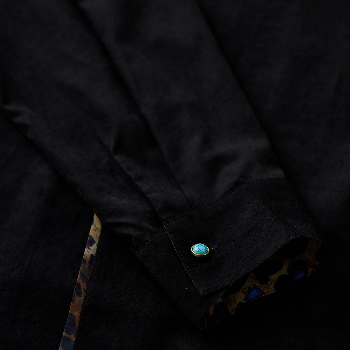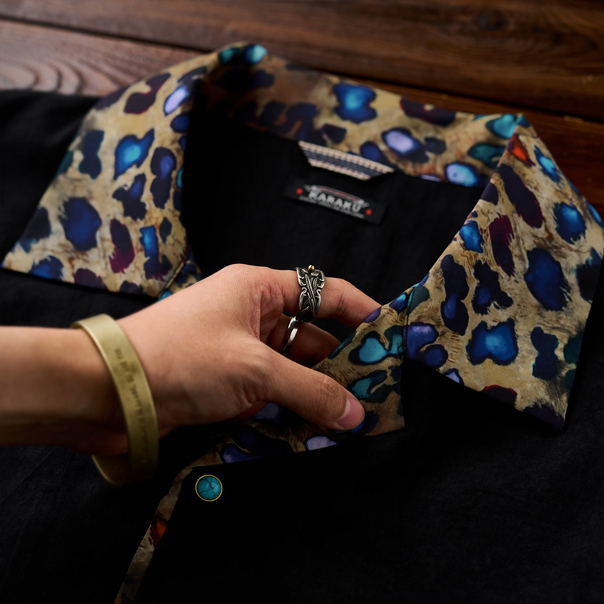 Karaku×川又聡「夢豹」豹柄プリント切替 ターコイズ調ボタン付きピーチスキンシャツ