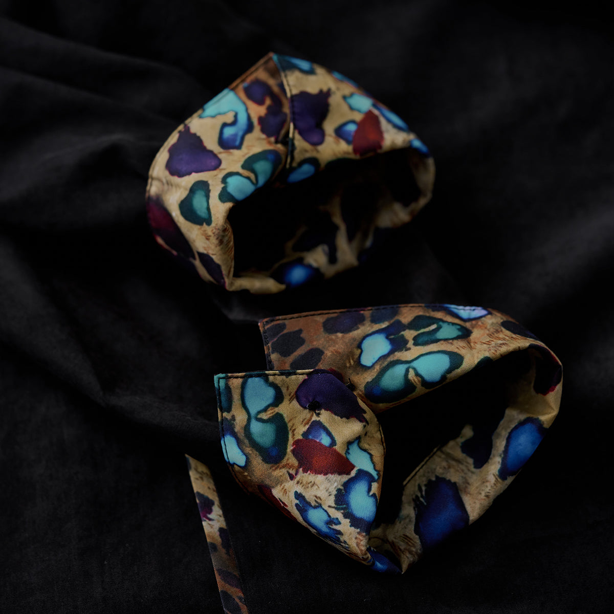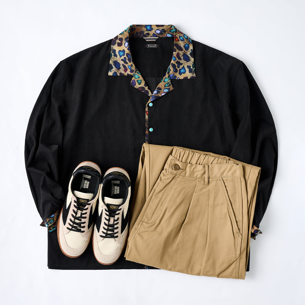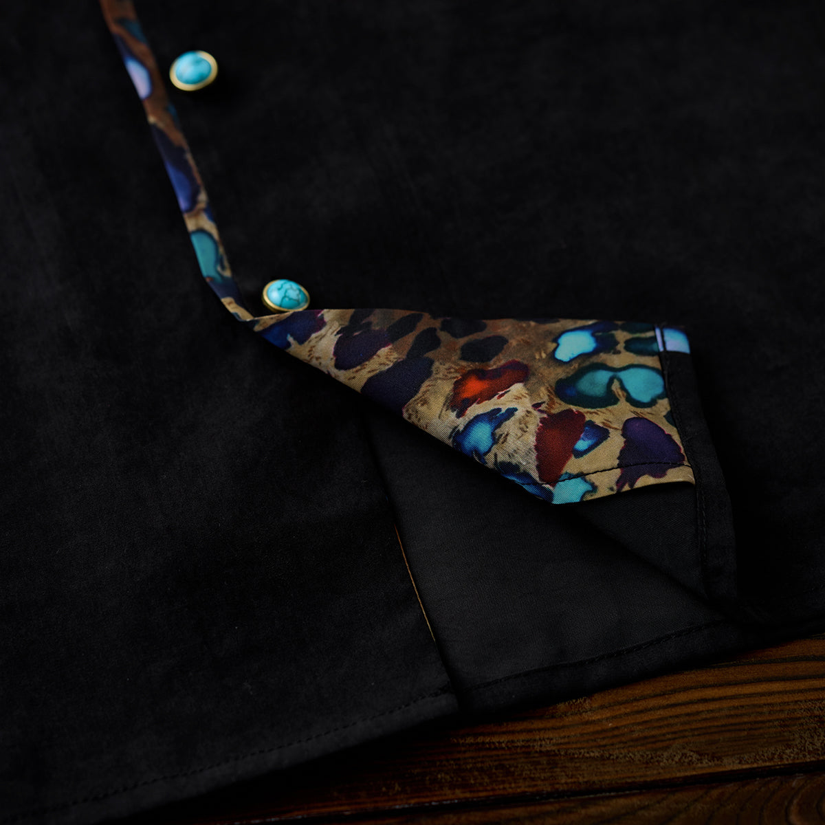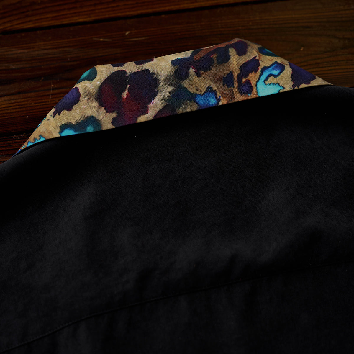 Karaku×川又聡「夢豹」豹柄プリント切替 ターコイズ調ボタン付きピーチスキンシャツ