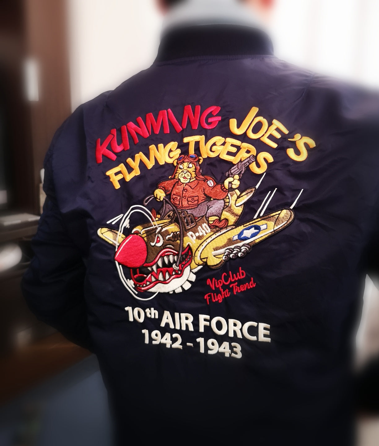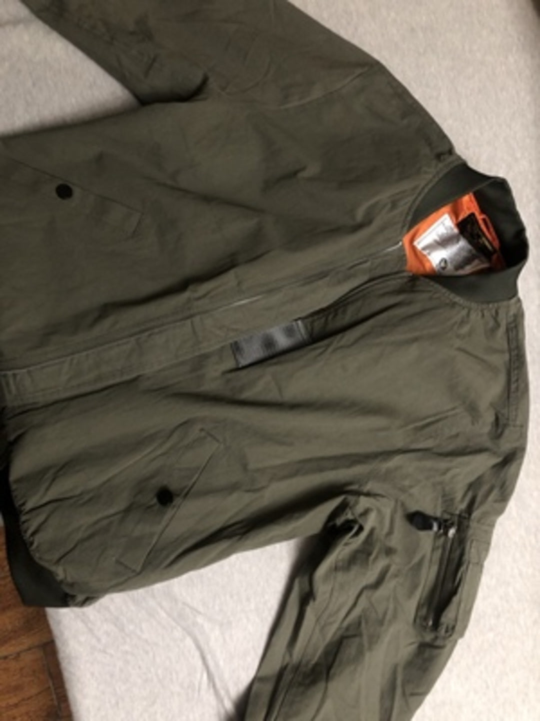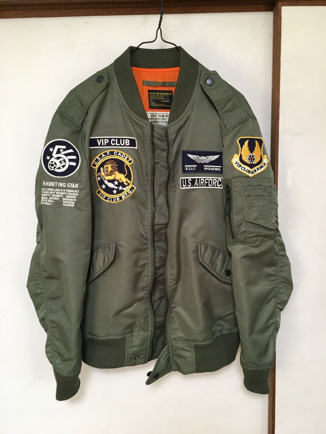 まずはそもそも論として、MA-1がどういうジャケットかについて軽く解説を。1944年に誕生したフライトジャケットB-15の後継モデルとして、1950年代初頭にアメリカ空軍で採用されたのがその始まりです。“インターミディエイトゾーン”と呼ばれる20℃から-10℃の気温で着用され、カラーはくすんだ緑であるセージグリーンが基本。飛行機のシートに座った際に生地が挟み込まれないよう、後ろ身頃を短めに設定しているのも特徴です。また、本来のMA-1は裏地に視認性の高いオレンジカラーを用いていますが、これは万一の墜落・脱出を想定しての仕様。裏返しに着ることで救出部隊の発見率を上げる役割を果たします。