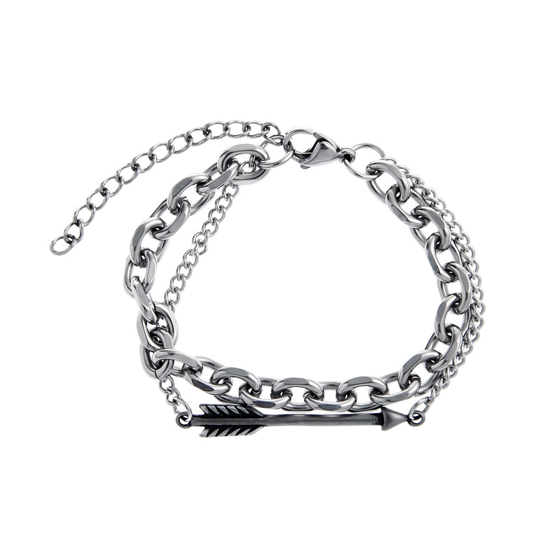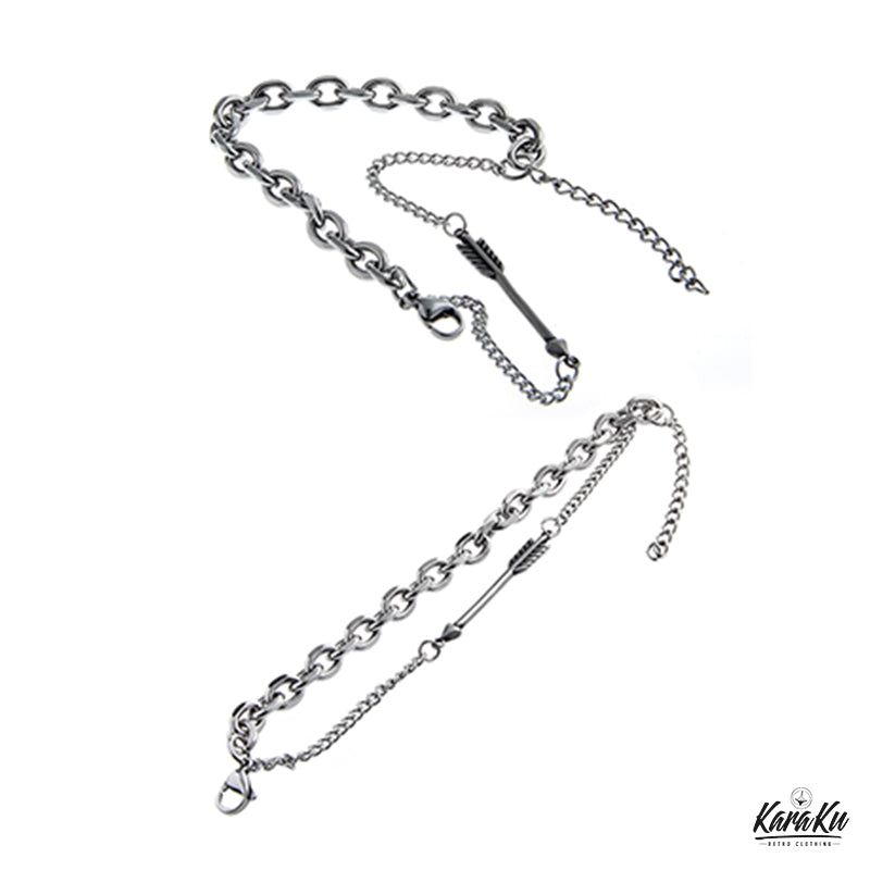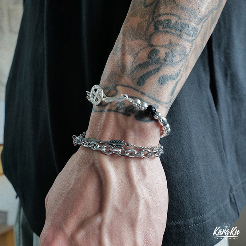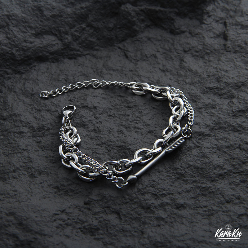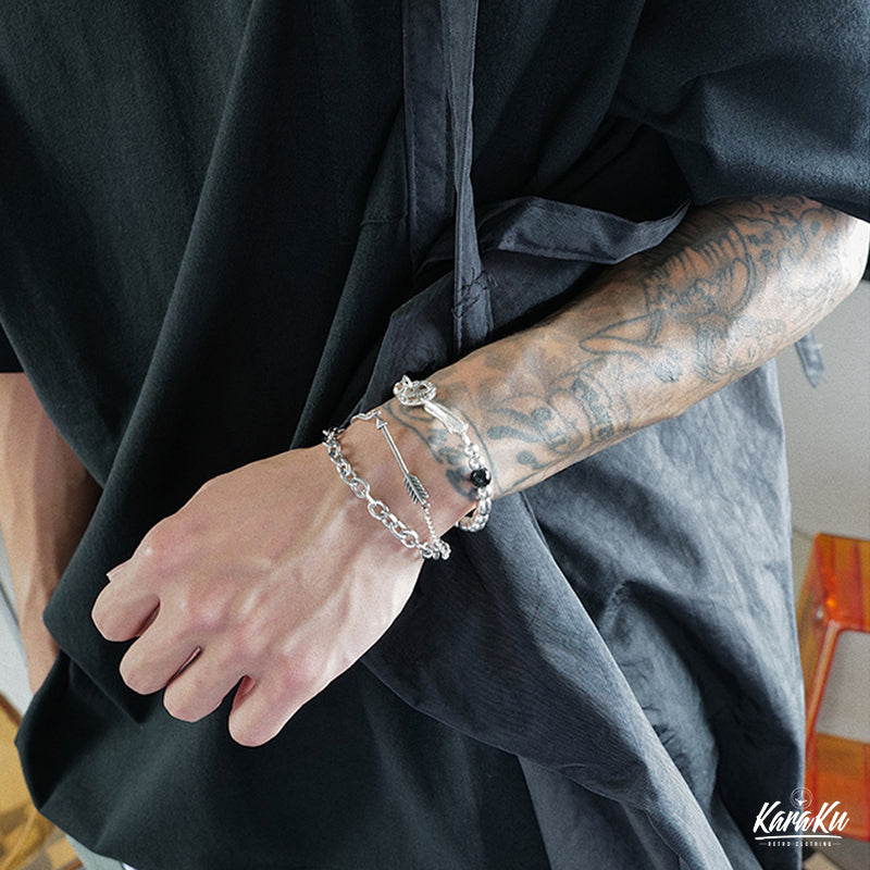 金属アレルギーを起こしにくく重量感のあるヘビーチェーンキューバブレスレットが登場!キヘイチェーンとケーブルリンクで繋ぎ組み合わせたコンビチェーンブレスレットです。矢印の飾りと組み合わせて、無骨なディテールを作ります。ケーブルリンクは存在感抜群、キヘイチェーンは押しつぶされた面が同じ方向を向いて並んでいるのが特徴なので、身に着けた時になめらかできれいな輝きが生まれます。光沢感があり、上品で清涼感がある印象を持たせてくれます。