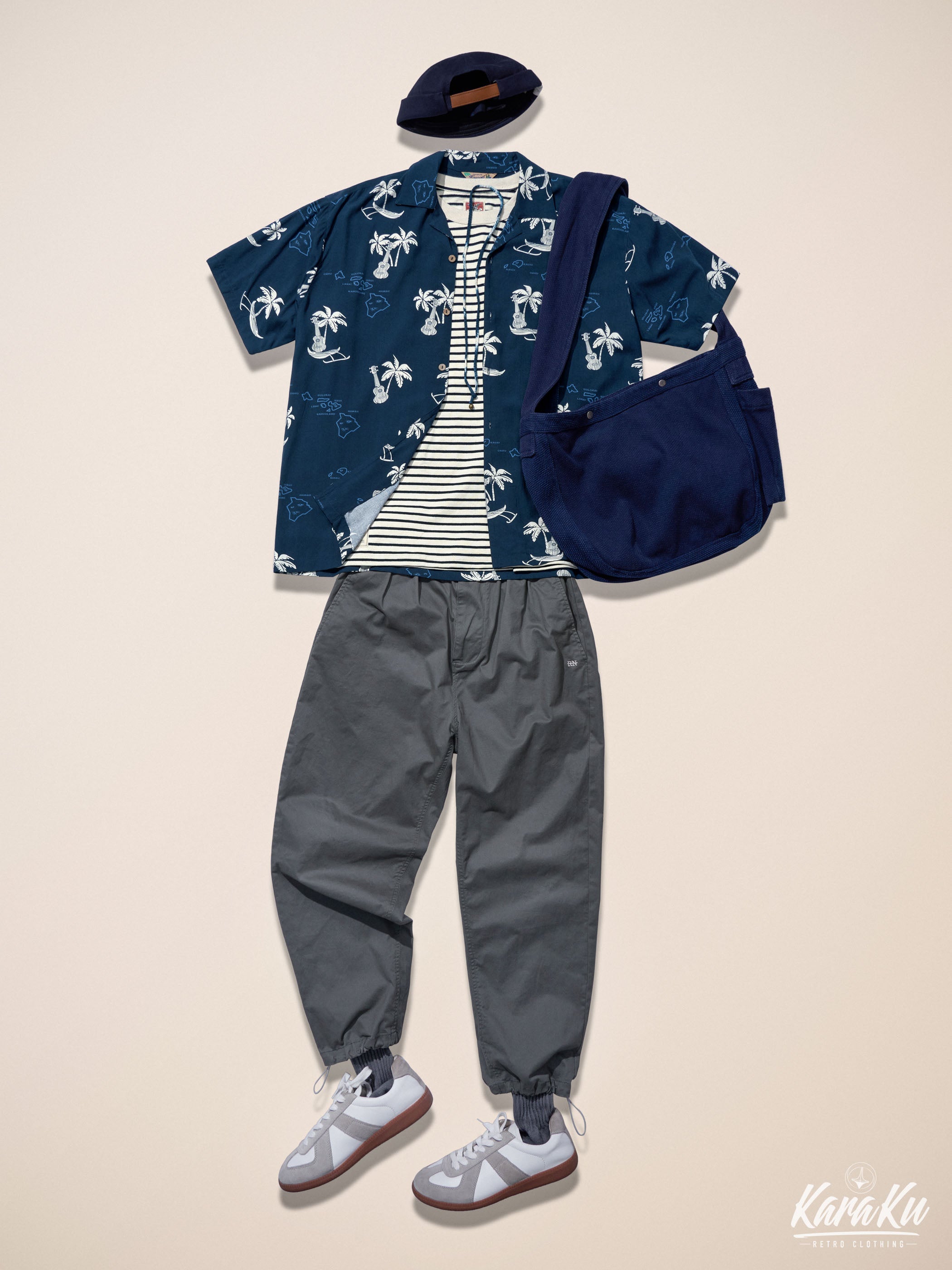 本アイテムはロイヤルブルーをベース、さらにその上にハワイ代表的なシーアイランドとギターをアクセント、柄自体それほどインパクトがあるわけでもなく、アロハシャツの中では地味な部類に入るのですが、エルヴィス・プレスリーが主演映画「ブルーハワイ」のサントラ盤のカバー写真で着用した事から有名柄となり、肌触りの良さが着心地抜群のビスコース繊維を採用しています。ドレープ感のあるシルエットに、薄手生地を合わせることで昨シーズンも好評だったドライタッチの肌触りと清涼感溢れる着心地は今年も健在。オープンシャツにしても良し、ボタンまで留める事もでき、コーデの幅も広がります。絶妙な配色のリラックスした落ち感と相まって、さらりと着心地抜群なので清涼感をプラスしてくれる暑い季節に最適なアイテムです。