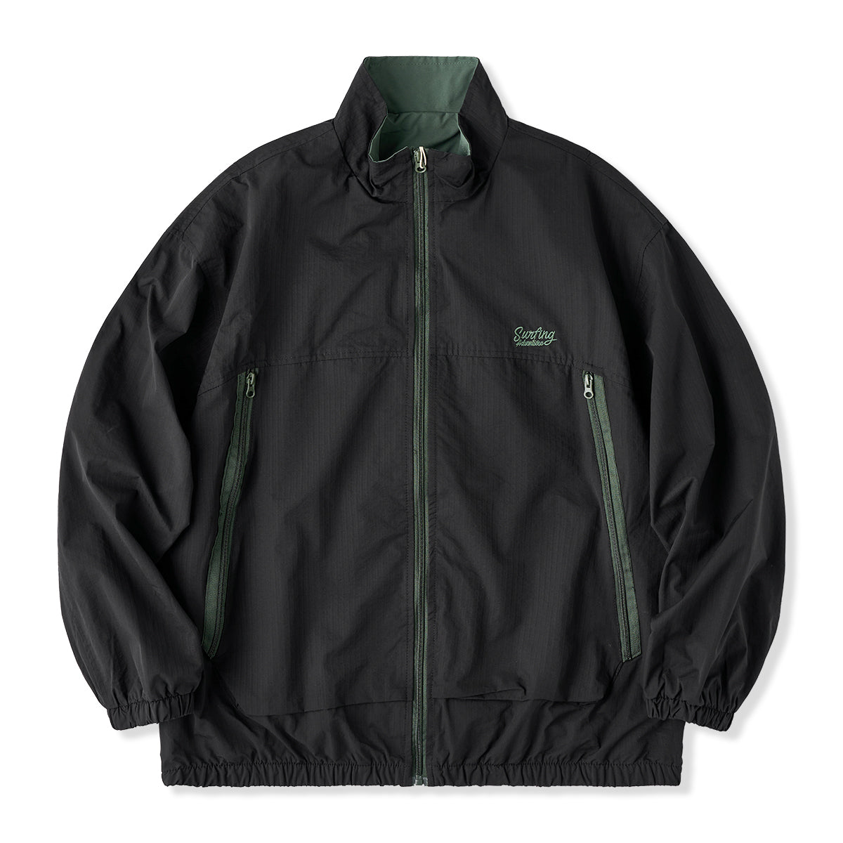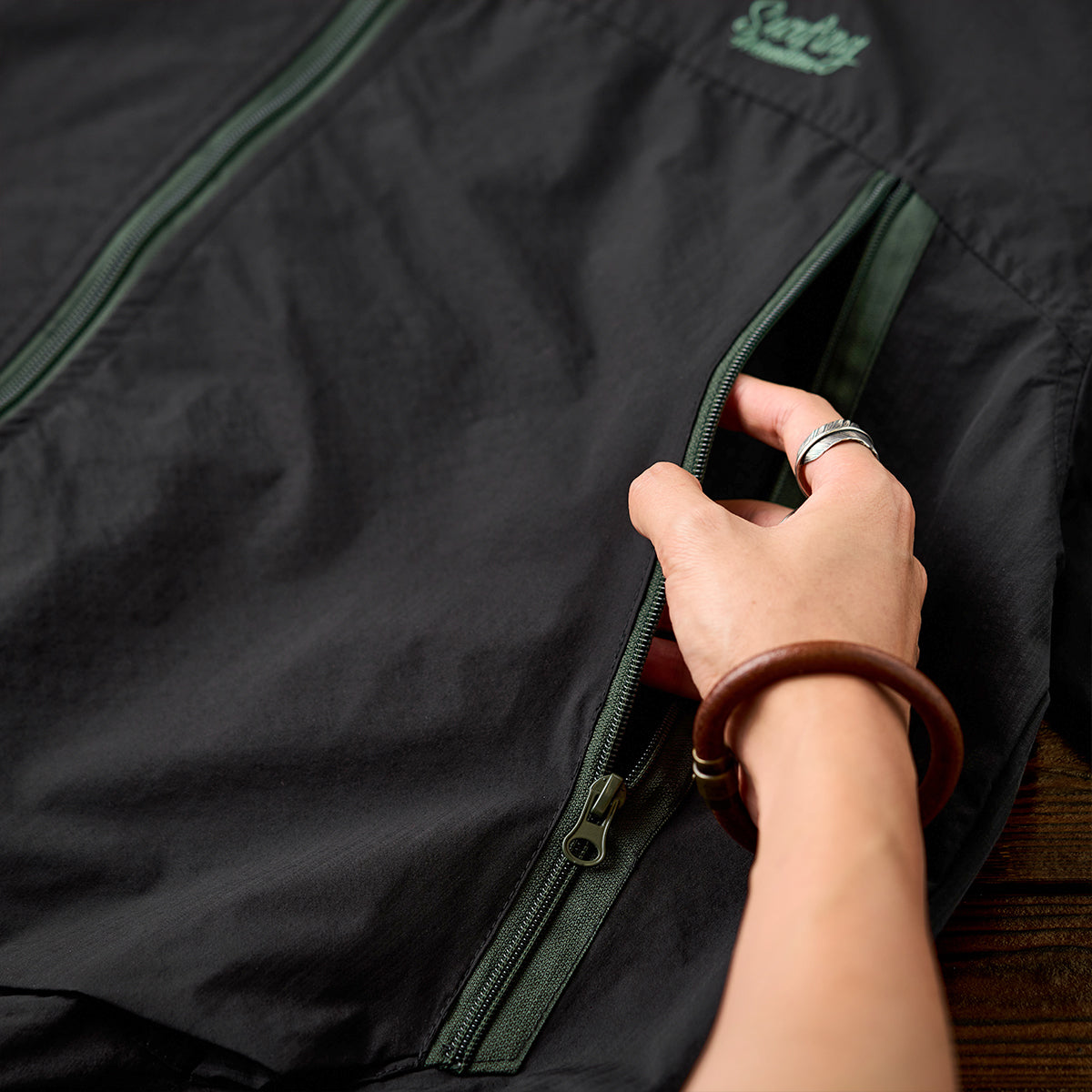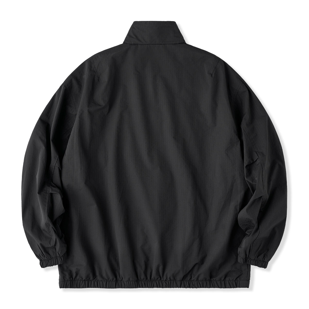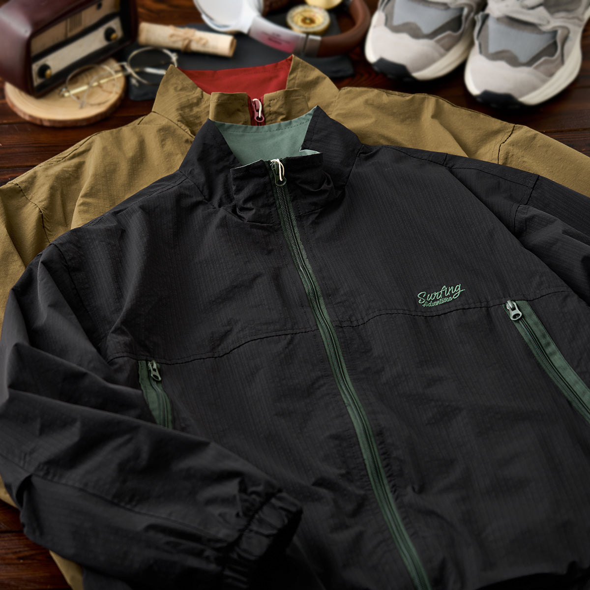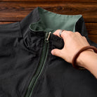 襟が立ち上がったスタンドカラー仕様、風の侵入を防ぐ機能的なデザインで、スポーティーかつモダンな印象を与えます。袖口と裾にゴムが入って、フィット感を調整しやすく、防風性を高める役割があります。