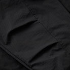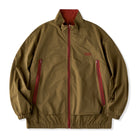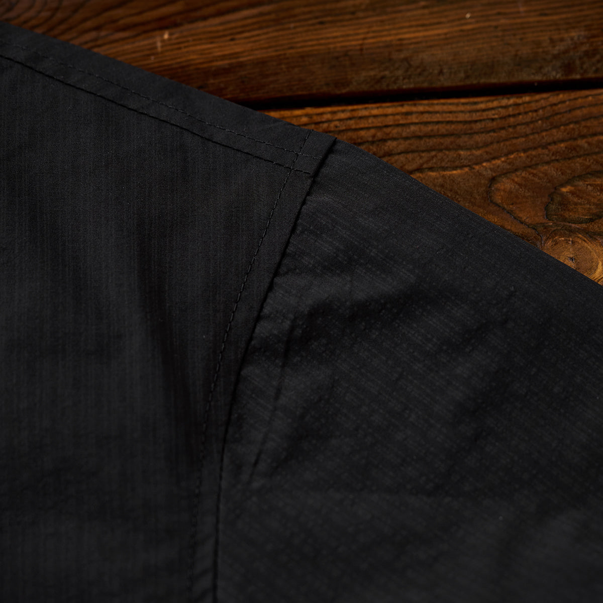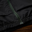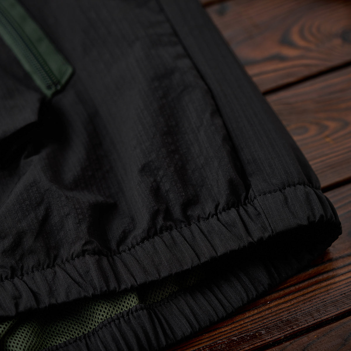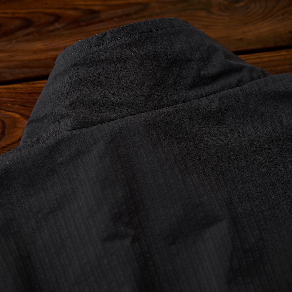 襟が立ち上がったスタンドカラー仕様、風の侵入を防ぐ機能的なデザインで、スポーティーかつモダンな印象を与えます。袖口と裾にゴムが入って、フィット感を調整しやすく、防風性を高める役割があります。