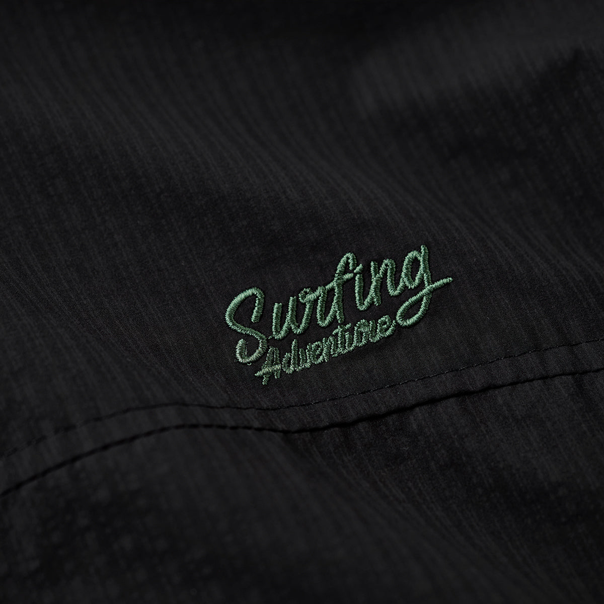 左胸に「Surfing」という刺繍が施されて、フォントは手書き風のカジュアルなデザインで、スポーツやアウトドアテイストを強調しています。