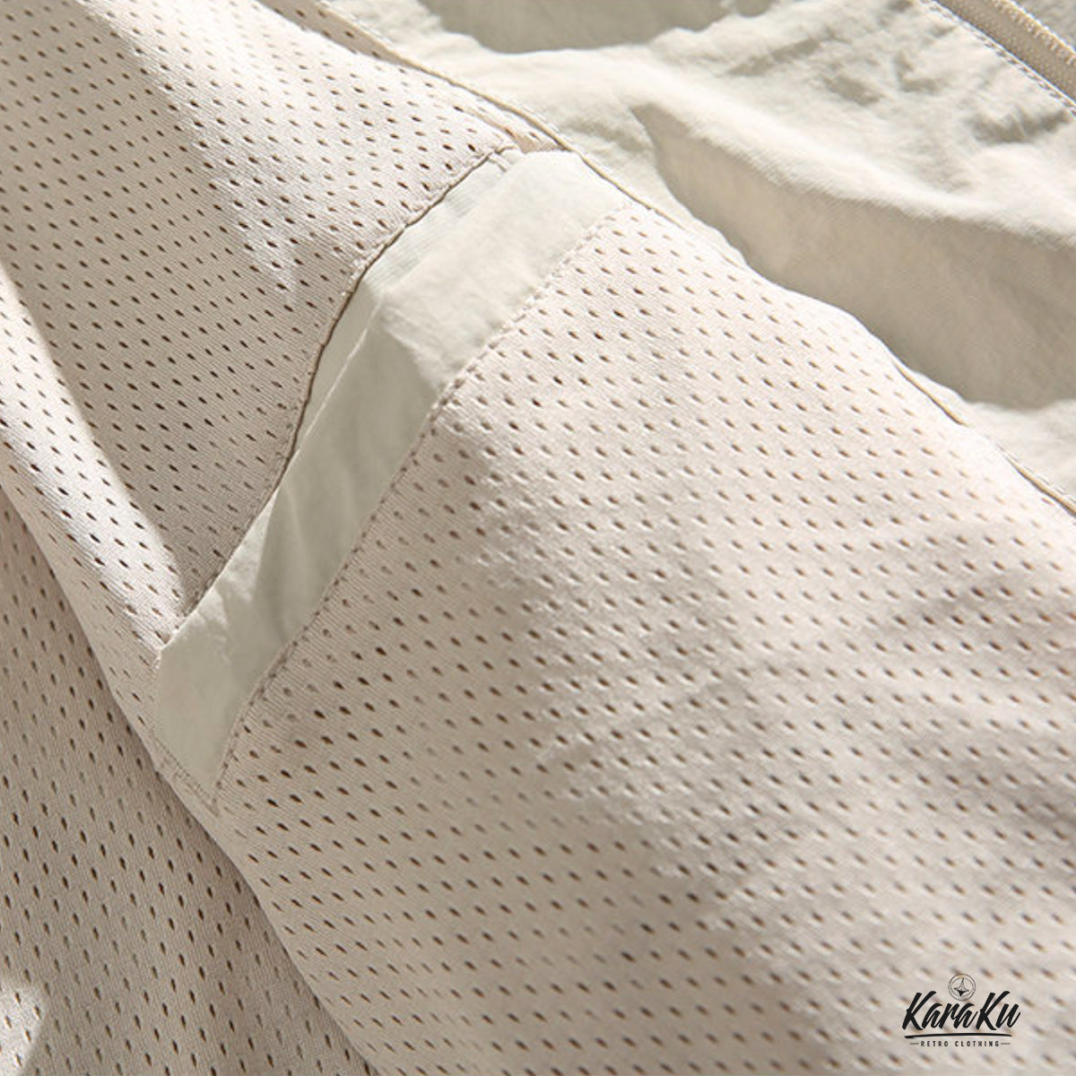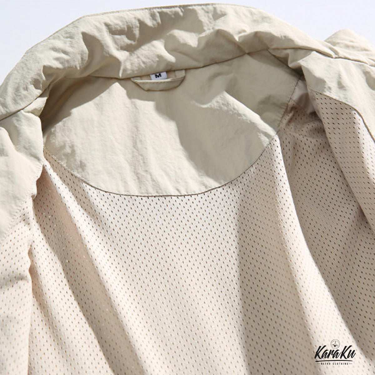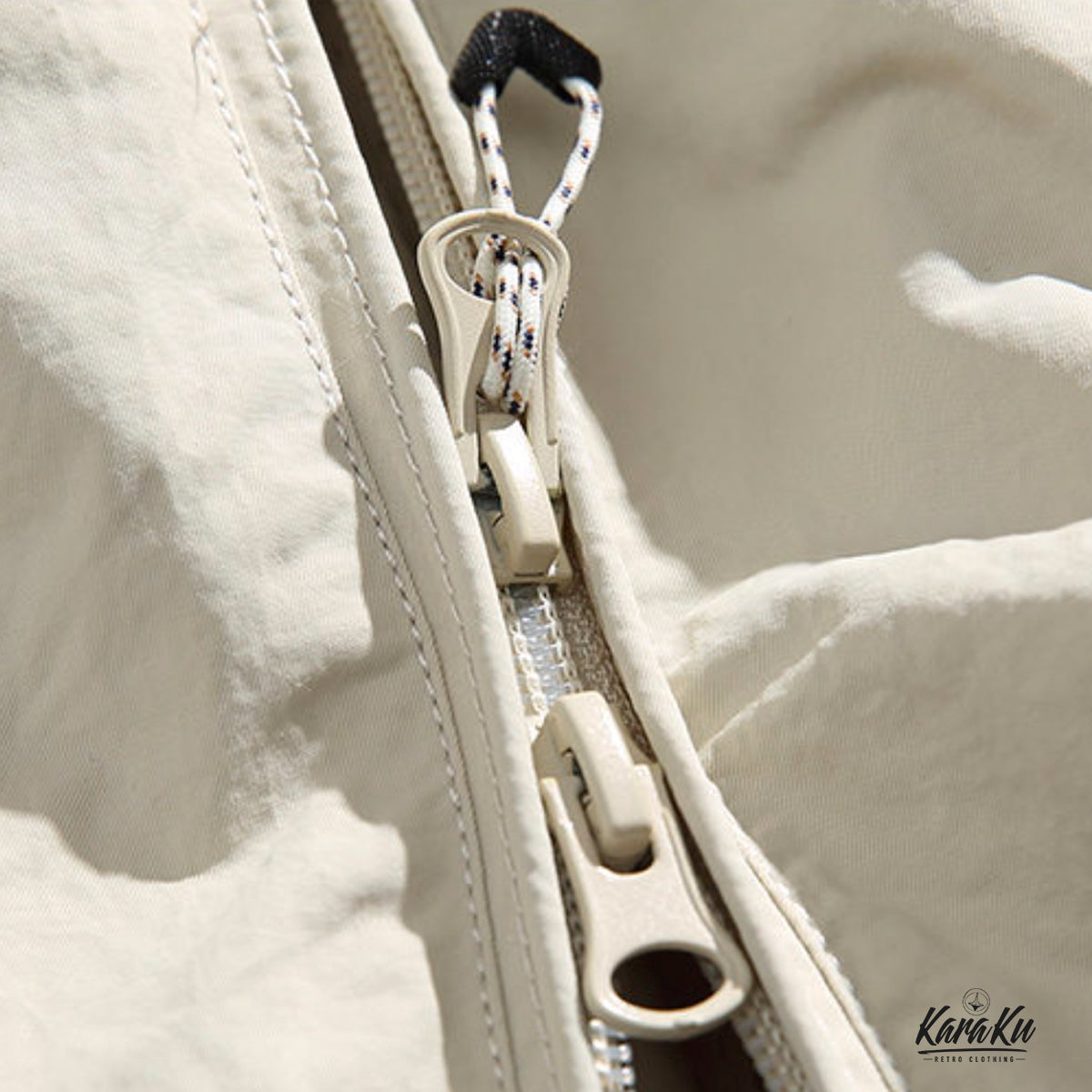 ダブルジップを配置され、上下どちらからでも開けられるため、通気性を調整したり、動きを自由にしたりできる。
