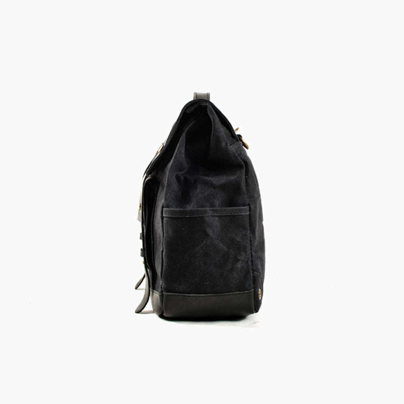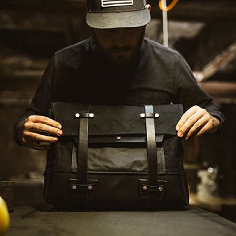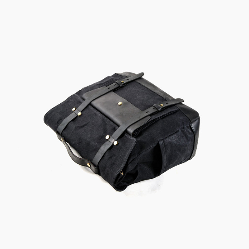 上質なキャンバスとレザーを使用,革の部分は牛革製でとても柔らかく、バッグの中は仕切りのない大きなスペースで、、書類やPC等が収納できるスペースを完備しています。小物ポケット2つあります。表面にビッグフラップポケット1つ、両サイドにドリンクポケット1つずつの構成です。旅行用としても、オートバイバッグとしても、自転車サドルバッグとしても使えて、多様なシーンで活躍できるマルチなバッグです。
