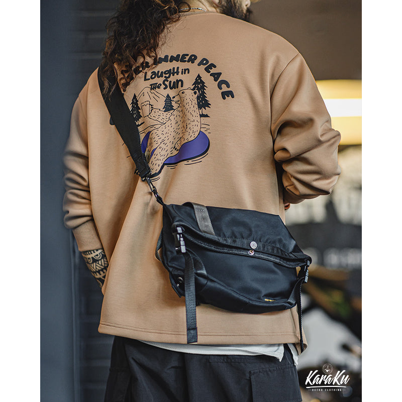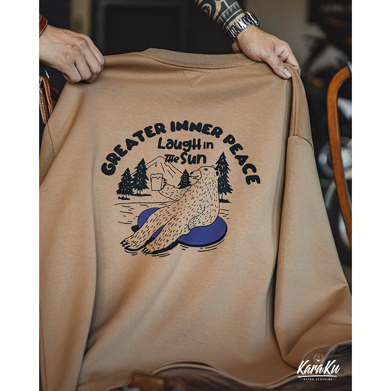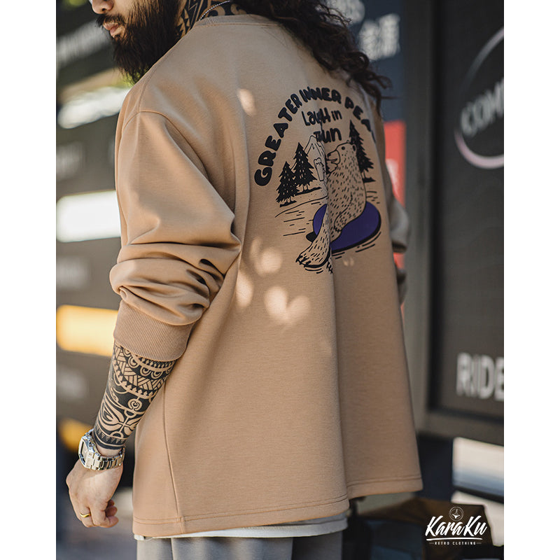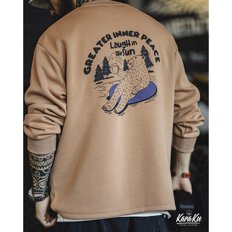 バックにクマが森林浴をしながらリラックスしている様子は、着用者に「自然の中で心を休めよう」というメッセージを伝えている。
