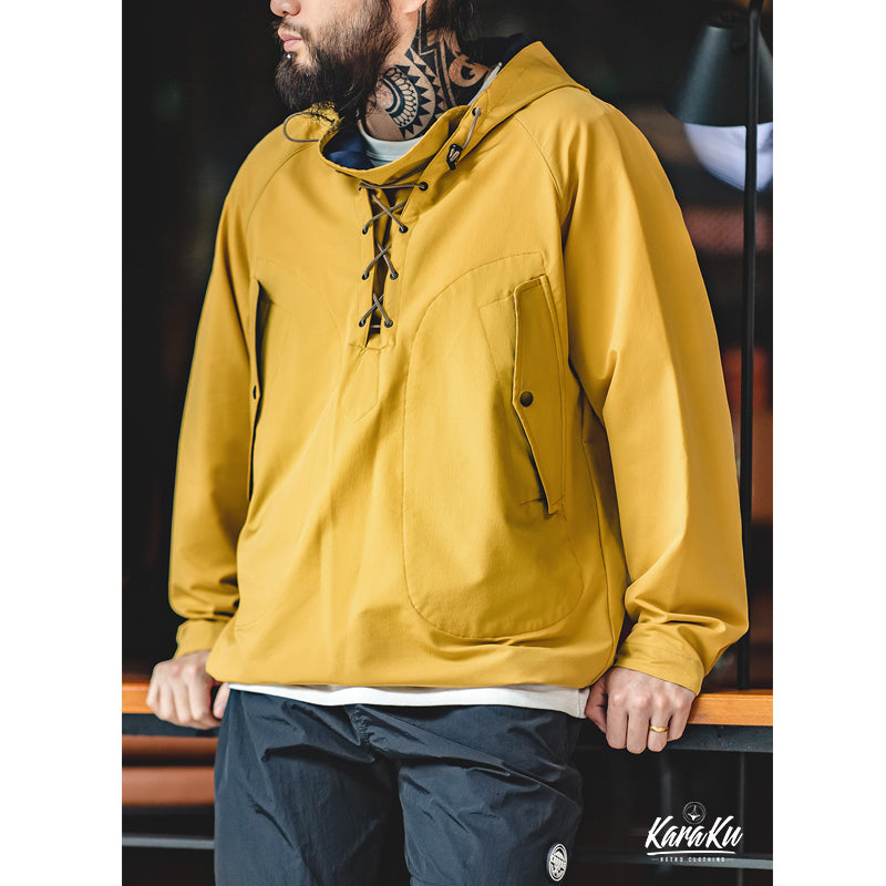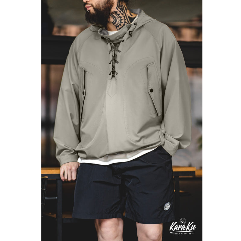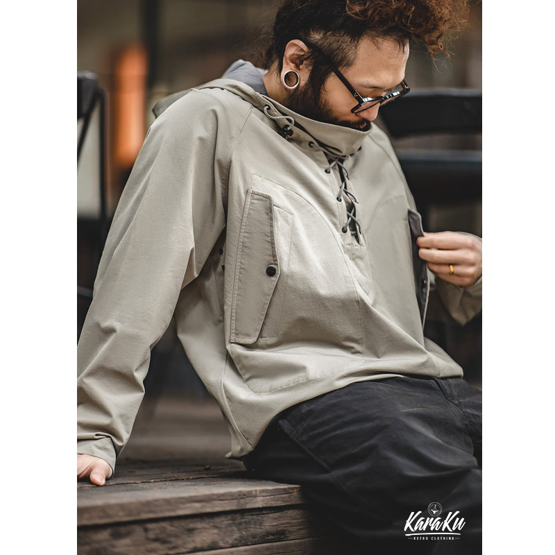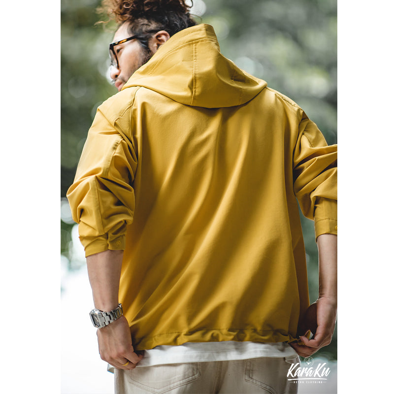 フロントに斜め対称ポケット付き、収納機能がありますので持ち運びやすい。袖口はボタンつけ、風の強い日などに風の侵入を防ぎます。