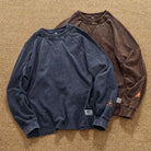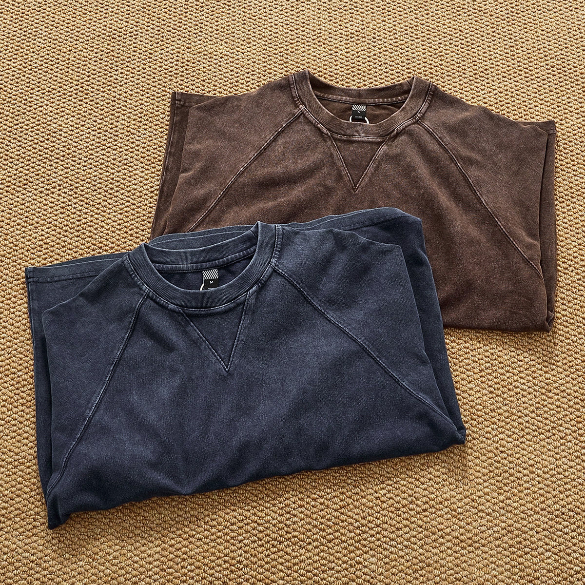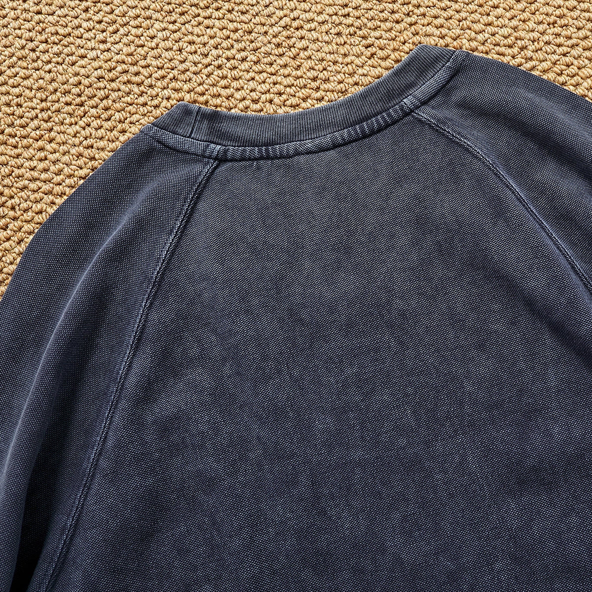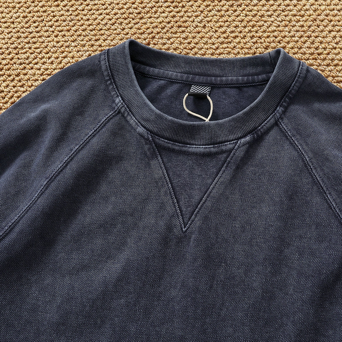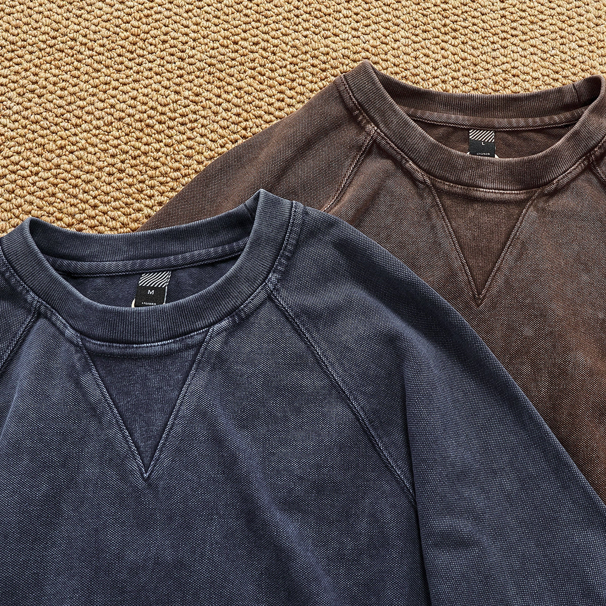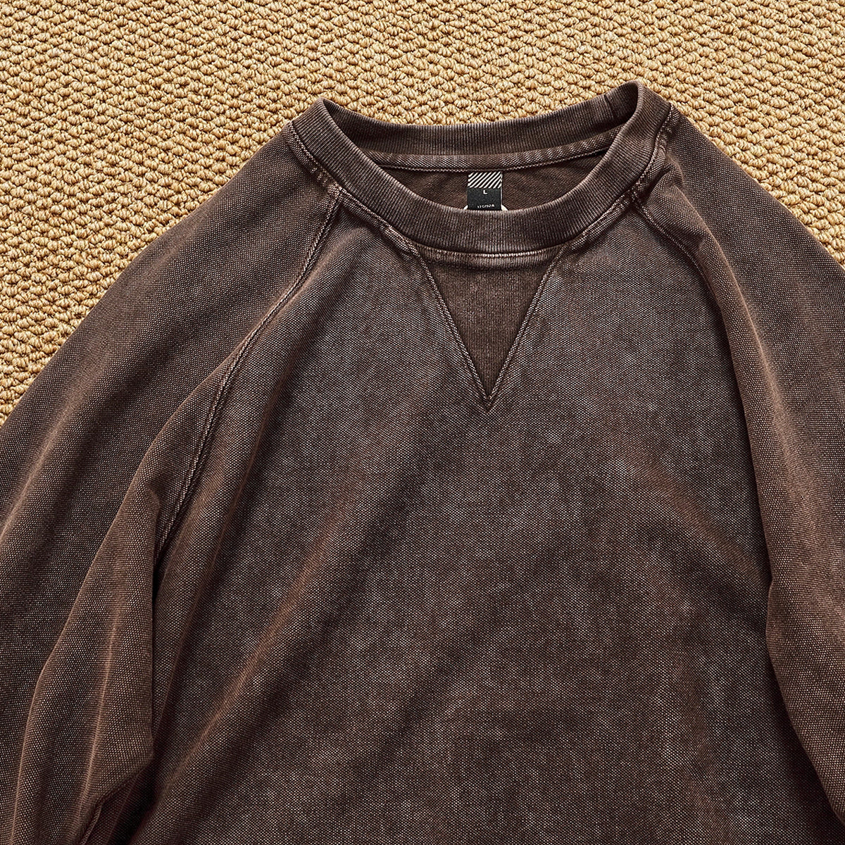 ラグランスリーブのデザインが特徴的で、肩周りに縫い目がないため動きやすさが重視されています。首元のVガゼットは、クラシックなスウェットシャツのデザインを踏襲して、アクセントになっています。