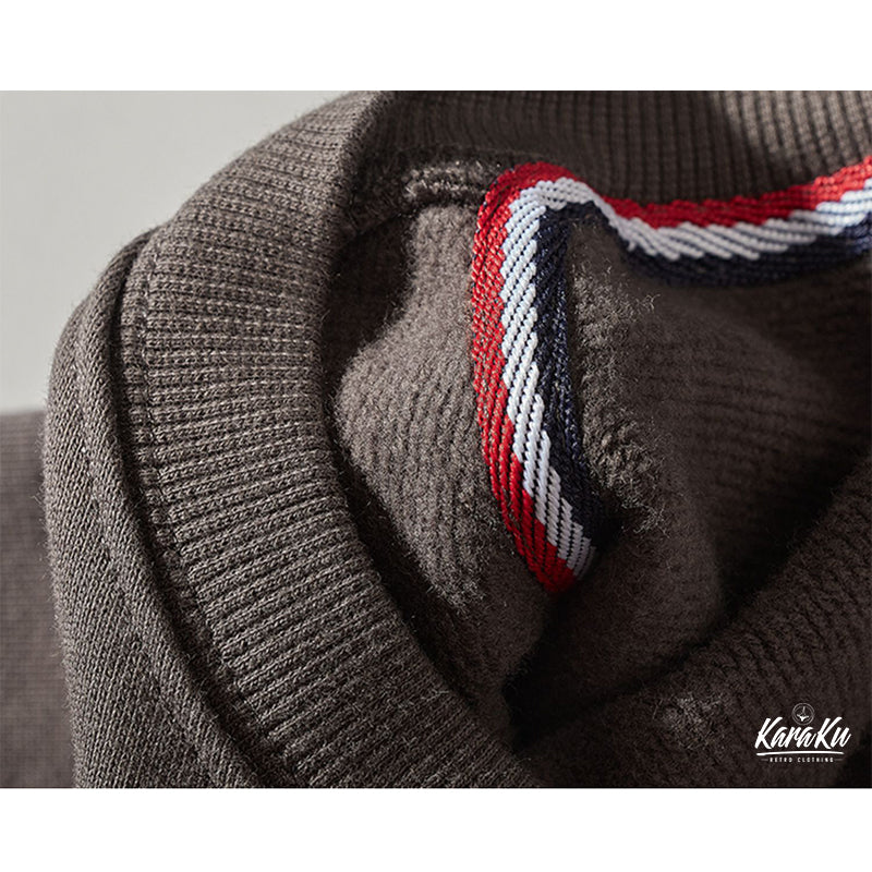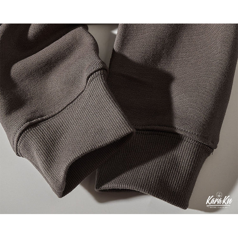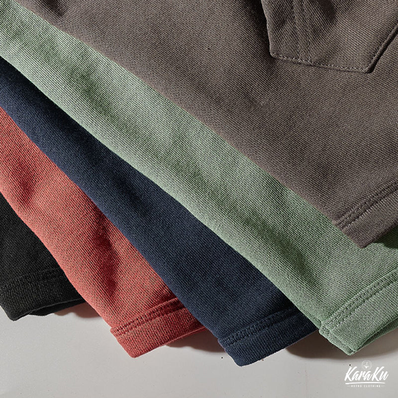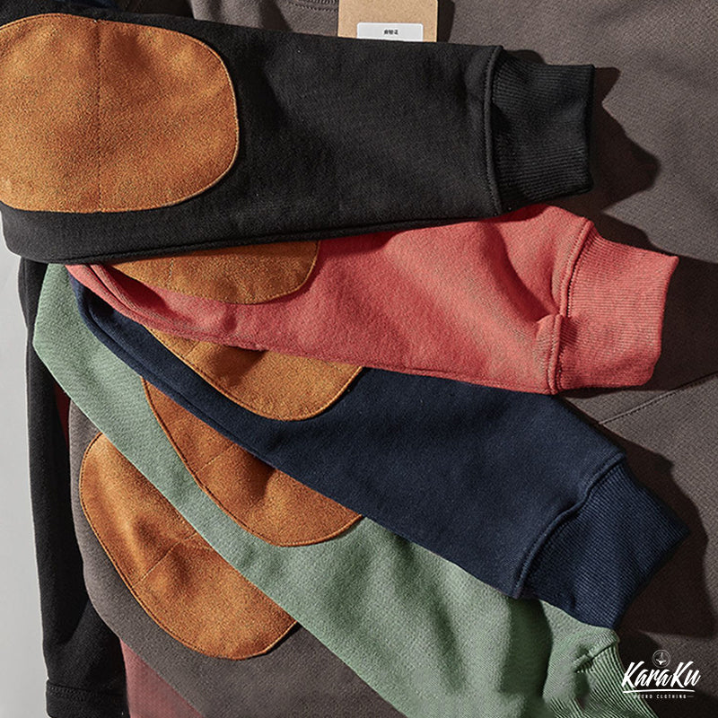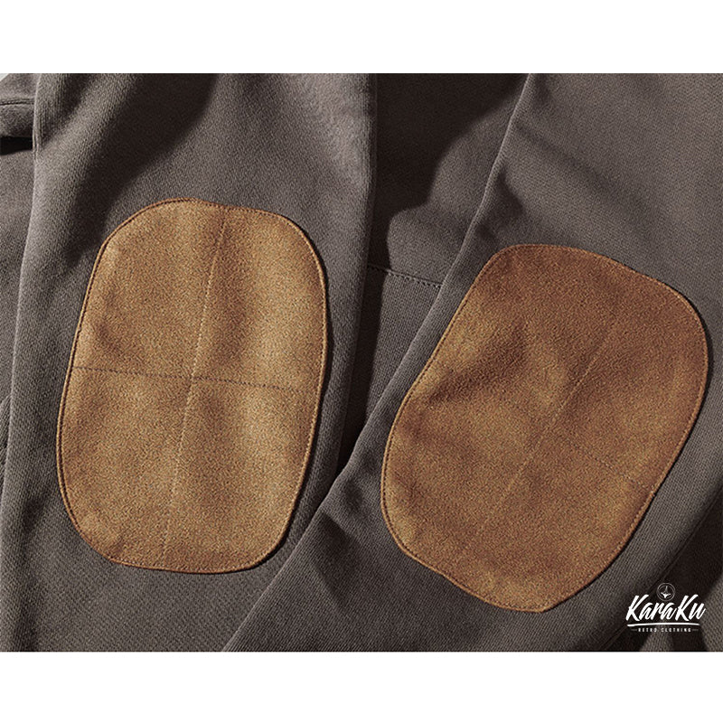 本アイテムは襟・袖口・裾下にリブとダブルステッチを施した、腕が上がりやすく、動かしやすいため、スポーツウェアによく見られる形状でもあり、丈夫さとリラックス感を兼ね備えた。フロントにカンガルーポケット付きでさり気ないアクセントに。肘の部分にスエード素材が切り替えて、ジャケットの表面に異なるテクスチャーが生まれ、視覚的なアクセントが加わる。ゆったりとしたシルエットで、動きやすいゆとりがあります。機能性も兼ね備えたデザイン性も優れた一着です。
