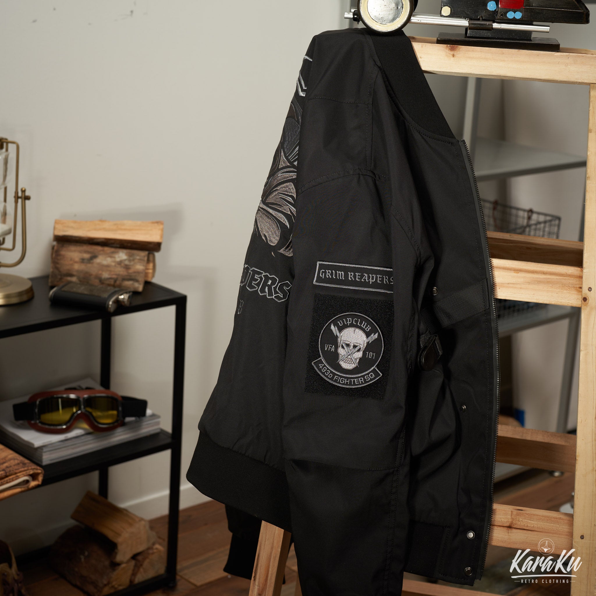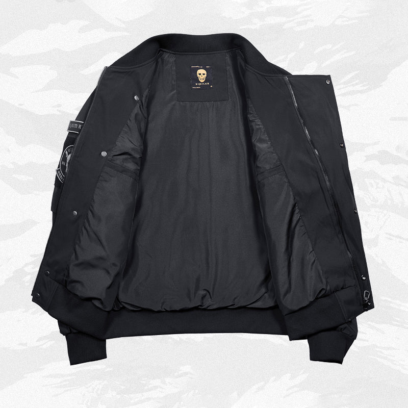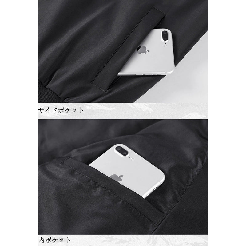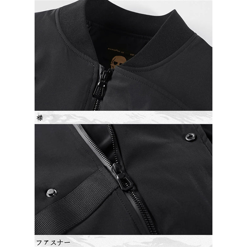 耐久性・防風性の抜群の生地を使用、中間気候に着やすいように中綿を抜いたライトMA-1の仕様になっています。