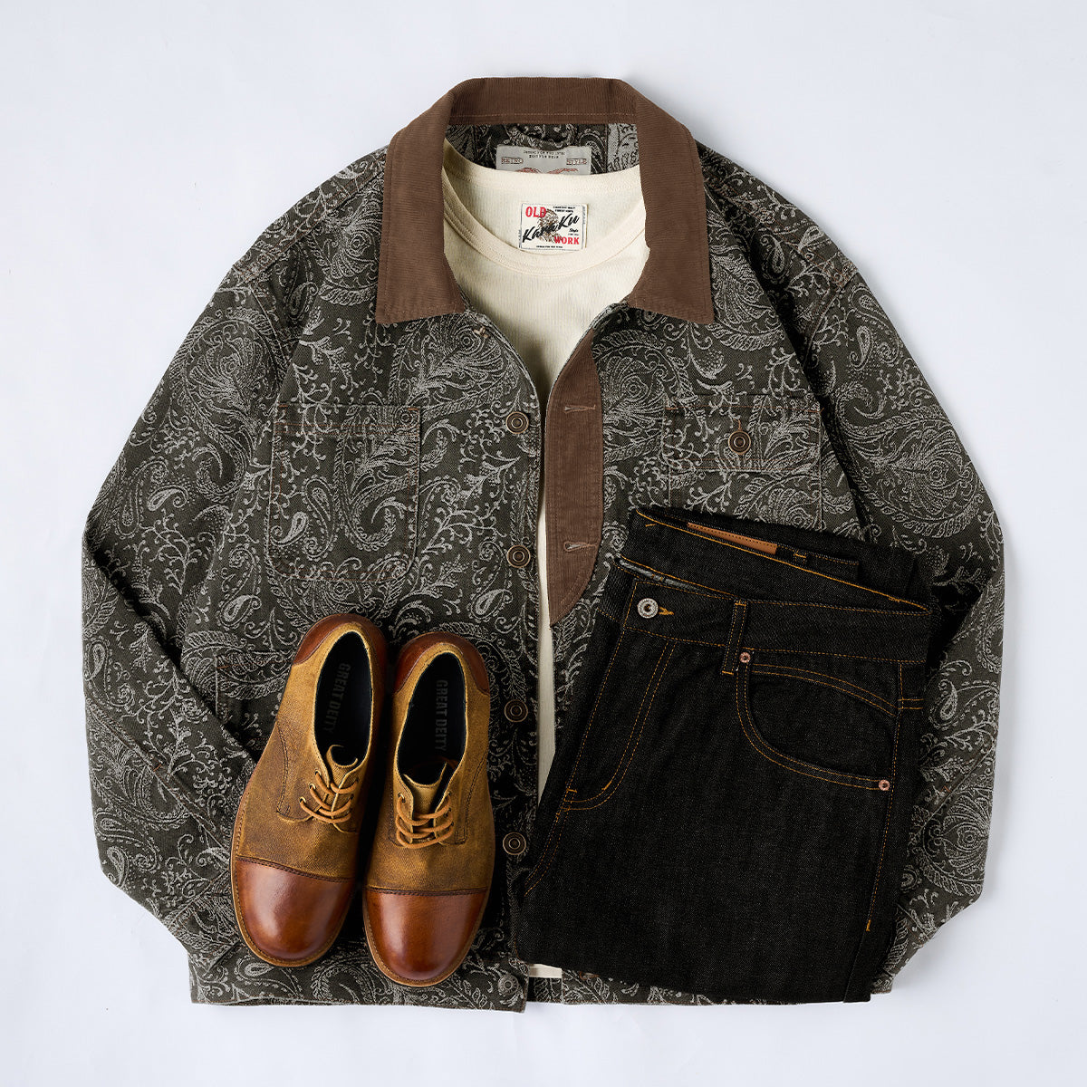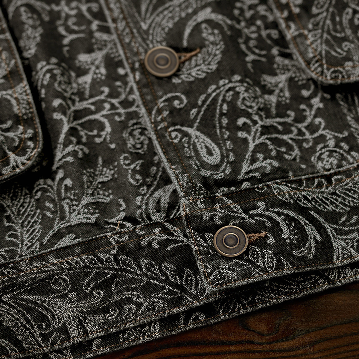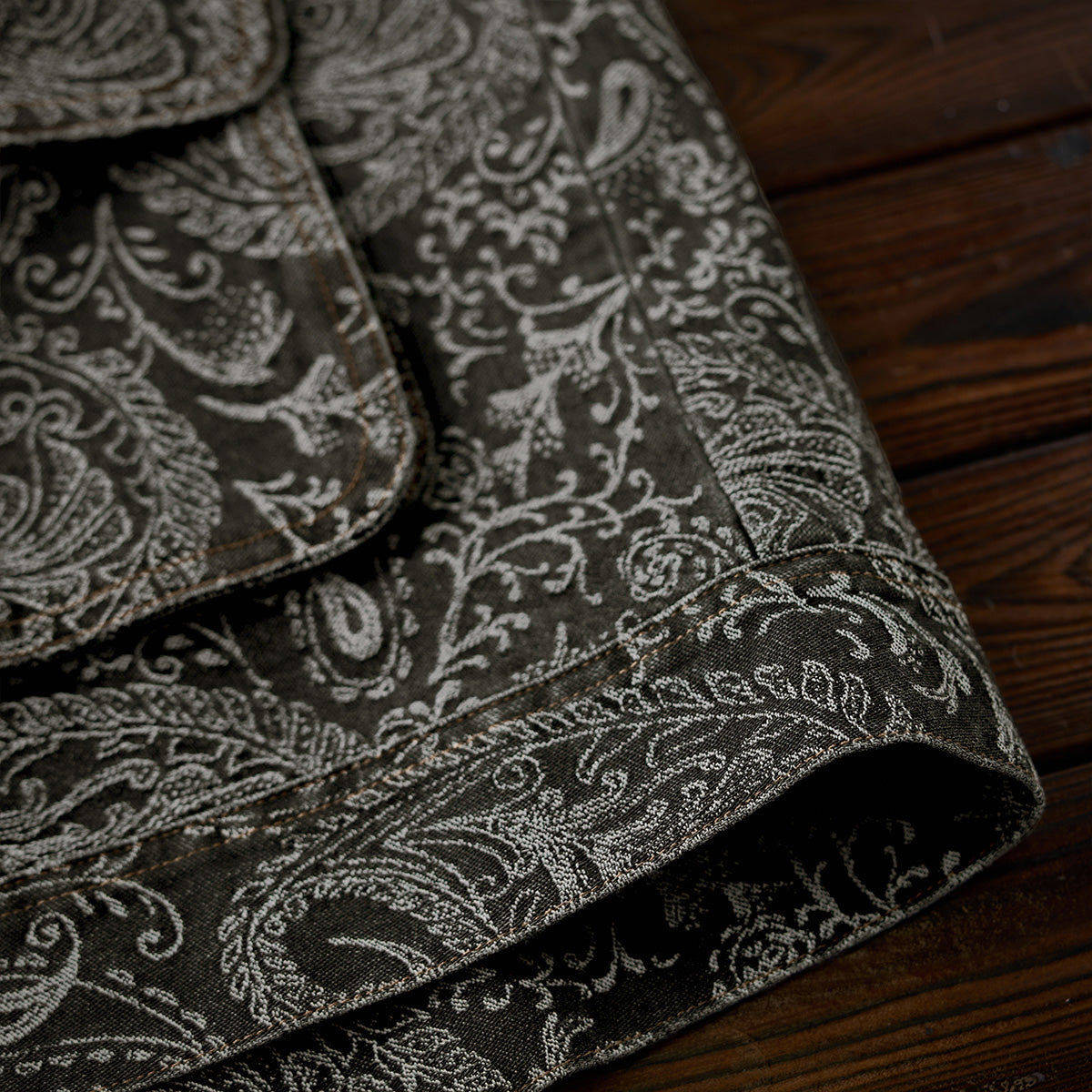 クラシカルな素材使いと存在感のある柄表現が融合した、主役級のデニムジャケットです。身頃には、ペイズリー柄をジャカード織りで表現したデニム素材を採用。プリントでは出せない立体感と奥行きがあり、角度や光によって表情が変わる、上質で味わい深い仕上がりです。襟元には畝の立ったコーデュロイ素材を切り替え、ワークウェア由来の無骨さに、温かみと品の良さをプラスしました。程よくゆとりのあるシルエットで、インナーを選ばずレイヤードしやすく、秋冬から春先まで長く活躍。