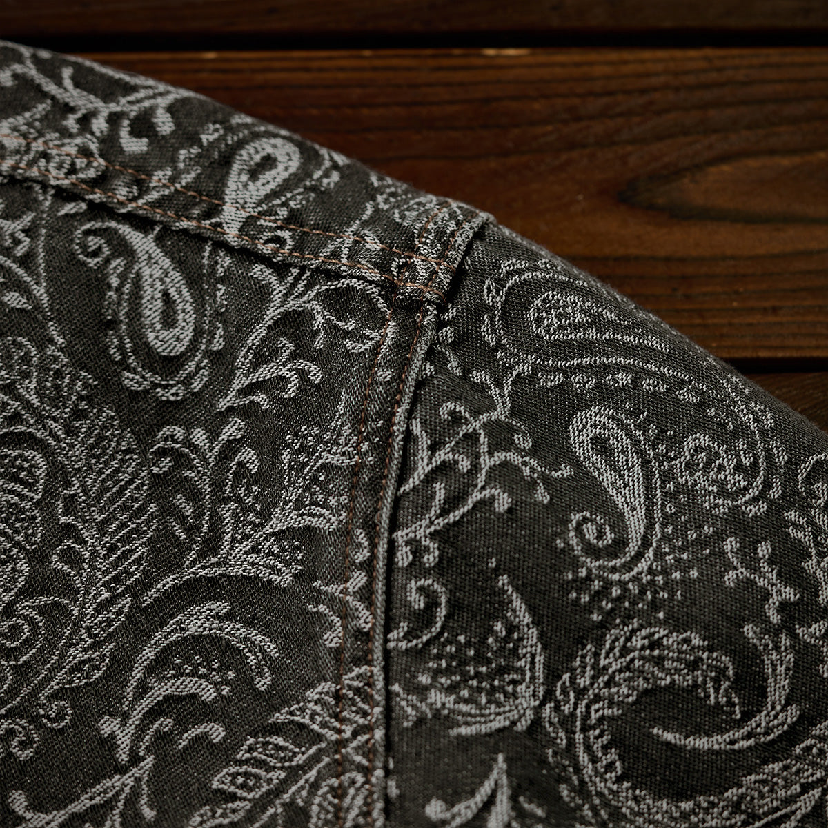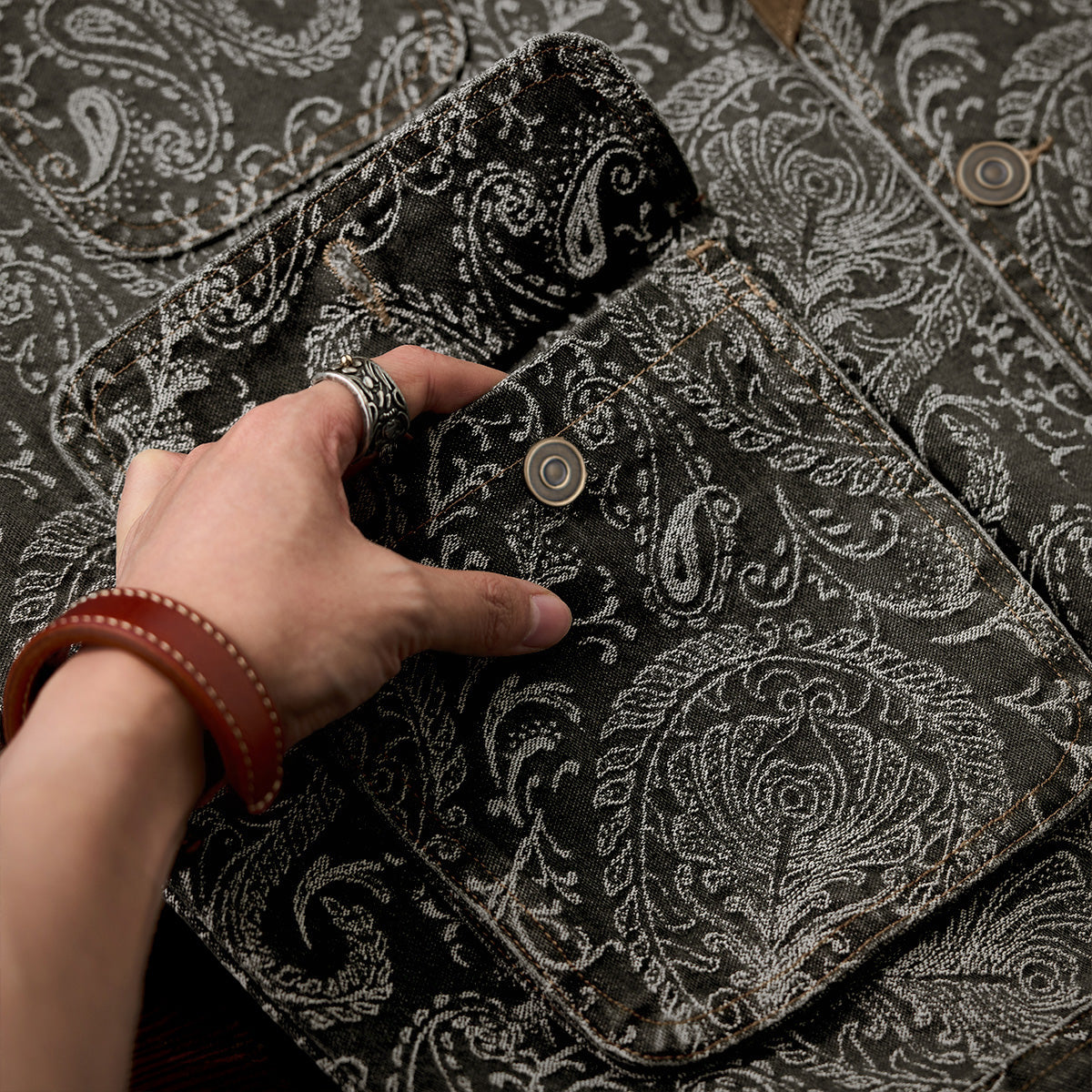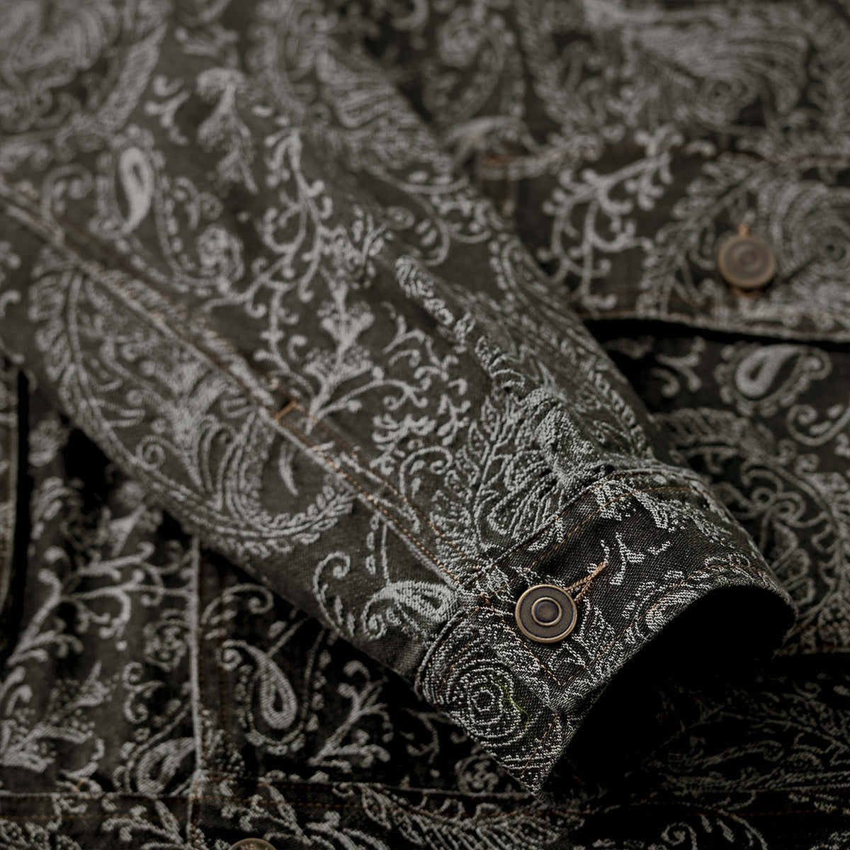 クラシカルな素材使いと存在感のある柄表現が融合した、主役級のデニムジャケットです。身頃には、ペイズリー柄をジャカード織りで表現したデニム素材を採用。プリントでは出せない立体感と奥行きがあり、角度や光によって表情が変わる、上質で味わい深い仕上がりです。襟元には畝の立ったコーデュロイ素材を切り替え、ワークウェア由来の無骨さに、温かみと品の良さをプラスしました。程よくゆとりのあるシルエットで、インナーを選ばずレイヤードしやすく、秋冬から春先まで長く活躍。