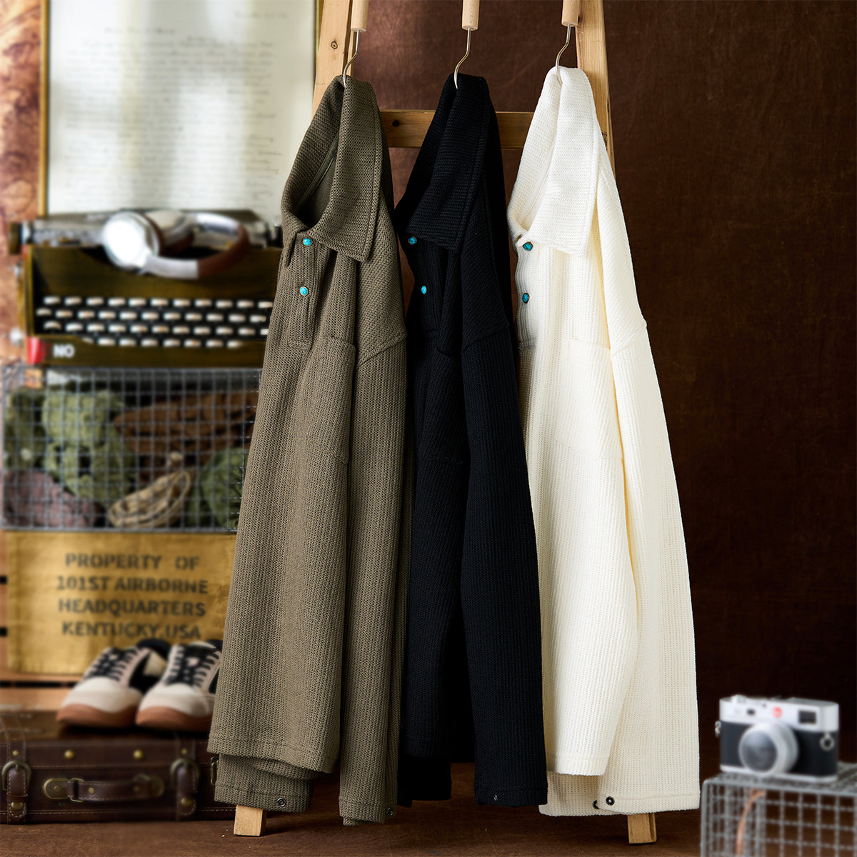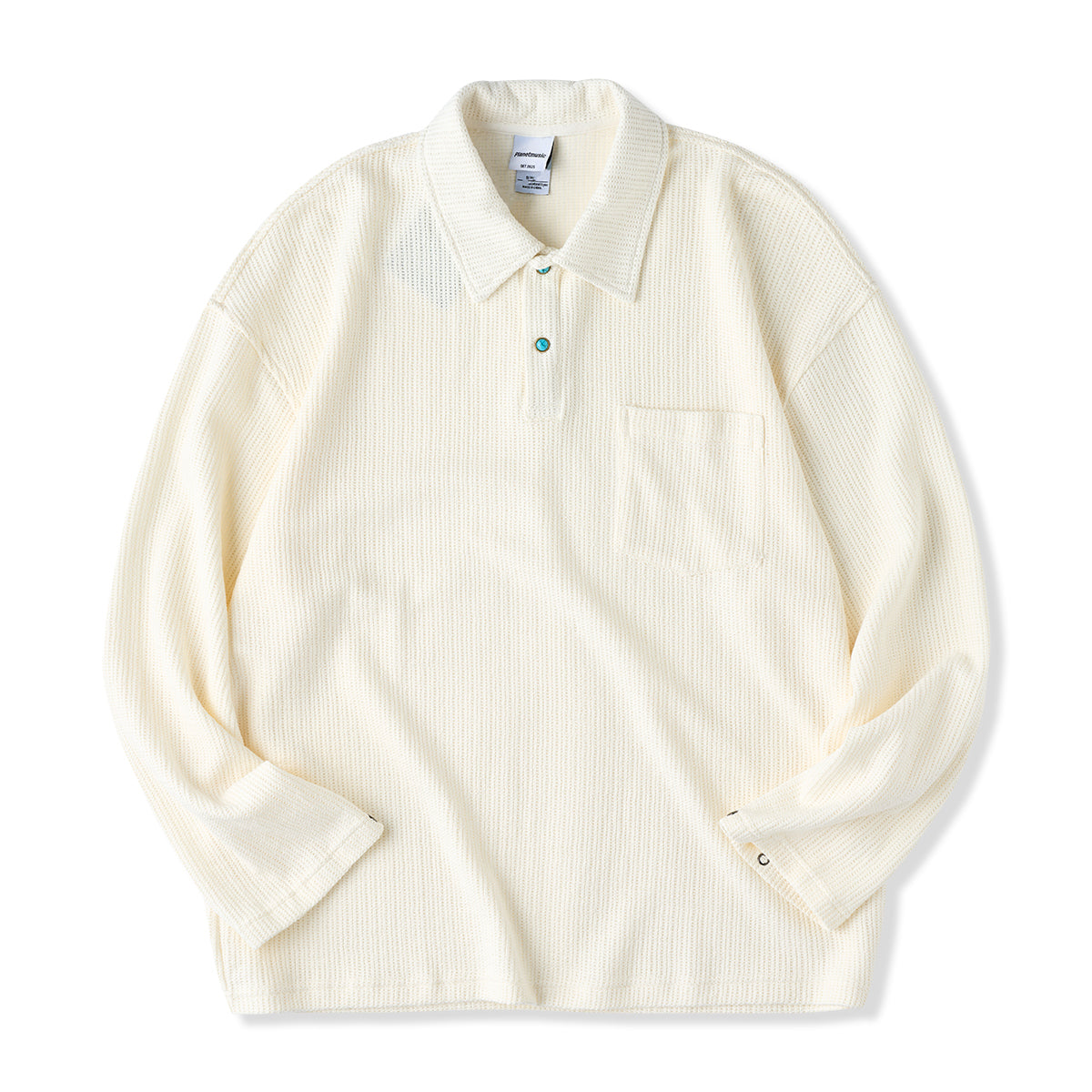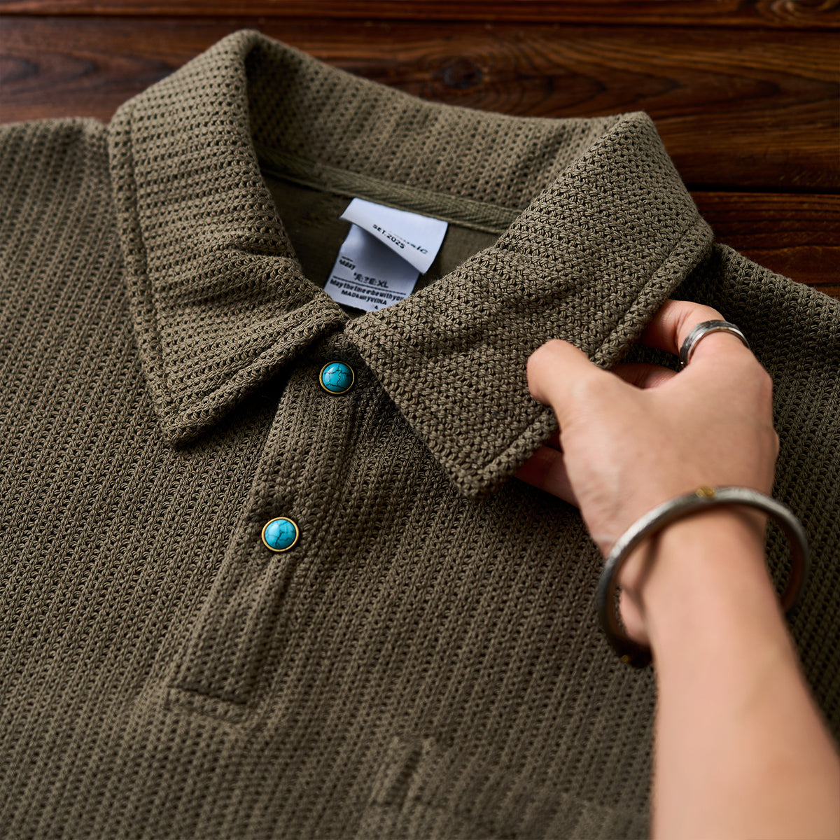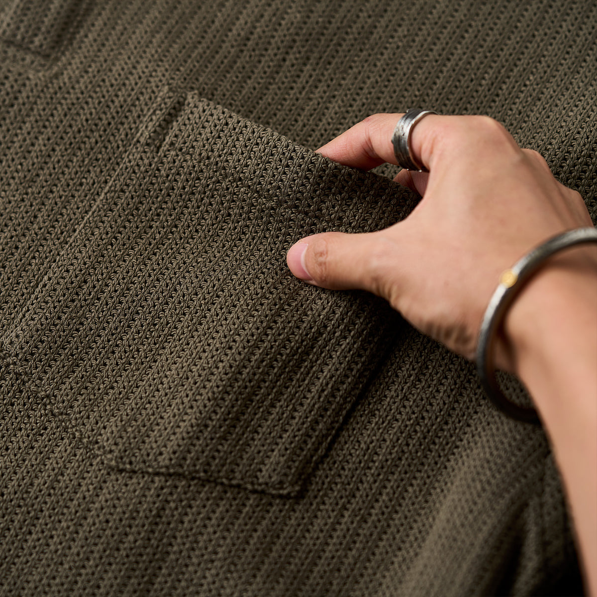 ニットのような立体感ある編み地を再現したポロシャツ。上品さとリラックス感を兼ね備え、季節を問わずスタイリングを格上げしてくれます。前立てにはターコイズ調ボタンを2つ配し、胸元には実用的なポケットを備えることで、デザイン性と機能性を両立。ベーシックながらもさりげなく個性を主張する仕上がりです。3色展開で幅広い着こなしに対応でき、ジャケットのインナーとしても、一枚でさらりと着こなしても映える一着。柔らかな風合いと優れた通気性により、快適な着心地を長くお楽しみいただけます。