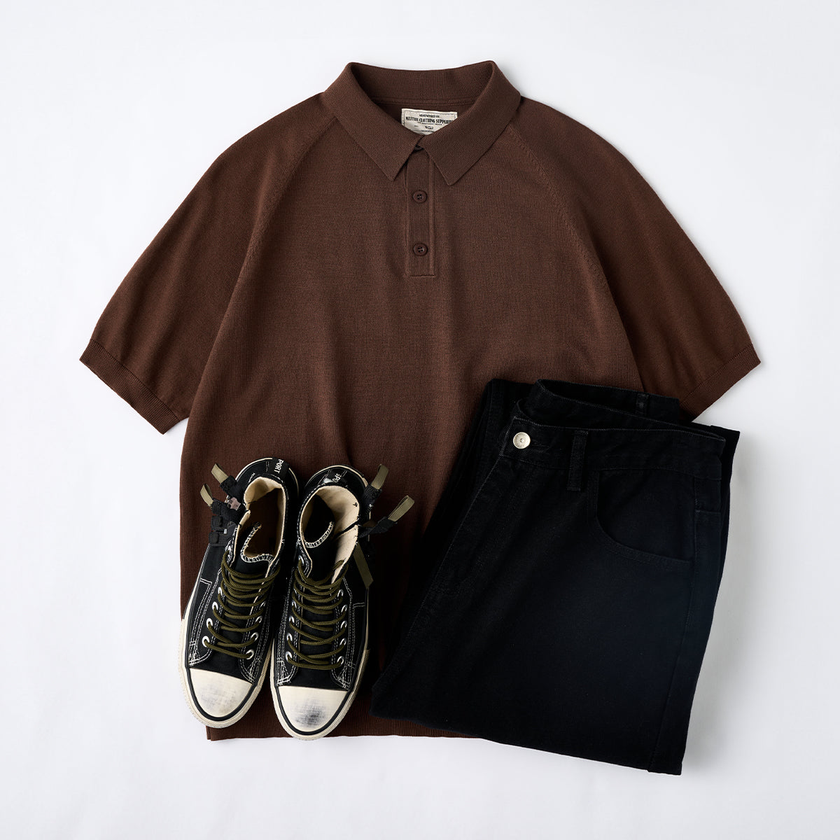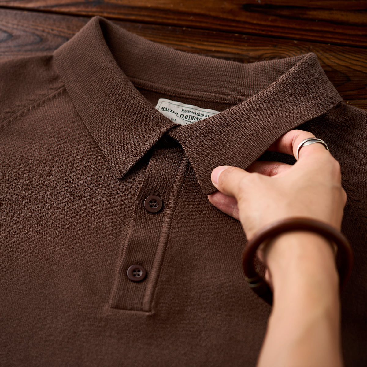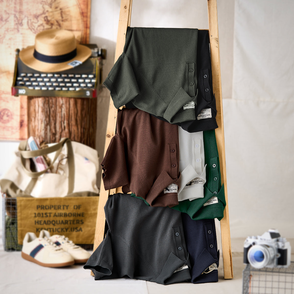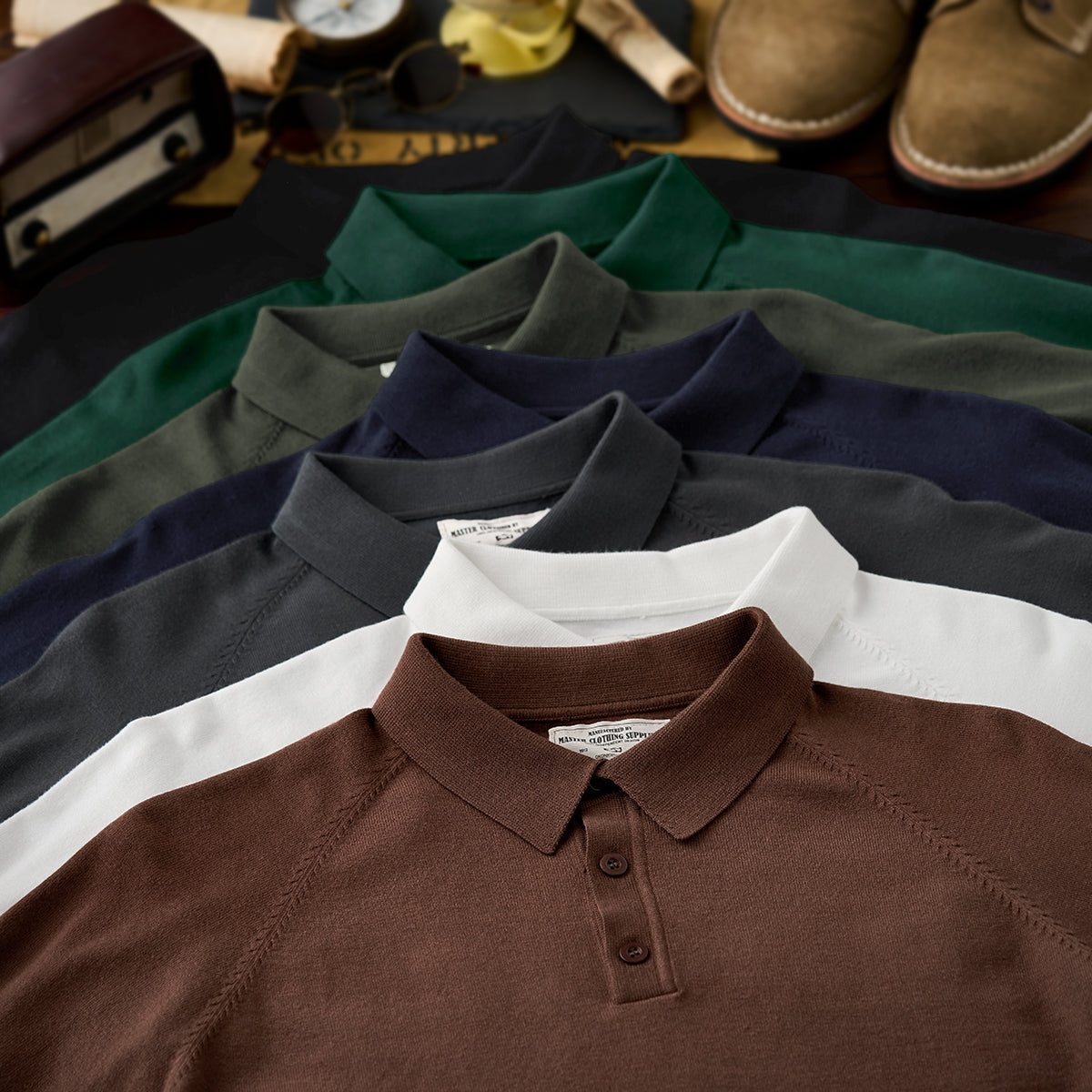 クラシックなポロシャツのスタイルを現代的にアレンジしたもので、カジュアルながらも上品な印象を与え。リブ編みの裾と袖口がデザインの一貫性を持たせ、全体のバランスを整えている。ラグランスリーブの袖のデザインで、肩と脇の下に縫い目がなく、袖が胴体にスムーズにつながっている。肩の動きを制限せずに快適なフィット感を提供。複数のカラーバリエーションがあり、7色が展開されて、落ち着いた色合いが多く、どの色もコーディネートしやすい。