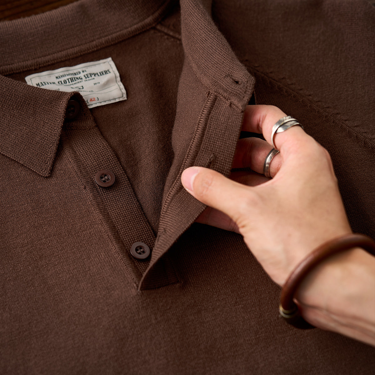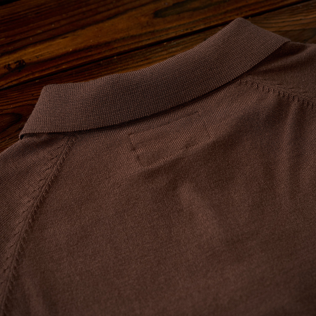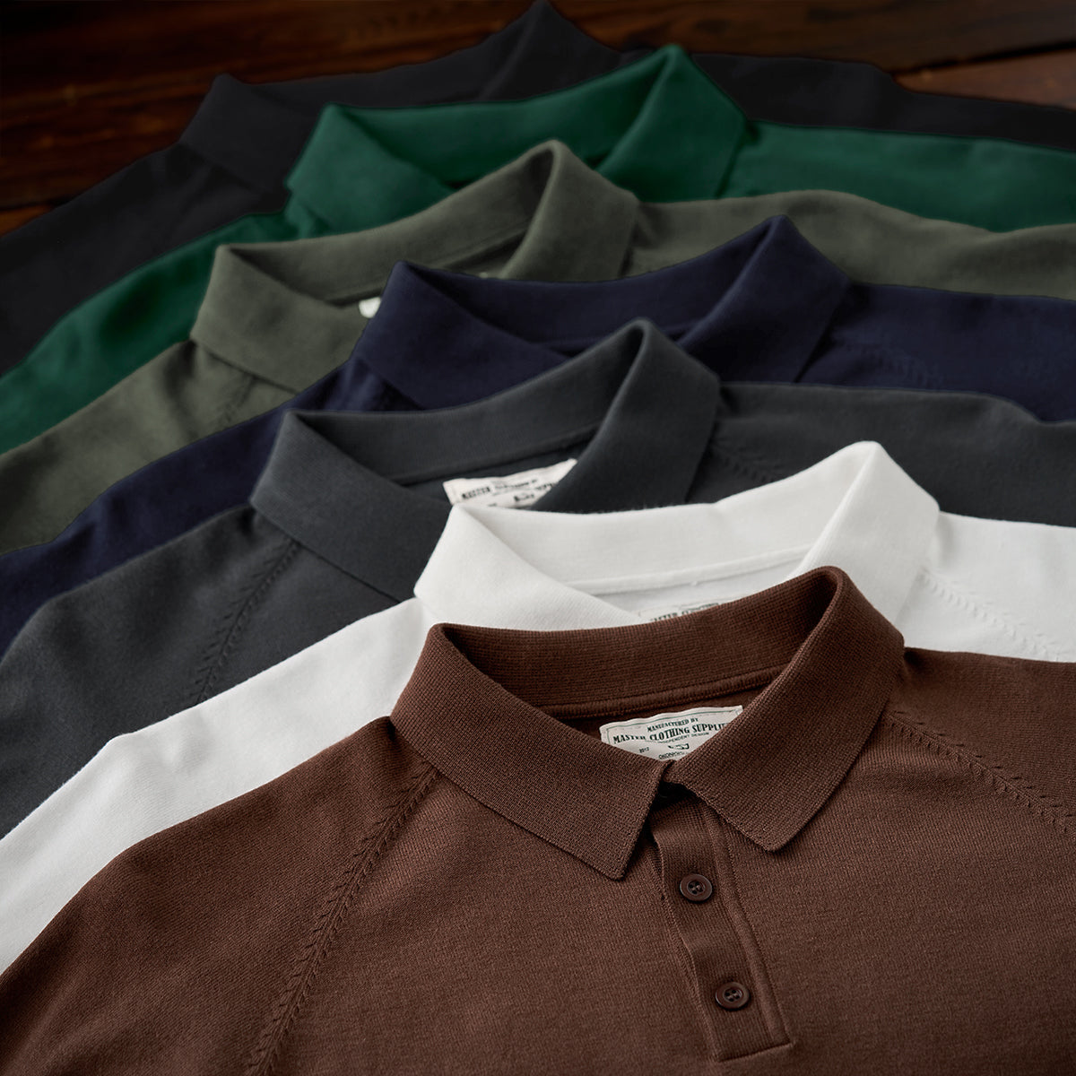 クラシックなポロシャツのスタイルを現代的にアレンジしたもので、カジュアルながらも上品な印象を与え。リブ編みの裾と袖口がデザインの一貫性を持たせ、全体のバランスを整えている。ラグランスリーブの袖のデザインで、肩と脇の下に縫い目がなく、袖が胴体にスムーズにつながっている。肩の動きを制限せずに快適なフィット感を提供。複数のカラーバリエーションがあり、7色が展開されて、落ち着いた色合いが多く、どの色もコーディネートしやすい。
