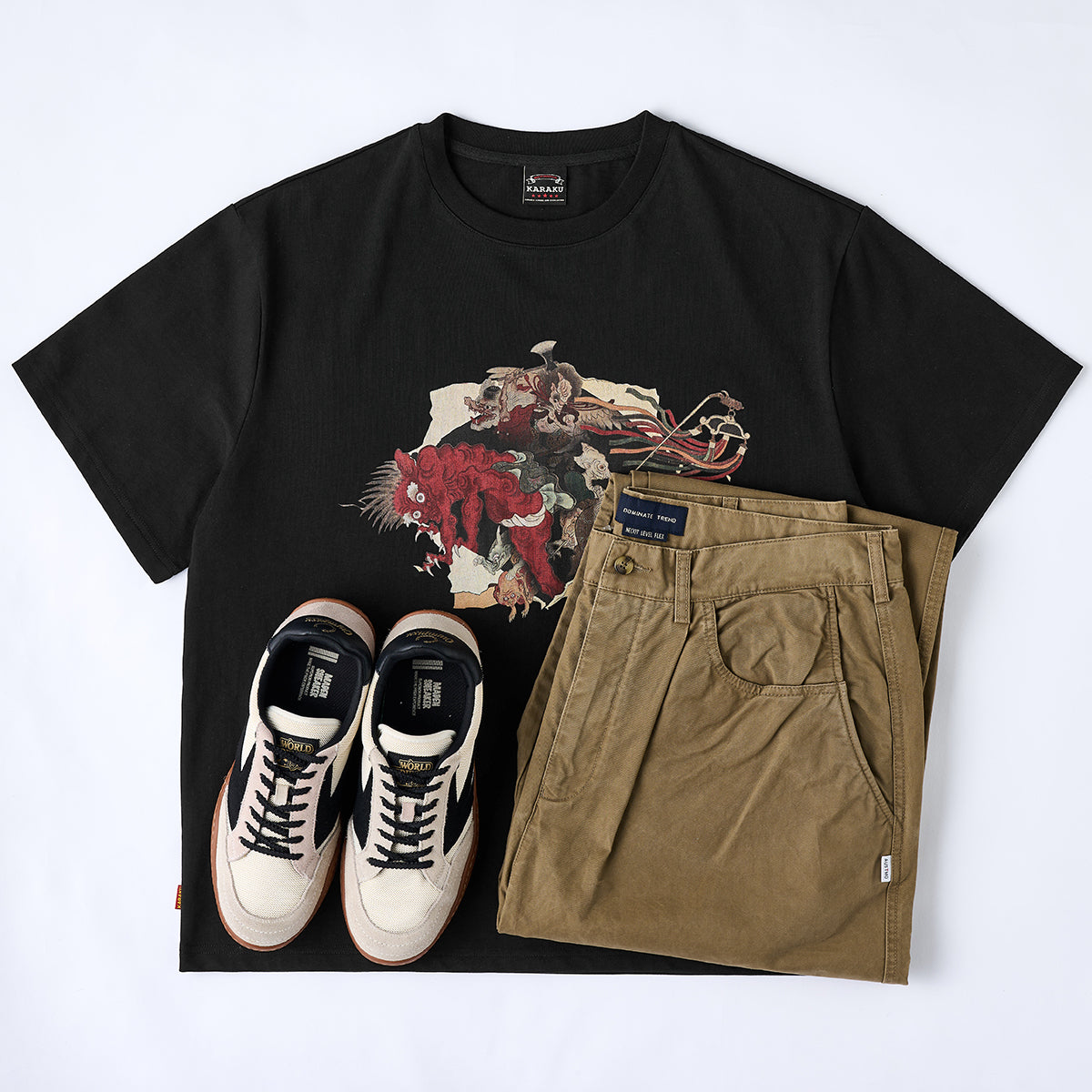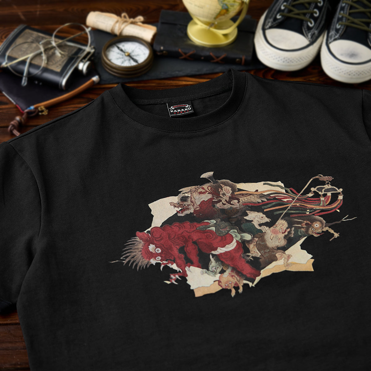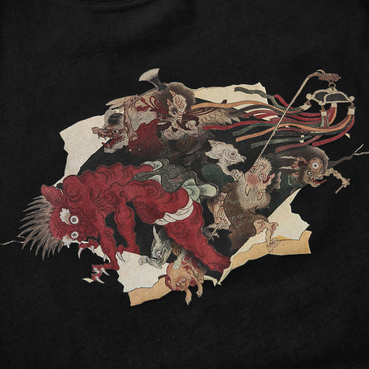 「妖怪絵巻」をモチーフにしており、日本の室町時代や江戸時代に広く知られた妖怪文化に基づいています。妖怪たちが伝統的な絵巻物の境界を超えて現実世界に侵入してくるようなデザインです。破られた紙の裂け目は、静的な世界である絵巻と動的な世界である妖怪たちの対比を際立たせています。ブラック地はプリントの色彩を際立たせ、全体的に高級感を与えています。バックは無地で、前面のデザインを際立たせるミニマルな構成です。
